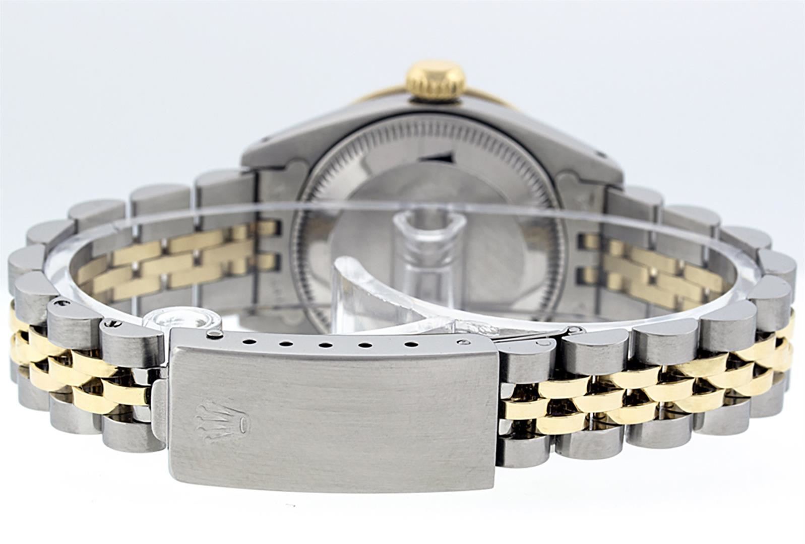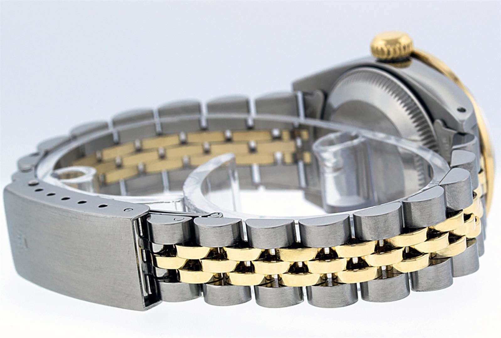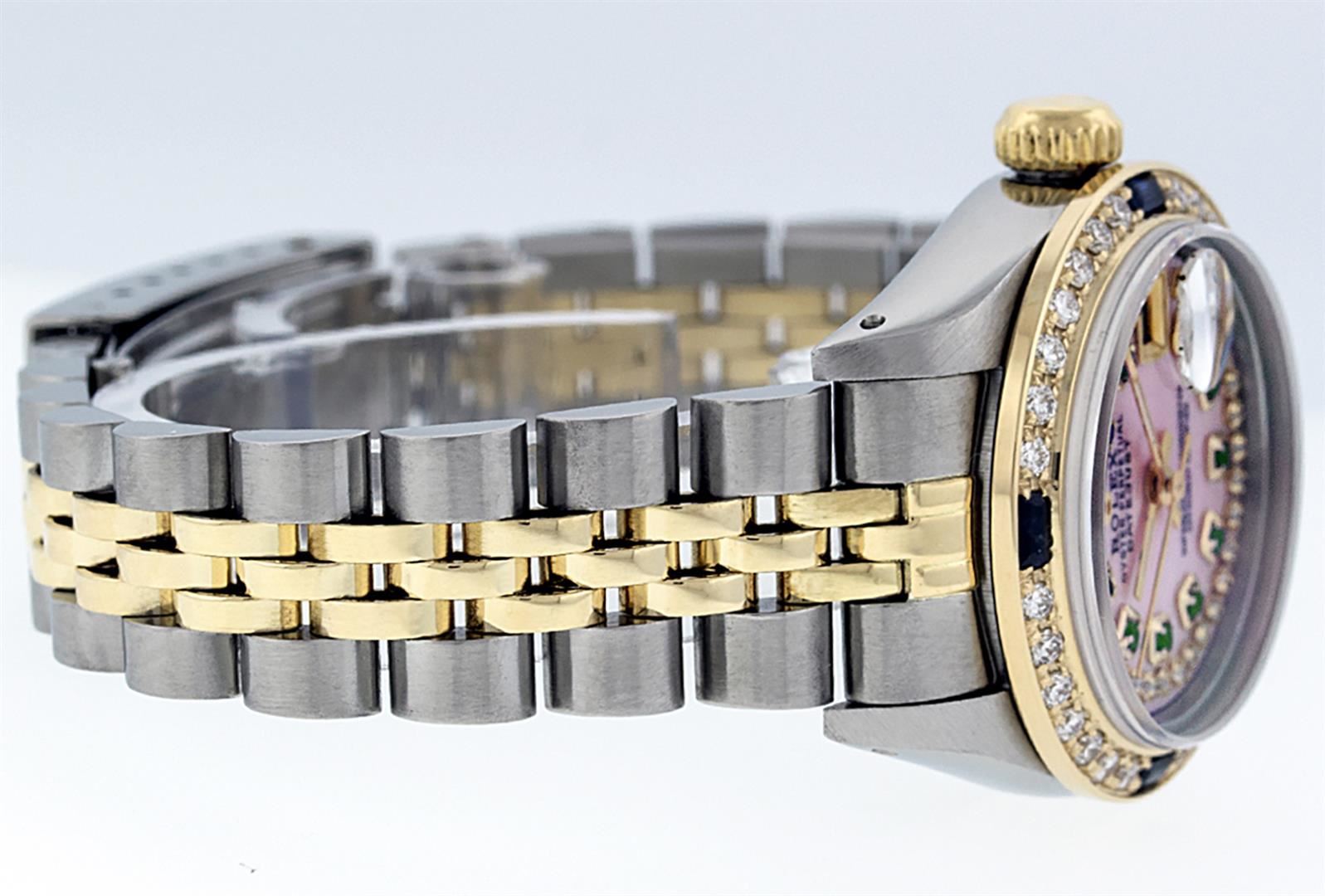 One Ladies 14K Two Tone Rolex Datejust Polished, Serviced & Electronically Tested, 14K Yellow Gold & Stainless Steel Case: 26mm, 14K Yellow Gold Crown, Custom Bezel: New 18K New Yellow Gold Sapphire Beadset Diamond Bezel, Diamond Count: 28 Diamonds + 4 Sapphires In Dial, Total Weight .70 Carat, Clarity: SI-VS, Color: G to H. Custom Crystal: New Scratch Resistant Synthetic Sapphire Cyclops Lens. Custom Hands: New Luminescent Hands. Movement: Automatic Winding Movement Caliber 2030. Custom Dial: Pink Mother Of Pearl Emerald String Diamond, Diamond Count: 10 Emeralds + 33 Diamonds In Dial, Clarity: SI-VS, Color: G to H. Date Window: 3 O'Clock Position Date Display, Model: Datejust. Condition: G-6 Extra Fine. Bracelet: Two Tone 14K Yellow Gold & Stainless Steel Jubilee Band. Bright Polish. 6.0 Inch Length, Adjustable. Standard Clasp, With Rolex Logo. This Watch Has Been Serviced Time Tested And Is In Excellent Condition It Is Free Of All Scratches And Dents.
