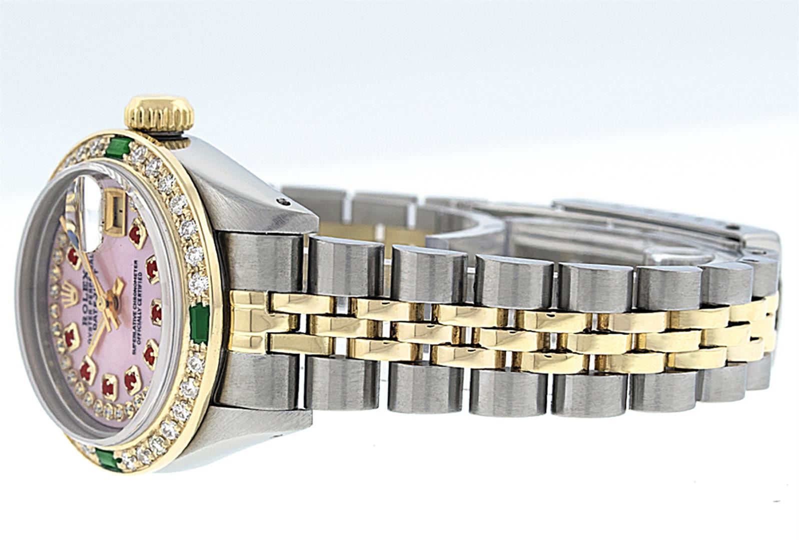 One Ladies 14K Two Tone Rolex Datejust Polished, Serviced & Electronically Tested, 14K Yellow Gold & Stainless Steel Case: 26mm, 14K Yellow Gold Crown, Custom Bezel: New 18K New Yellow Gold Beadset + Emerald Diamond Bezel, Stone Count: 28 Diamonds + 4 Emeralds On Bezel, Total Weight .70 Carat, Clarity: SI-VS, Color: G to H. Custom Crystal: New Scratch Resistant Synthetic Sapphire Cyclops Lens. Custom Hands: New Luminescent Hands. Movement: Automatic Winding Movement Caliber 2030. Custom Dial: Pink Mother Of Pearl Ruby String, Diamond Count: 10 Rubies + 33 Diamonds In Dial, Clarity: SI-VS, Color: G to H. Date Window: 3 O'Clock Position Date Display, Model: Datejust. Condition: G-6 Extra Fine. Bracelet: Two Tone 14K Yellow Gold & Stainless Steel Jubilee Band. Bright Polish. 6.0 Inch Length, Adjustable. Standard Clasp, With Rolex Logo. This Watch Has Been Serviced Time Tested And Is In Excellent Condition It Is Free Of All Scratches And Dents.