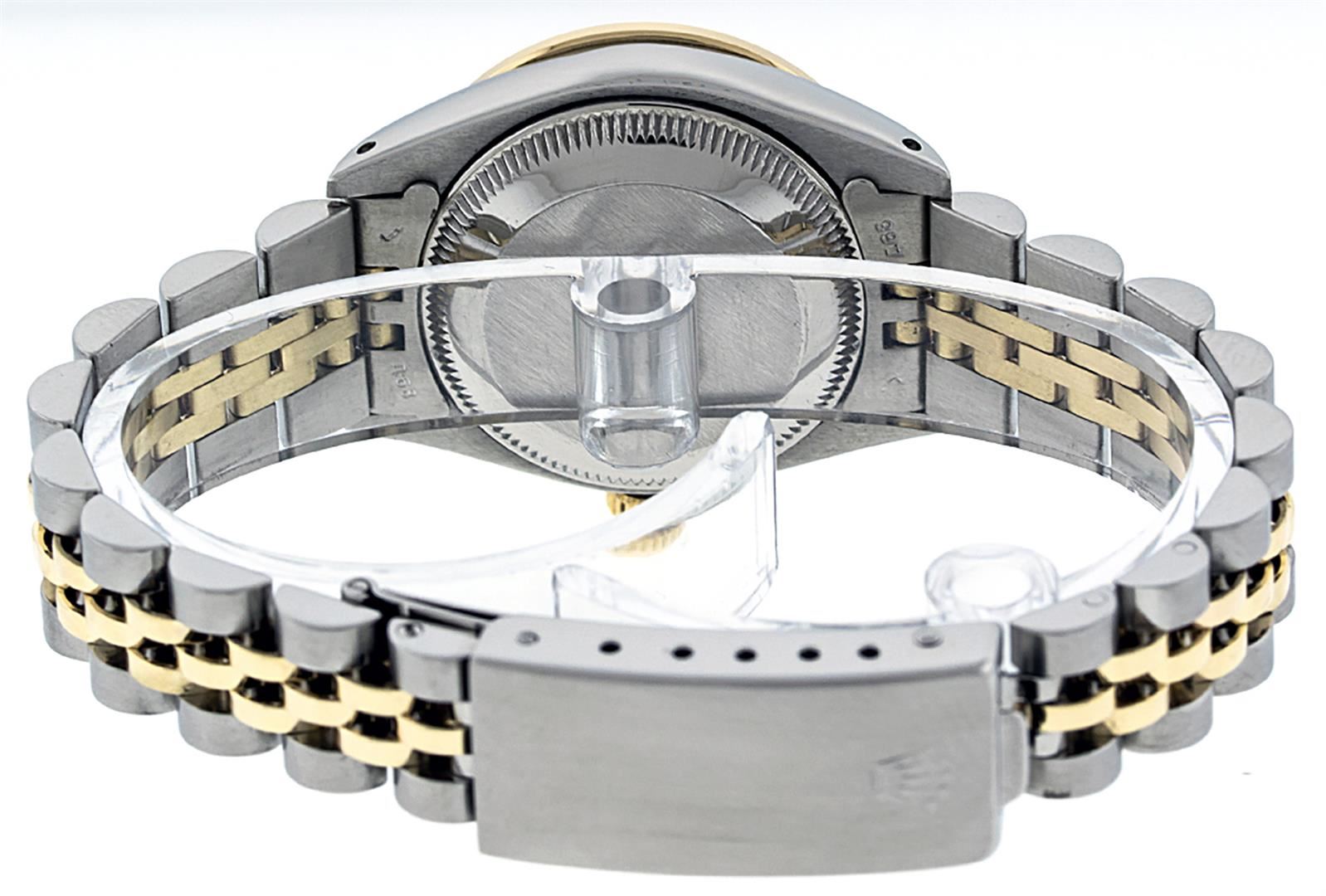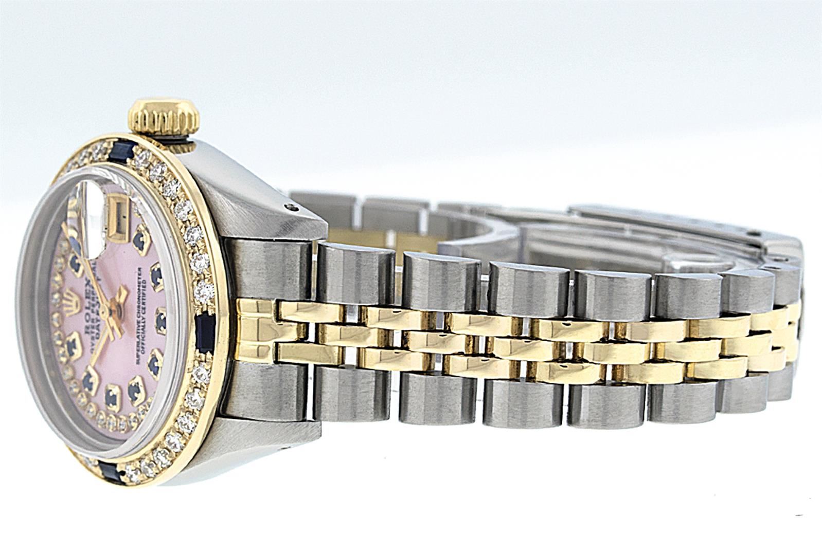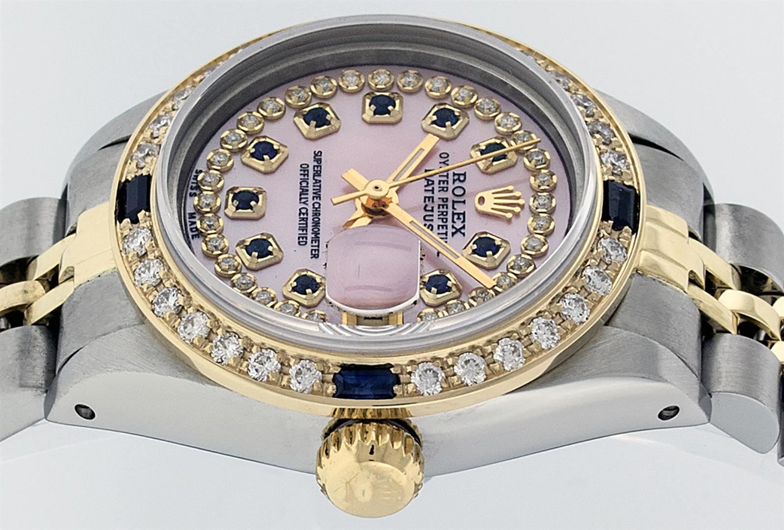One Ladies 14K Two Tone Rolex Datejust Polished, Serviced & Electronically Tested, 14K Yellow Gold & Stainless Steel Case: 26mm, 14K Yellow Gold Crown, Custom Bezel: New 18K Yellow Gold Sapphire Beadset Diamond Bezel, Diamond Count: 28 Diamonds + 4 Sapphires, Total Weight .70 Carat, Clarity: SI-VS, Color: G to H. Custom Crystal: New Synthetic Sapphire Cyclops Lens. Custom Hands: New Luminescent Hands. Movement: Automatic Winding Movement Caliber 2030. Custom Dial: Pink Mother Of Pearl With Sapphire String Diamond Hour Markers. Stone Count: 10 Sapphires + 33 Diamonds In Dial, Clarity: SI-VS, Color: G to H. Date Window: 3 O'Clock Position Date Display, Model: Datejust. Condition: G-6 Extra Fine. Bracelet: Two Tone 14K Yellow Gold & Stainless Steel Jubilee. Bright Polish. 6.0 Inch Length, Adjustable. Standard Clasp, With Rolex Logo. This Watch Has Been Serviced Time Tested And Is In Excellent Condition It Is Free Of All Scratches And Dents.
