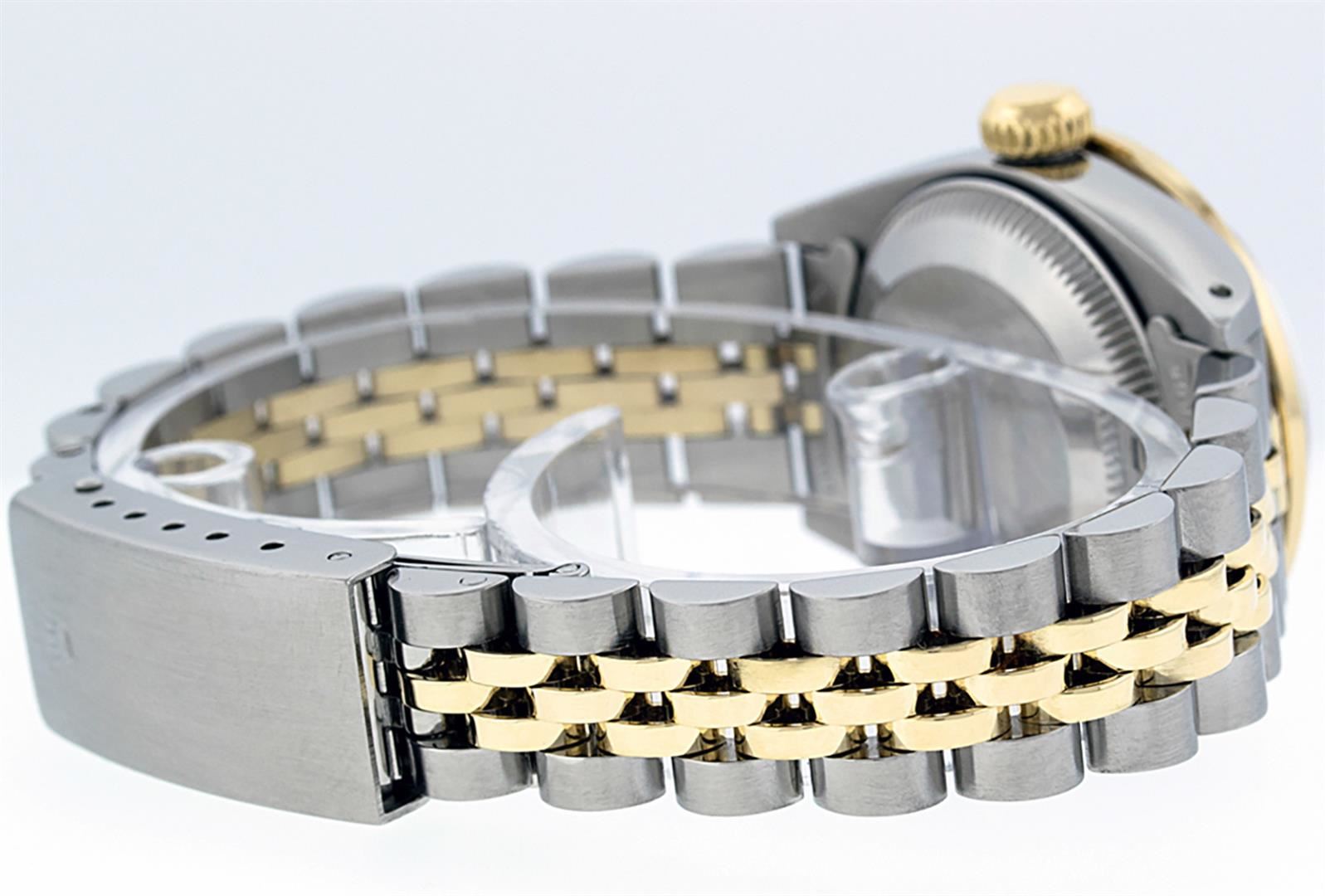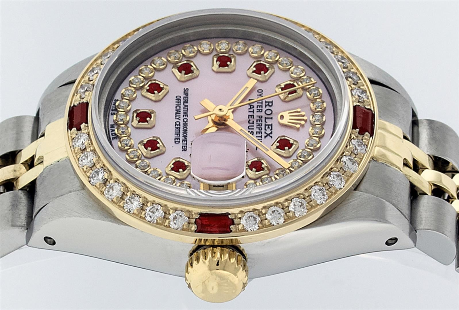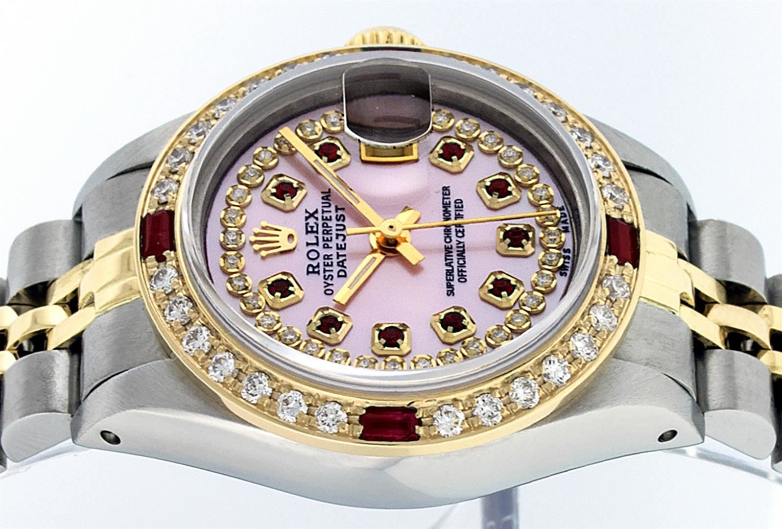 One Ladies 14K Two Tone Rolex Datejust Polished, Serviced & Electronically Tested, 14K Yellow Gold & Stainless Steel Case: 26mm, 14K Yellow Gold Crown, Custom Bezel: New 18K Yellow Gold Ruby Beadset Diamond Bezel, Diamond Count: 28 Diamonds + 4 Rubies, Total Weight .70 Carat, Clarity: SI-VS, Color: G to H. Custom Crystal: New Synthetic Sapphire Cyclops Lens. Custom Hands: New Luminescent Hands. Movement: Automatic Winding Movement Caliber 2030. Custom Dial: Pink Mother Of Pearl With Ruby String Diamond Hour Markers. Stone Count: 10 Rubies + 33 Diamonds In Dial, Clarity: SI-VS, Color: G to H. Date Window: 3 O'clock Position Date Display, Model: Datejust. Condition: G-6 Extra Fine. Bracelet: Two Tone 14K Yellow Gold & Stainless Steel Jubilee. Bright Polish. 6.0 Inch Length, Adjustable. Standard Clasp, With Rolex Logo. This Watch Has Been Serviced Time Tested And Is In Excellent Condition It Is Free Of All Scratches And Dents.