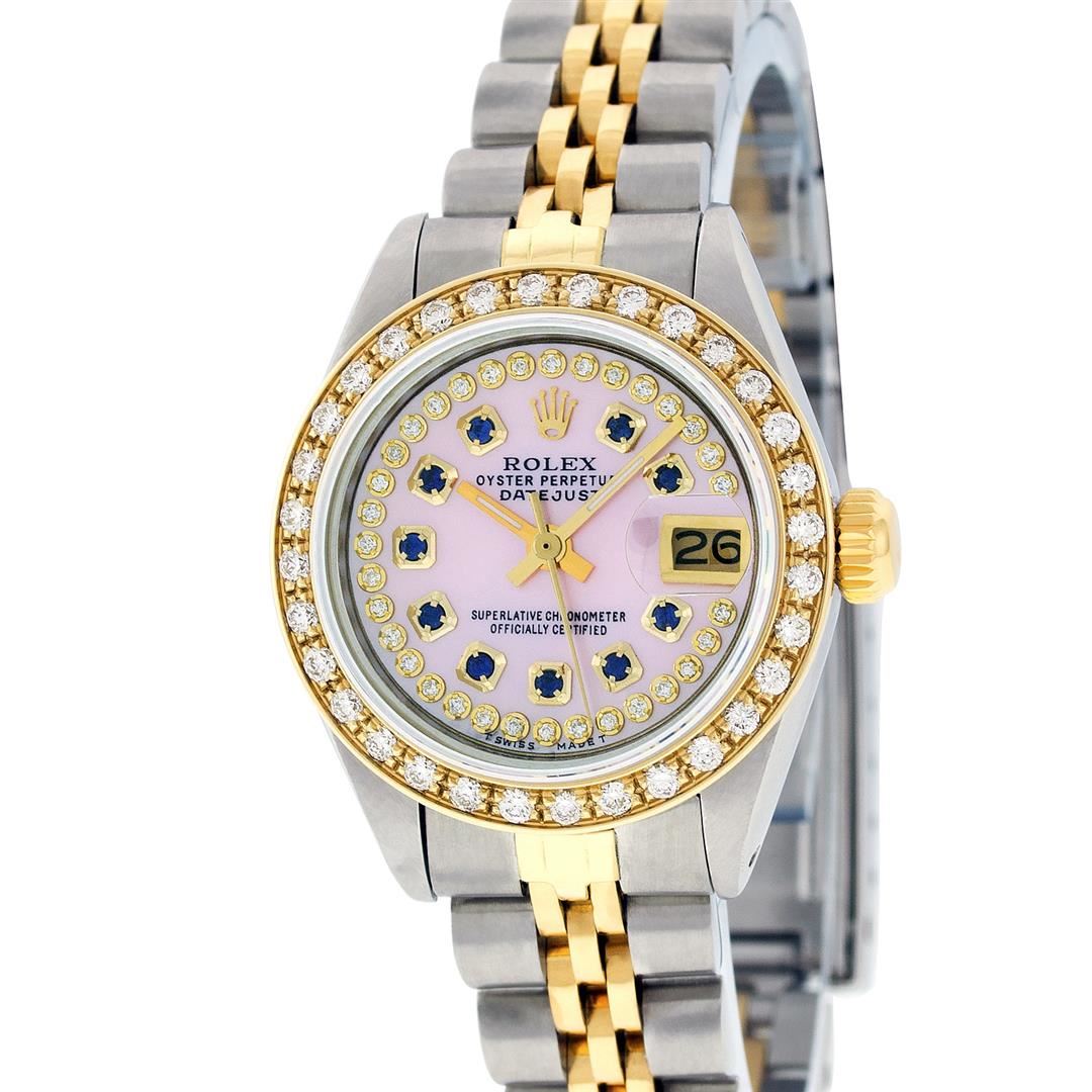 One Ladies 14K Two Tone Rolex Datejust Polished, Serviced & Electronically Tested, 14K Yellow Gold & Stainless Steel Case: 26mm, 14K Yellow Gold Crown, Custom Bezel: New 18K Yellow Gold Beadset Diamond Bezel, Diamond Count: 43 Diamonds in dial, Total Weight .70 Carat, Clarity: SI-VS, Color: G to H. Custom Crystal: New Synthetic Sapphire Cyclops Lens. Custom Hands: New Luminescent Hands. Movement: Automatic Winding Movement Caliber 2030. Custom Dial: Pink Mother Of Pearl String Diamond and Sapphire Dial, Stone Count: 33 Diamonds + 10 Sapphires, Clarity: SI-VS, Color: G to H. Date Window: 3 O'Clock Position Date Display, Model: Datejust. Condition: G-6 Extra Fine. Bracelet: Two Tone 14K Yellow Gold & Stainless Steel Jubilee Band. Bright Polish. 6.0 Inch Length, Adjustable. Standard Clasp, With Rolex Logo. This Watch Has Been Serviced Time Tested And Is In Excellent Condition It Is Free Of All Scratches And Dents.