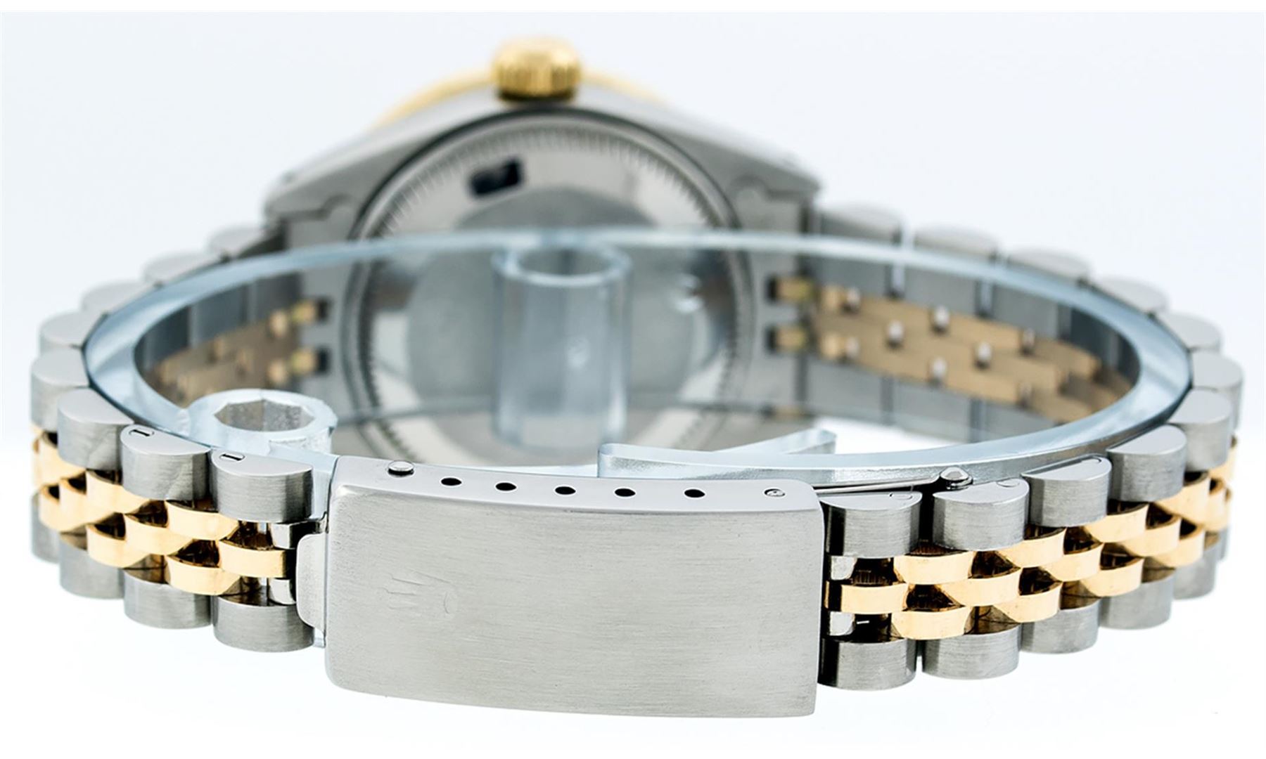 One Ladies 14 Two Tone Rolex Datejust Polished, Serviced & Electronically Tested, 14K Yellow Gold & Stainless Steel Case: 26mm, 14K Yellow Gold Crown, Custom Bezel: 18K Yellow Gold Pyramid Diamond Bezel, Diamond Count: 24 Diamonds Total Weight .50 Carat, Clarity: Si-VS, Color: G to H. Custom Crystal: Synthetic Sapphire Cyclops Lens. Custom Hands: New Luminescent Hands. Movement: Automatic Winding Movement Caliber 2030. Custom Dial: Pink Mother Of Pearl Baguette Diamond Hour Markers. 10 Baguette Diamonds In Dial, Clarity: SI-VS, Color: G to H. Date Window: 3 O'Clock Position Date Display, Model: Datejust. Condition: G-6 Extra Fine. Bracelet: Two Tone 14K Yellow Gold & Stainless Steel Jubilee. Bright Polish. 6.0 Inch Length, Adjustable. Standard Clasp, With Rolex Logo. This Watch Has Been Serviced Time Tested And Is In Excellent Condition It Is Free Of All Scratches And Dents.