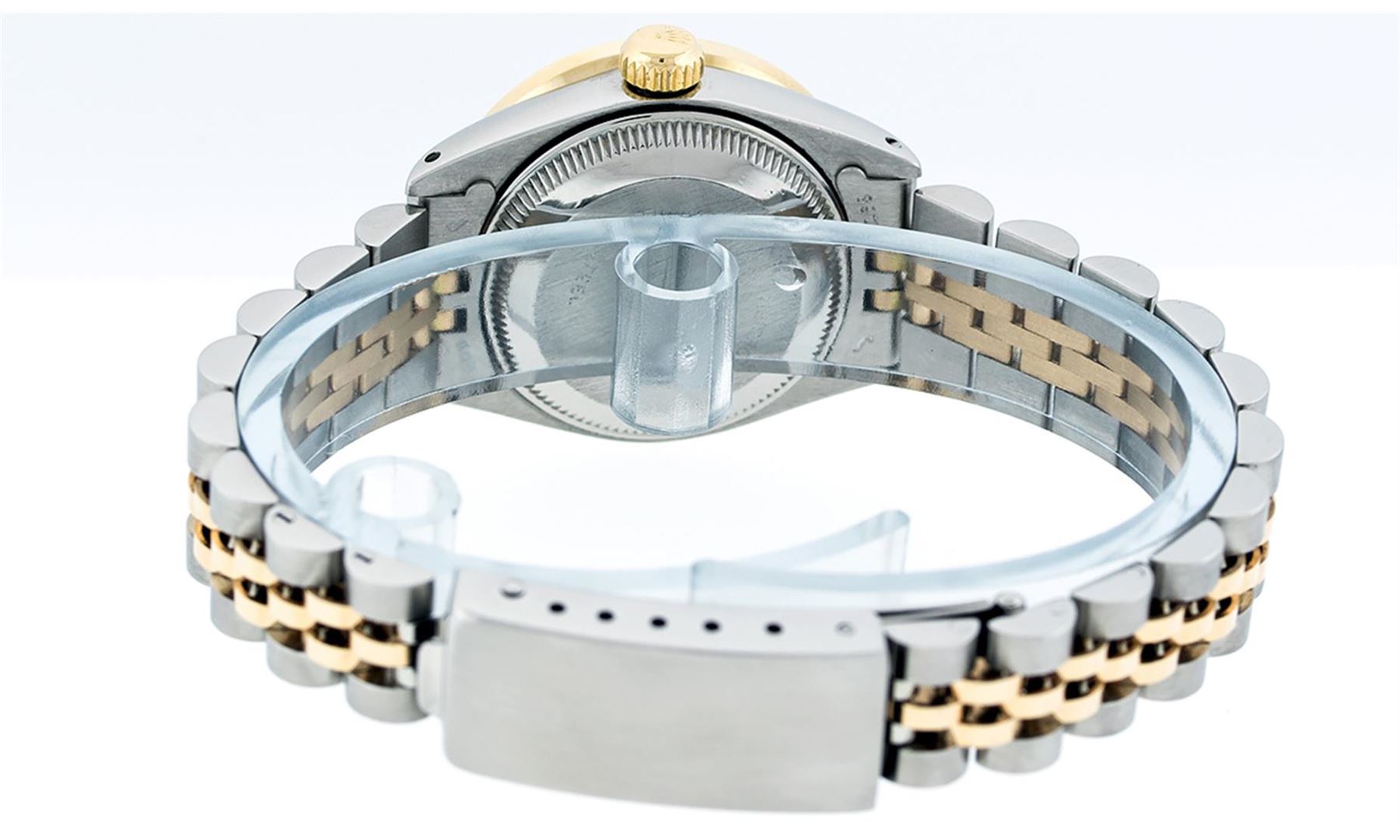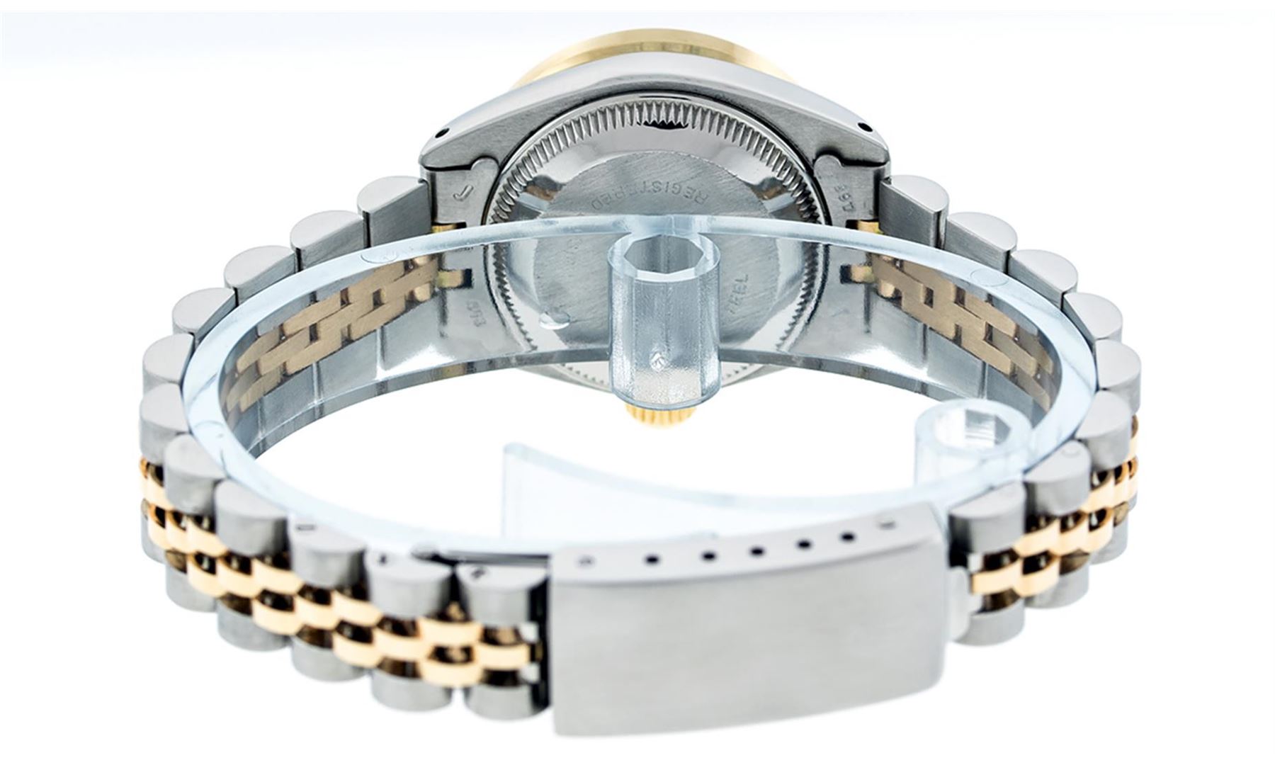One Ladies 14 Two Tone Rolex Datejust Polished, Serviced & Electronically Tested, 14K Yellow Gold & Stainless Steel Case: 26mm, 14K Yellow Gold Crown, Custom Bezel: 18K Yellow Gold Pyramid Diamond Bezel, Diamond Count: 24 Diamonds Total Weight .50 Carat, Clarity: Si-VS, Color: G to H. Custom Crystal: Synthetic Sapphire Cyclops Lens. Custom Hands: New Luminescent Hands. Movement: Automatic Winding Movement Caliber 2030. Custom Dial: Pink Mother Of Pearl Baguette Diamond Hour Markers. 10 Baguette Diamonds In Dial, Clarity: SI-VS, Color: G to H. Date Window: 3 O'Clock Position Date Display, Model: Datejust. Condition: G-6 Extra Fine. Bracelet: Two Tone 14K Yellow Gold & Stainless Steel Jubilee. Bright Polish. 6.0 Inch Length, Adjustable. Standard Clasp, With Rolex Logo. This Watch Has Been Serviced Time Tested And Is In Excellent Condition It Is Free Of All Scratches And Dents.