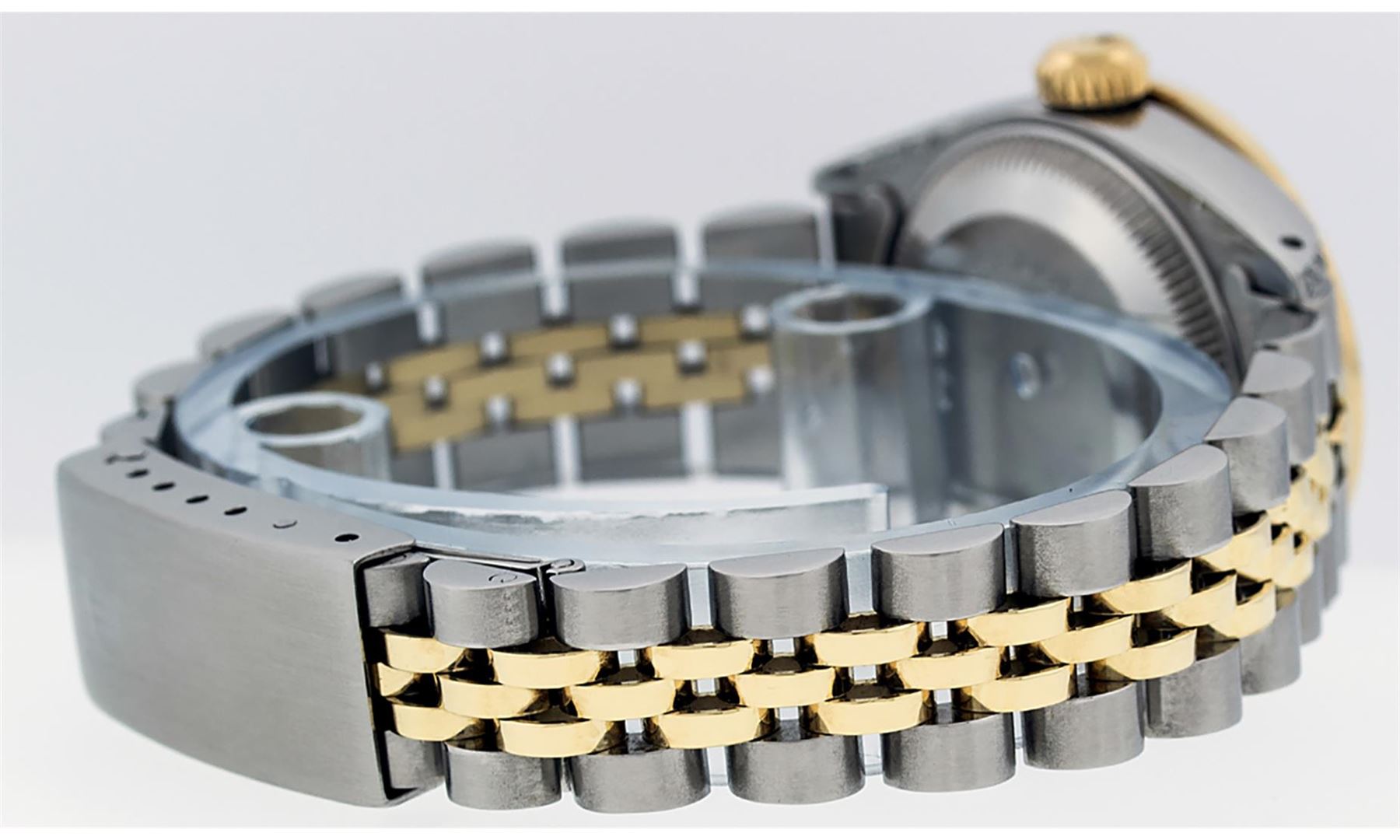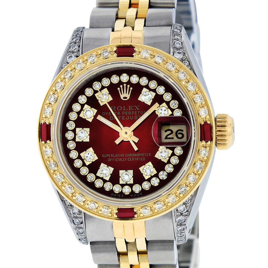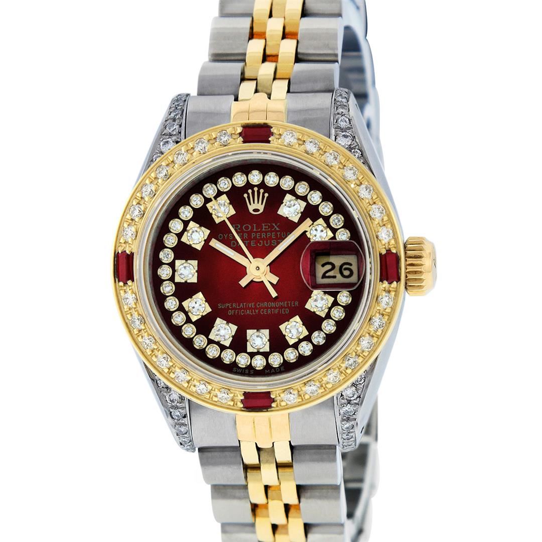 One Ladies 14K Two Tone Rolex Datejust Polished, Serviced & Electronically Tested, 14K Yellow Gold & Stainless Steel Case: 26mm, 14K Yellow Gold Crown, Diamond Lugs: 24 Diamonds On Lugs, Clarity: SI-VS, Color: G to H. Custom Bezel: New 18K Yellow Gold Ruby Beadset Diamond Bezel, Diamond Count: 28 Diamonds + 4 Rubies On Bezel, Total Weight .70 Carat, Clarity: SI-VS, Color: G to H. Custom Crystal: New Synthetic Scratch Resistant Sapphire Cyclops Lens. Custom Hands: New Luminescent Hands. Movement: Automatic Winding Movement Caliber 2030. Custom Refinished Dial: Red Vignette With String Single Cut Diamond Hour Markers, Diamond Count: 43 Diamonds On Dial, Clarity: SI-VS, Color: G to H. Date Window: 3 O'Clock Position Date Display, Model: Datejust. Condition: G-6 Extra Fine. Bracelet: Two Tone 14K Yellow Gold & Stainless Steel Jubilee Band. Bright Polish. 6.0 Inch Length, Adjustable. Standard Clasp, With Rolex Logo. This Watch Has Been Serviced Time Tested And Is In Excellent Condition It Is Free Of All Scratches And Dents.