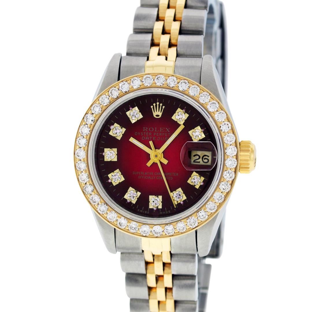 One Ladies 14K Two Tone Rolex Datejust Polished, Serviced & Electronically Tested, 14K Yellow Gold & Stainless Steel Case: 26mm, 14K Yellow Gold Crown, Custom Bezel: New 18K 1ctw Yellow Gold Beadset Diamond Bezel, Diamond Count: 42 Diamonds, Total Weight 1.00 Carat, Clarity: SI-VS, Color: G to H. Custom Crystal: New Synthetic Sapphire Cyclops Lens. Custom Hands: New Luminescent Hands. Movement: Automatic Winding Movement Caliber 2030. Custom Dial: Red Vignette VS Diamond Dial, Diamond Count: 10 Single Cut Diamonds in Dial, G To H In Color, VS Clarity. Date Window: 3 O'Clock Position Date Display, Model: Datejust, Condition: G-6 Extra Fine. Bracelet: Two Tone 14K Yellow Gold & Stainless Steel Jubilee Band. Bright Polish. 6.0 Inch Length, Adjustable. Standard Clasp, With Rolex Logo. This Watch Has Been Serviced Time Tested And Is In Excellent Condition It Is Free Of All Scratches And Dents.