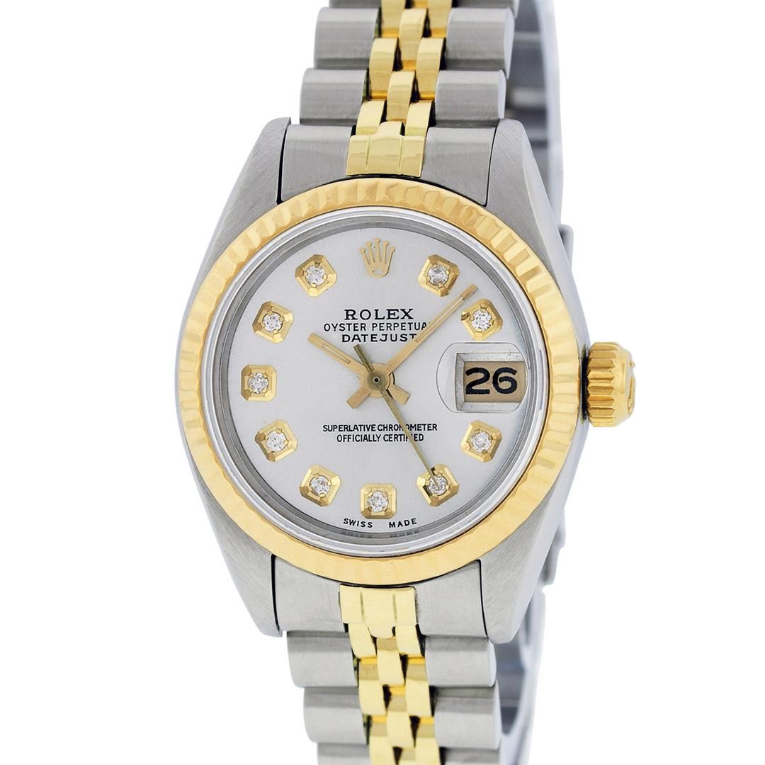 One Ladies 14K Two Tone Rolex Datejust Polished, Serviced & Electronically Tested, 14K Yellow Gold & Stainless Steel Case: 26mm, 14K Yellow Gold Crown, Bezel: 14K Yellow Gold Fluted Bezel. Custom Crystal: New Acrylic Cyclops Lens. Custom Hands: New Luminescent Hands. Movement: Automatic Winding Movement Caliber 2030. Custom Dial: Silver With Diamond Hour Markers, Diamond Count: 10 Diamonds, Color: G to H, Clarity: VS2-SI1. Date Window: 3 O'Clock Position Date Display, Model: Datejust. Condition: G-6 Extra Fine. Bracelet: Two Tone 14K Yellow Gold & Stainless Steel Jubilee Band. Bright Polish. 6.0 Inch Length, Adjustable. Standard Clasp, With Rolex Logo. This Watch Has Been Serviced Time Tested And Is In Excellent Condition It Is Free Of All Scratches And Dents.