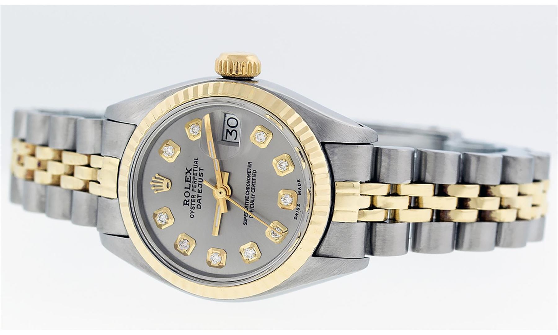 One Ladies 14K Two Tone Rolex Datejust Polished, Serviced & Electronically Tested, 14K Yellow Gold & Stainless Steel Case: 26mm, 14K Yellow Gold Crown, Bezel: 14K Yellow Gold Fluted Bezel. Custom Crystal: New Acrylic Cyclops Lens. Custom Hands: New Luminescent Hands. Movement: Automatic Winding Movement Caliber 2030. Custom Dial: Slate Grey With Diamond Hour Markers, Diamond Count: 10 Diamonds, Color: G to H, Clarity: VS2-SI1. Date Window: 3 O'Clock Position Date Display, Model: Datejust. Condition: G-6 Extra Fine. Bracelet: Two Tone 14K Yellow Gold & Stainless Steel Jubilee Band. Bright Polish. 6.0 Inch Length, Adjustable. Standard Clasp, With Rolex Logo. This Watch Has Been Serviced Time Tested And Is In Excellent Condition It Is Free Of All Scratches And Dents.