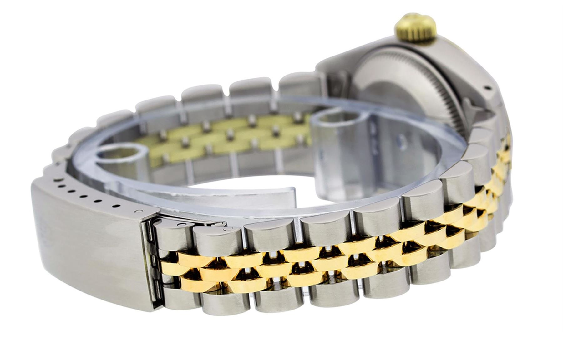 One Ladies 14K Two Tone Rolex Datejust Polished, Serviced & Electronically Tested, 14K Yellow Gold & Stainless Steel, Case Size: 26mm, 14K Yellow Gold Crown, Bezel: 14K Yellow Gold Fluted Bezel. Custom Crystal: New Acrylic Cyclops Lens. Custom Hands: New Luminescent Hands. Movement: Automatic Winding Movement Caliber 2030. Custom Dial: Slate Grey Roman Dial. Date Window: 3 O'Clock Position Date Display, Model: Datejust. Condition: G-6 Extra Fine. Bracelet: Two Tone 14K Yellow Gold & Stainless Steel Jubilee. Bright Polish. 6.0 Inch Length, Adjustable. Standard Clasp, With Rolex Logo. This Watch Has Been Serviced Time Tested And Is In Excellent Condition It Is Free Of All Scratches And Dents.