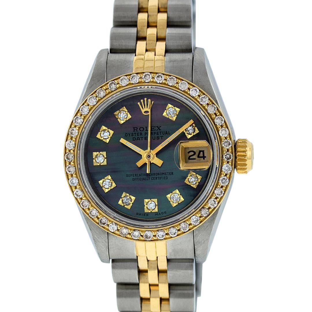 One Ladies 14K Two Tone Rolex Datejust Polished, Serviced & Electronically Tested, 14K Yellow Gold & Stainless Steel Case: 26mm, 14K Yellow Gold Crown, Custom Bezel: New 18K Yellow Gold  Beadset Diamond Bezel, Diamond Count: 32 Diamonds On Bezel, Total Weight .70 Carat, Clarity: SI-VS, Color: G to H. Custom Crystal: New Scratch Resistant Synthetic Sapphire Cyclops Lens. Custom Hands: New Luminescent Hands. Movement: Automatic Winding Movement Caliber 2030. Custom Dial: Tahitian MOP With Single Cut Diamond Hour Markers, 10 Diamonds In Dial, G To H In Color, SI-VS Clarity. Date Window: 3 O'Clock Position Date Display, Model: Datejust. Condition: G-6 Extra Fine. Bracelet: Two Tone 14K Yellow Gold & Stainless Steel Jubilee Band. Bright Polish. 6.0 Inch Length, Adjustable. Standard Clasp, With Rolex Logo. This Watch Has Been Serviced Time Tested And Is In Excellent Condition It Is Free Of All Scratches And Dents.