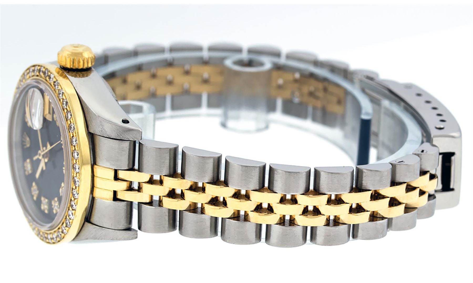 One Ladies 14K Two Tone Rolex Datejust Polished, Serviced & Electronically Tested, 14K Yellow Gold & Stainless Steel Case: 26mm, 14K Yellow Gold Crown, Custom Bezel: New 18K Yellow Gold Beadset Diamond Bezel, Diamond Count: 32 Diamonds On Bezel, Total Weight .70 Carat, Clarity: SI-VS, Color: G to H. Custom Crystal: New Scratch Resistant Synthetic Sapphire Cyclops Lens. Custom Hands: New Luminescent Hands. Movement: Automatic Winding Movement Caliber 2030. Custom Dial: Tahitian MOP With Single Cut Diamond Hour Markers, 10 Diamonds In Dial, G To H In Color, SI-VS Clarity. Date Window: 3 O'Clock Position Date Display, Model: Datejust. Condition: G-6 Extra Fine. Bracelet: Two Tone 14K Yellow Gold & Stainless Steel Jubilee Band. Bright Polish. 6.0 Inch Length, Adjustable. Standard Clasp, With Rolex Logo. This Watch Has Been Serviced Time Tested And Is In Excellent Condition It Is Free Of All Scratches And Dents.