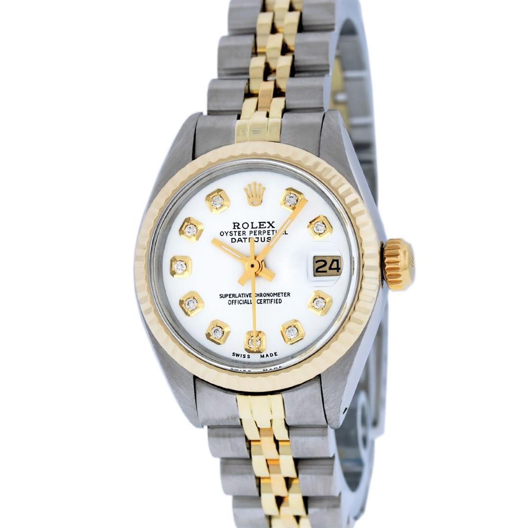 One Ladies 14K Two Tone Rolex Datejust Polished, Serviced & Electronically Tested, 14K Yellow Gold & Stainless Steel Case: 26mm, 14K Yellow Gold Crown, Bezel: 14K Yellow Gold Fluted Bezel. Custom Crystal: New Acrylic Cyclops Lens. Custom Hands: New Luminescent Hands. Movement: Automatic Winding Movement Caliber 2030. Custom Dial: Mother Of Pearl With Diamond Hour Markers, Diamond Count: 10 Diamonds, Color: G to H, Clarity: VS2-SI1. Date Window: 3 O'clock Position Date Display, Model: Datejust. Condition: G-6 Extra Fine. Bracelet: Two Tone 14K Yellow Gold & Stainless Steel Jubilee. Bright Polish. 6.0 Inch Length, Adjustable. Standard Clasp, With Rolex Logo. This Watch Has Been Serviced Time Tested And Is In Excellent Condition It Is Free Of All Scratches And Dents.