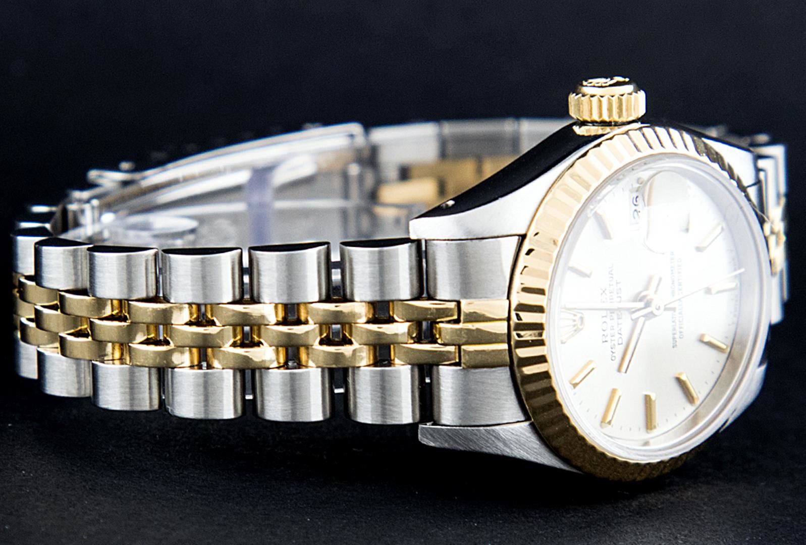 One Ladies 14K Two Tone Rolex Datejust Polished, Serviced & Electronically Tested, 14K Yellow Gold & Stainless Steel Case: 26mm, 14K Yellow Gold Crown, Bezel: 14K Yellow Gold Fluted Bezel. Custom Crystal: New Acrylic Cyclops Lens. Custom Hands: New Luminescent Hands. Movement: Automatic Winding Movement Caliber 2030. Custom Dial: White Index With Dash Track. Date Window: 3 O'Clock Position Date Display, Model: Datejust. Condition: G-6 Extra Fine. Bracelet: Two Tone 14K Yellow Gold & Stainless Steel Jubilee Band. Bright Polish. 6.0 Inch Length, Adjustable. Standard Clasp, With Rolex Logo. This Watch Has Been Serviced Time Tested And Is In Excellent Condition It Is Free Of All Scratches And Dents. This Watch Comes With A Rolex Box