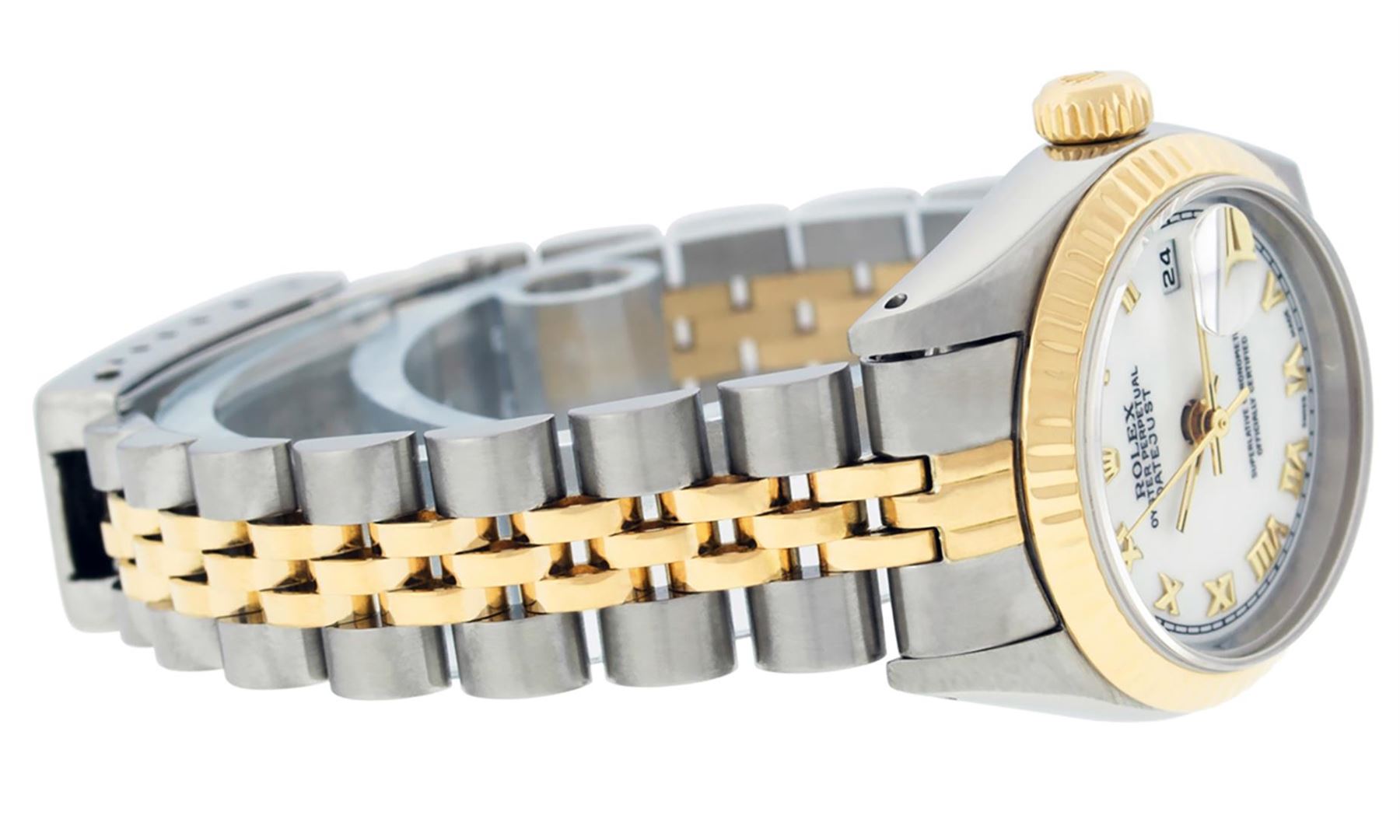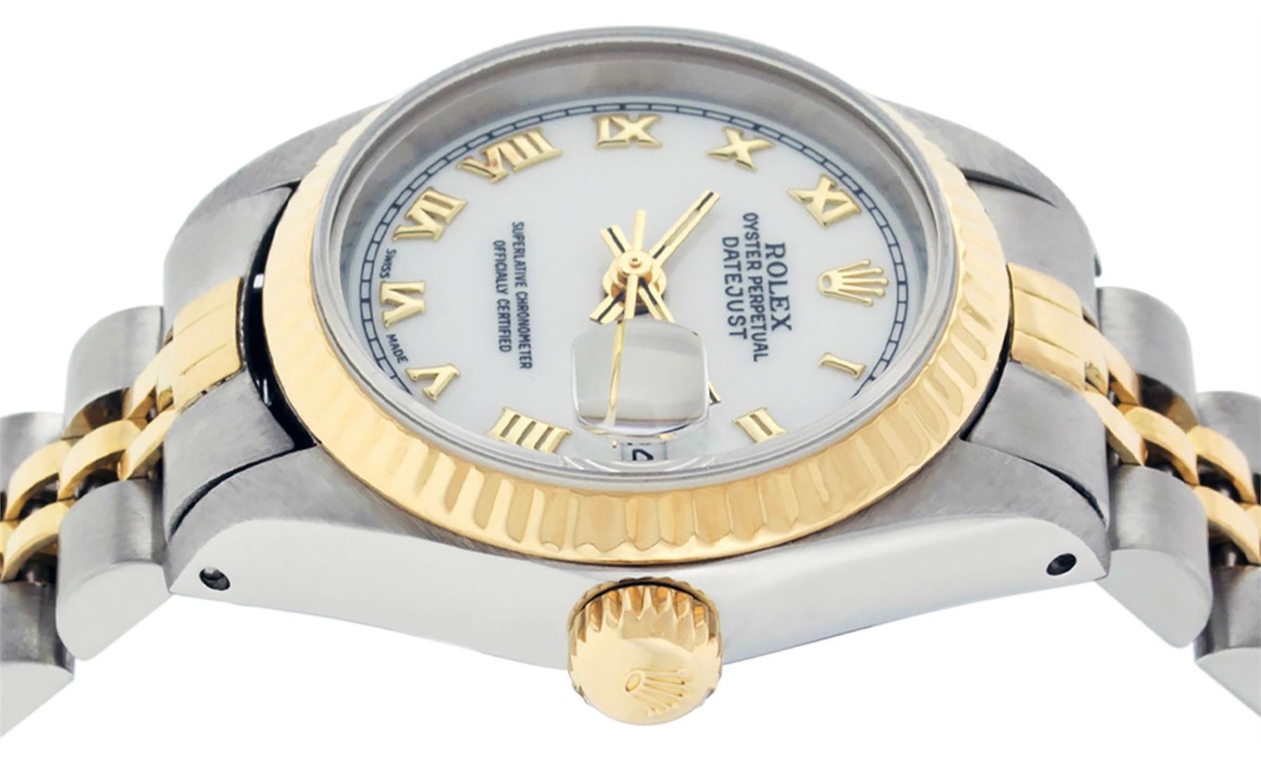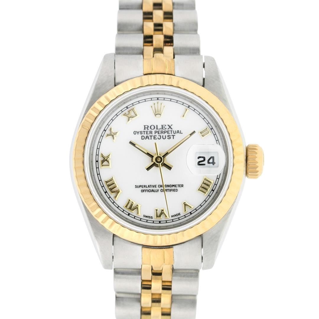 One Ladies 14K Two Tone Rolex Datejust Polished, Serviced & Electronically Tested, 14K Yellow Gold & Stainless Steel, Case Size: 26mm, 14K Yellow Gold Crown, Bezel: 14K Yellow Gold Fluted Bezel. Custom Crystal: New Acrylic Cyclops Lens. Custom Hands: New Luminescent Hands. Movement: Automatic Winding Movement Caliber 2030. Custom Dial: White Roman Dial. Date Window: 3 O'clock Position Date Display, Model: Datejust. Condition: G-6 Extra Fine. Bracelet: Two Tone 14K Yellow Gold & Stainless Steel Jubilee. Bright Polish. 6.0 Inch Length, Adjustable. Standard Clasp, With Rolex Logo. This Watch Has Been Serviced Time Tested And Is In Excellent Condition It Is Free Of All Scratches And Dents.