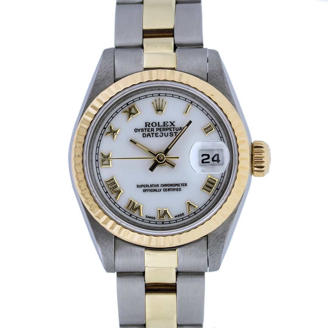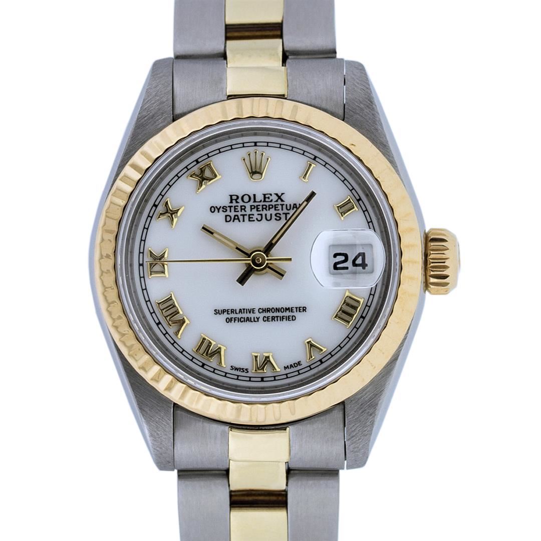 One Ladies 14K Yellow Gold & Stainless Steel Two Tone Rolex Datejust Polished, Serviced & Electronically Tested, 14K Yellow Gold & Stainless Steel Case: 26mm, 14K Yellow Gold Crown, Bezel: 14K Yellow Gold Fluted Bezel. Custom Crystal: New Acrylic Cyclops Lens. Custom Hands: New Luminescent Hands. Movement: Automatic Winding Movement Caliber 2030. Dial: White Roman With Square Track. Date Window: 3 O'Clock Position Date Display, Model: Datejust. Condition: G-6 Extra Fine. Bracelet: Two Tone 14K Yellow Gold & Stainless Steel Oyster Band. Bright Polish. 6.0 Inch Length, Adjustable. Standard Clasp, With Rolex Logo. This Watch Has Been Serviced Time Tested And Is In Excellent Condition It Is Free Of All Scratches And Dents.