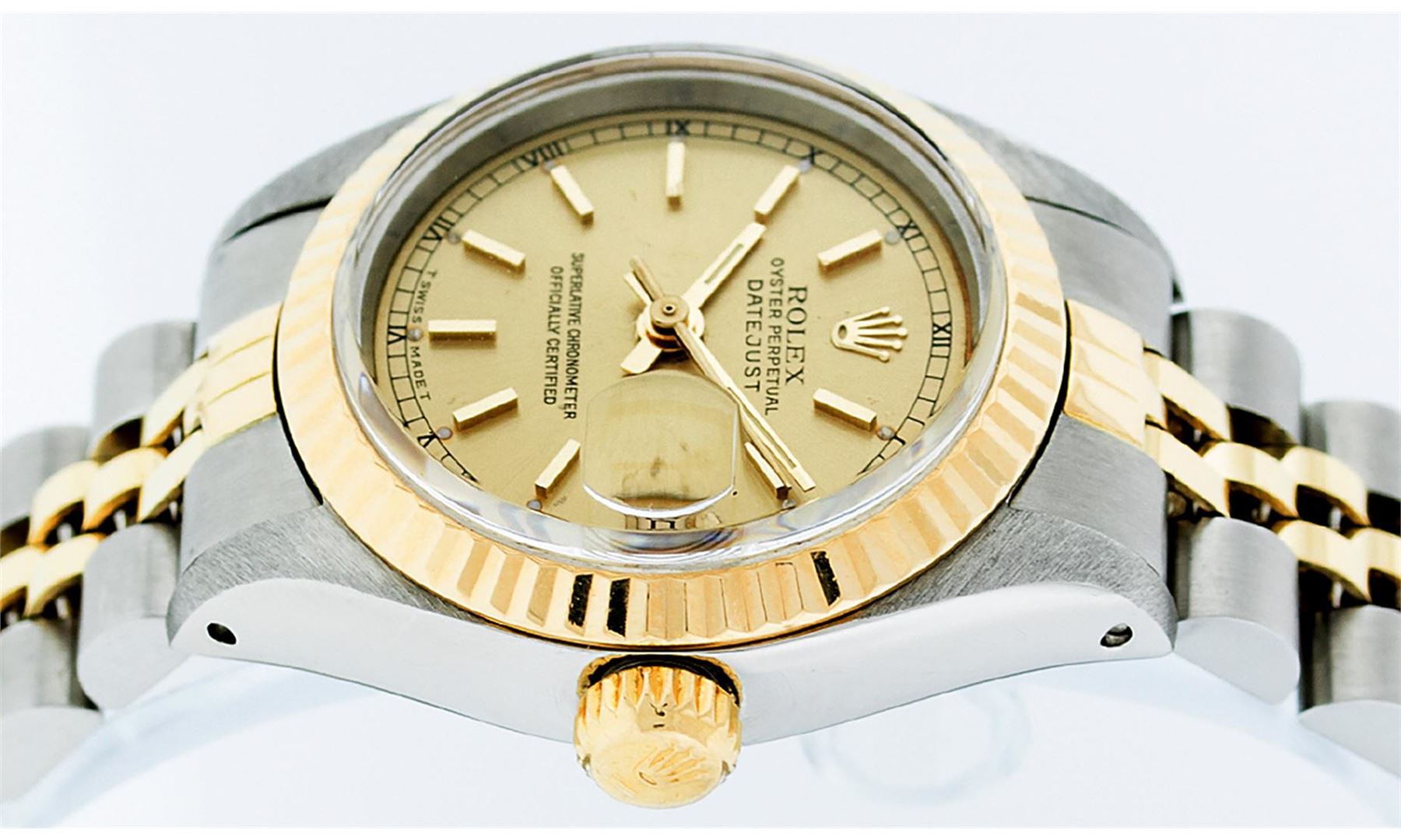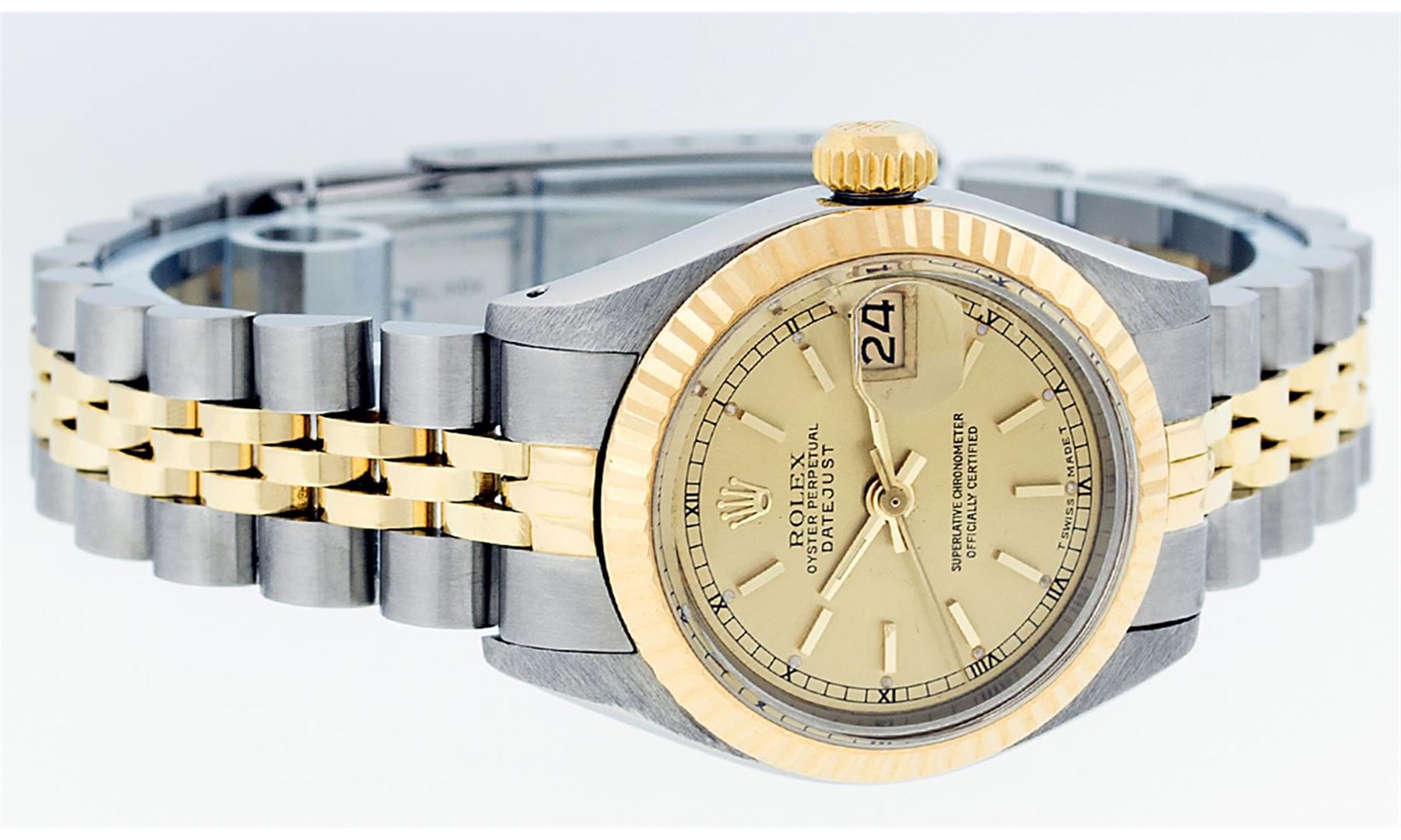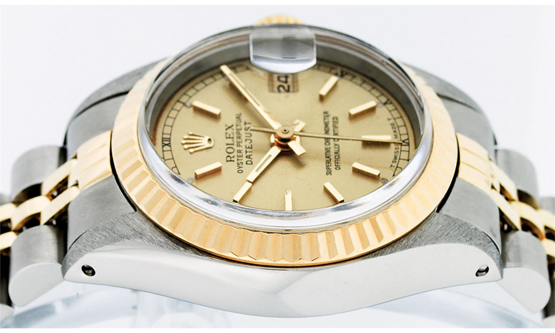 One Ladies 14K Two Tone Rolex Datejust Polished, Serviced & Electronically Tested, 14K Yellow Gold & Stainless Steel Case: 26mm, 14K Yellow Gold Crown, Bezel: 14K Yellow Gold Fluted Bezel. Custom Crystal: New Acrylic Cyclops Lens. Custom Hands: New Luminescent Hands. Movement: Automatic Winding Movement Caliber 2030. Dial: Champagne Index With Roman Track & Lumi Dots. Date Window: 3 O'Clock Position Date Display, Model: Datejust. Condition: G-6 Extra Fine. Bracelet: Two Tone 14K Yellow Gold & Stainless Steel Jubilee Band. Bright Polish. 6.0 Inch Length, Adjustable. Standard Clasp, With Rolex Logo. This Watch Has Been Serviced Time Tested And Is In Excellent Condition It Is Free Of All Scratches And Dents.