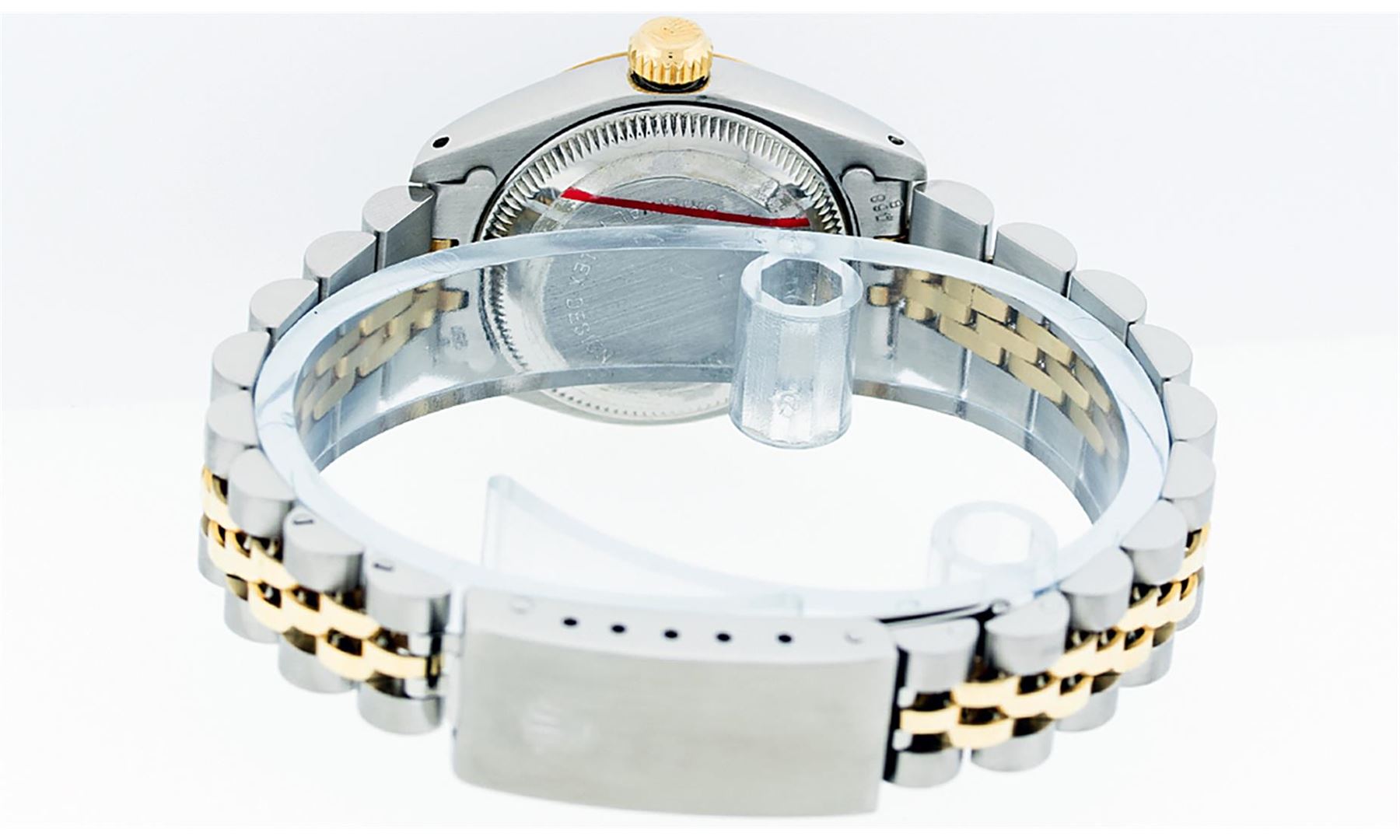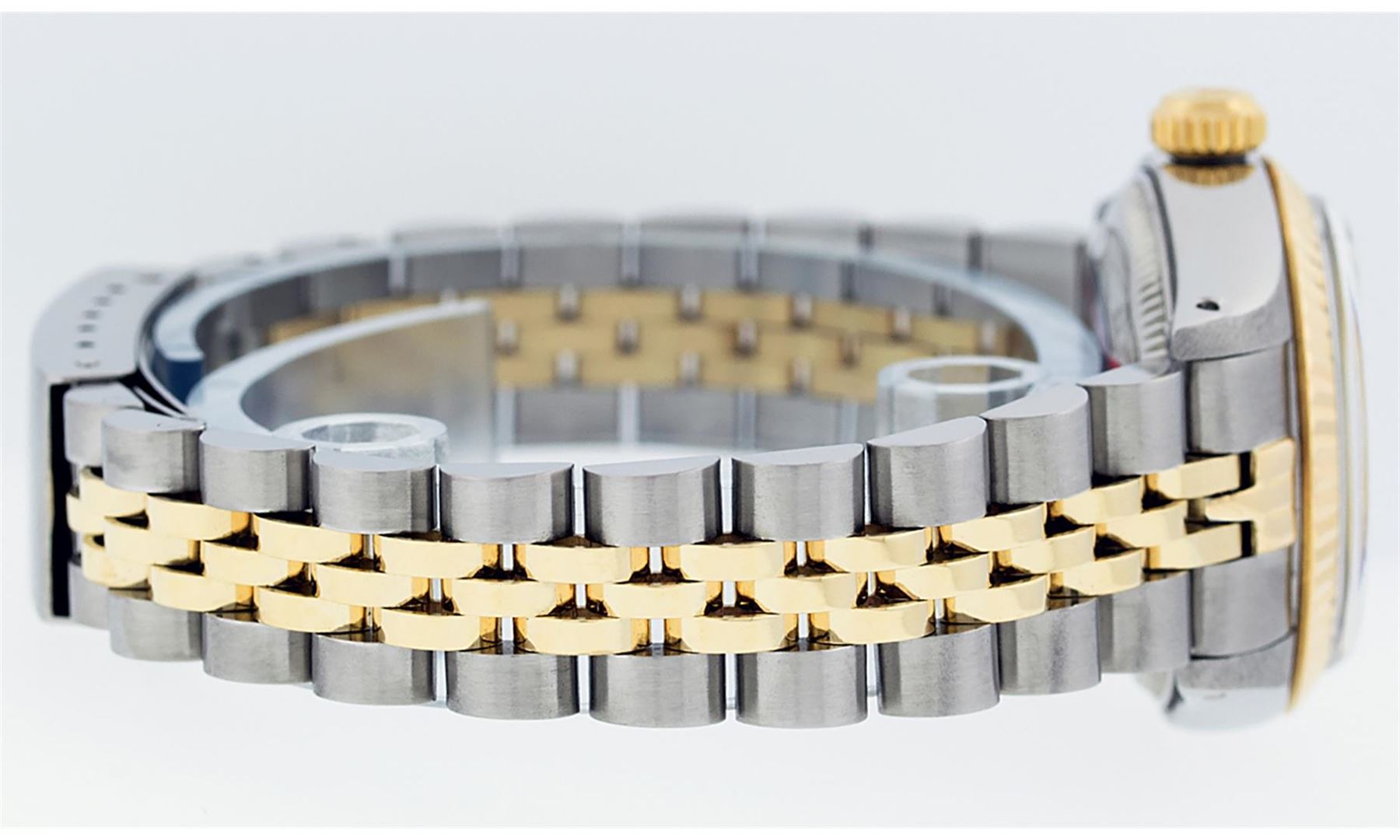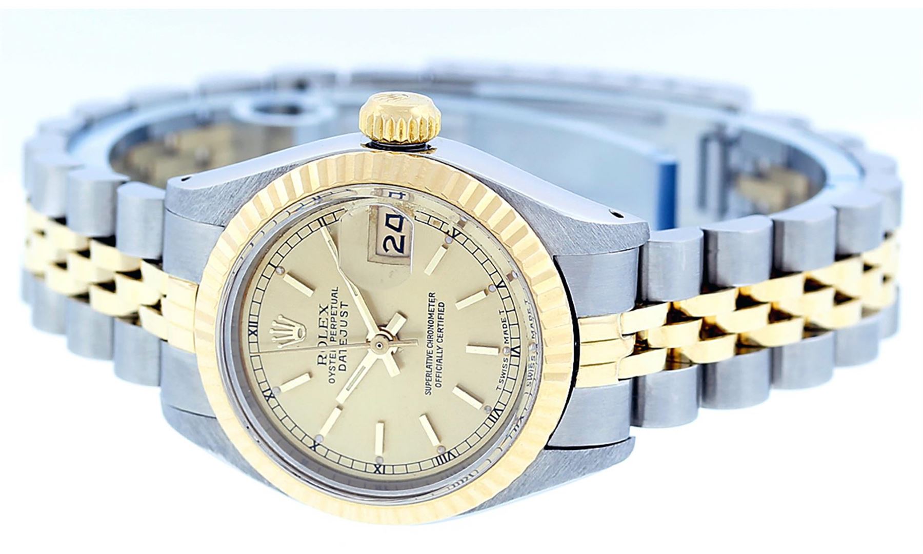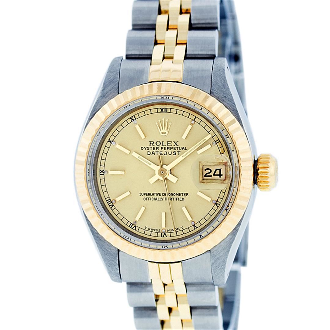 One Ladies 14K Two Tone Rolex Datejust Polished, Serviced & Electronically Tested, 14K Yellow Gold & Stainless Steel Case: 26mm, 14K Yellow Gold Crown, Bezel: 14K Yellow Gold Fluted Bezel. Custom Crystal: New Acrylic Cyclops Lens. Custom Hands: New Luminescent Hands. Movement: Automatic Winding Movement Caliber 2030. Dial: Champagne Index With Roman Track & Lumi Dots. Date Window: 3 O'Clock Position Date Display, Model: Datejust. Condition: G-6 Extra Fine. Bracelet: Two Tone 14K Yellow Gold & Stainless Steel Jubilee Band. Bright Polish. 6.0 Inch Length, Adjustable. Standard Clasp, With Rolex Logo. This Watch Has Been Serviced Time Tested And Is In Excellent Condition It Is Free Of All Scratches And Dents.