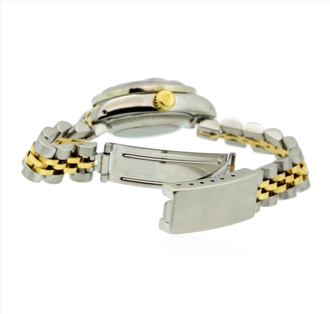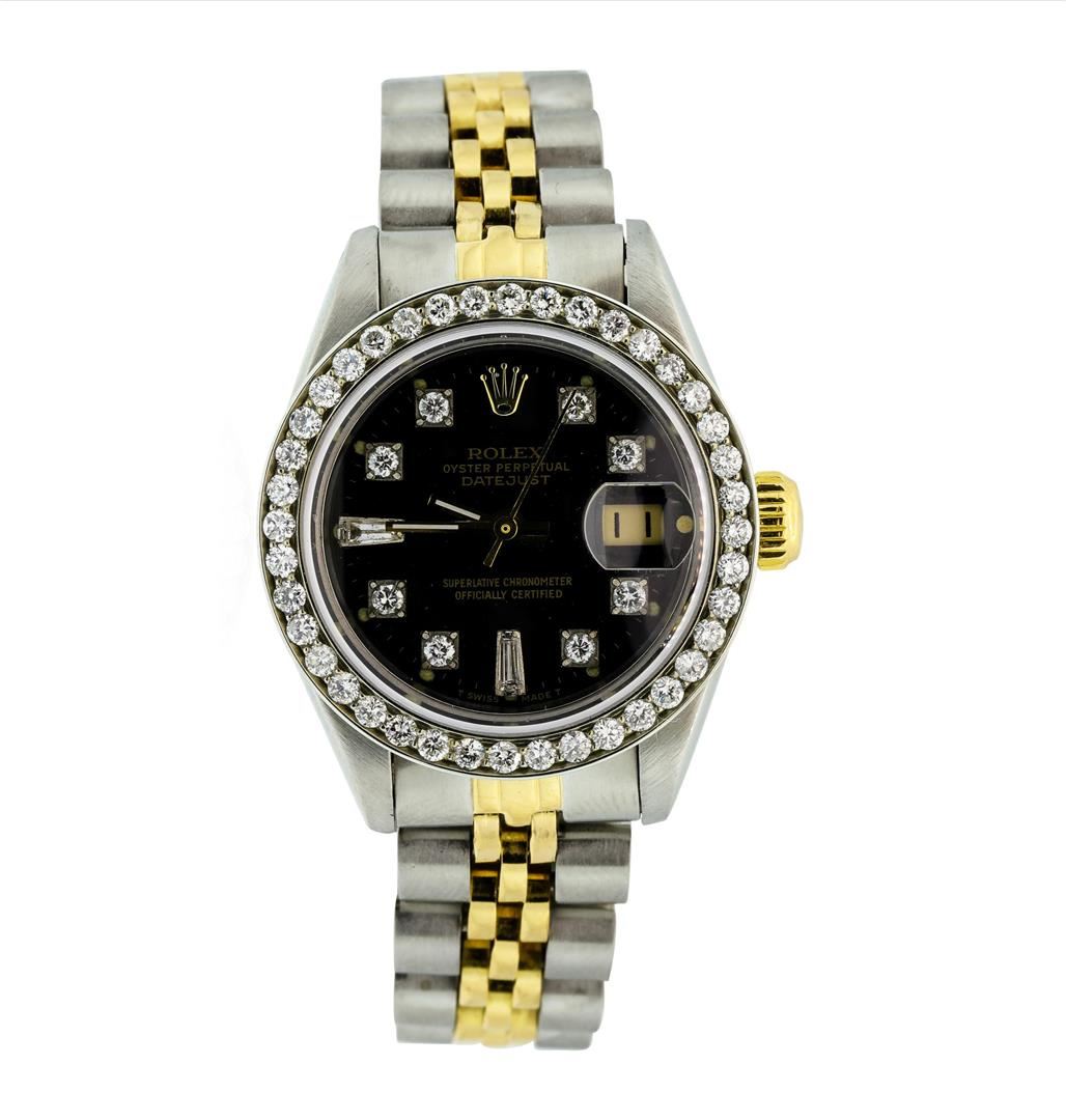 One ladies, hand crafted & machine milled Rolex DateJust Model wristwatch electronically tested, Stainless Steel Case: 26mm oyster, Rolex Signature Crown: 14KT yellow gold twinlock with high relief logo, Custom Bezel: diamond set, Custom Crystal: synthetic sapphire cyclops lens, Circa: 1982.Movement: superlative chronometer, Custom Dial: Black color, with baton hands, and diamond markers, Date Window: 3 o'clock position date display, Champagne color, non-quick set, Condition: G-5 Fine. Rolex Bracelet: stainless steel and 14KT yellow gold jubilee links. Bright polish & brushed finish. Six inch length, adjustable. Rolex Hallmarked clasp, with logo. Containing: Fifty prong set round brilliant & baguette cut diamonds, approximate total weight of 50 Stones = 1.00ct. Set & graded in the bezel and on the dial. Clarity: SI-2 to I-2. Color: F - H. Total Weight of Diamonds 1.00ct. Total Weight of Watch 50.40gm. Containing: Forty-Eight prong set round brilliant cut diamonds, measuring 1.70 - 1.70 x 1.02mm (depth est.) approximate total weight of 48 Stones = 0.86ct. Graded in the setting. Clarity: SI-2 to I-2. Color: F - H Two prong set baguette cut (tapered) diamonds, measuring from 2.70 x 1.10 x 0.77mm (depth est.) to 2.80 x 1.10 x 0.77mm (depth est.) approximate total weight of 2 Stones = 0.04ct. Graded in the setting. Clarity: SI-1 to SI-2. Color: G - H. Total Weight of Diamonds 0.90ct. AIG Appraised.