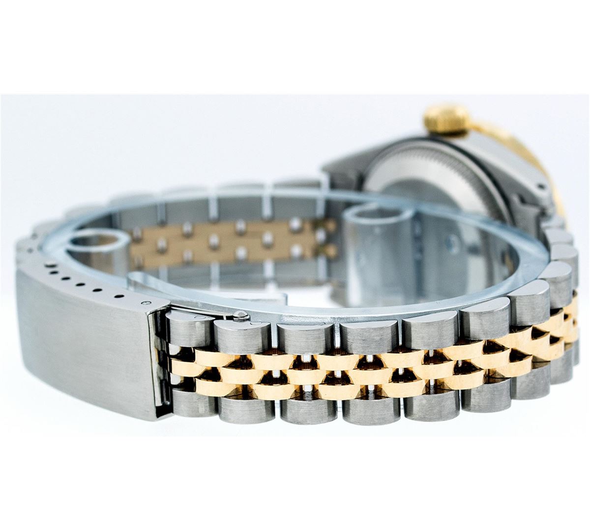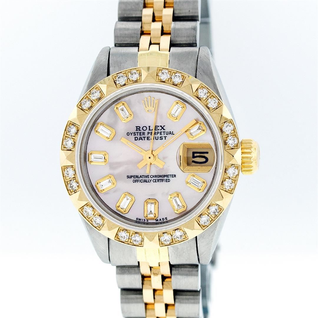 One Ladies Two Tone Rolex Datejust Polished, Serviced & Electronically Tested, 14K Yellow Gold & Stainless Steel Case:26mm, 14K Yellow Gold Crown, Custom Bezel: 18K Yellow Gold Pyramid Diamond Bezel, Diamond Count: 24 Diamonds Total Weight .70 Carat, Clarity: Si-VS, Color: G to H. Custom Crystal: Synthetic Sapphire Cyclops Lens. Movement: Automatic Winding Movement Caliber 2030. Custom Dial: Pink Mother Of Pearl Baguette Diamond Hour Markers. 10 Baguette Diamonds In Dial, Clarity: Si-VS, Color: G to H. Date Window: 3 O'Clock Position Date Display, Model: Datejust. Condition: G-6 Extra Fine. Bracelet: Two Tone 14K Yellow Gold & Stainless Steel Jubilee. Bright Polish. 6.0 Inch Length, Adjustable. Standard Clasp, With Rolex Logo.