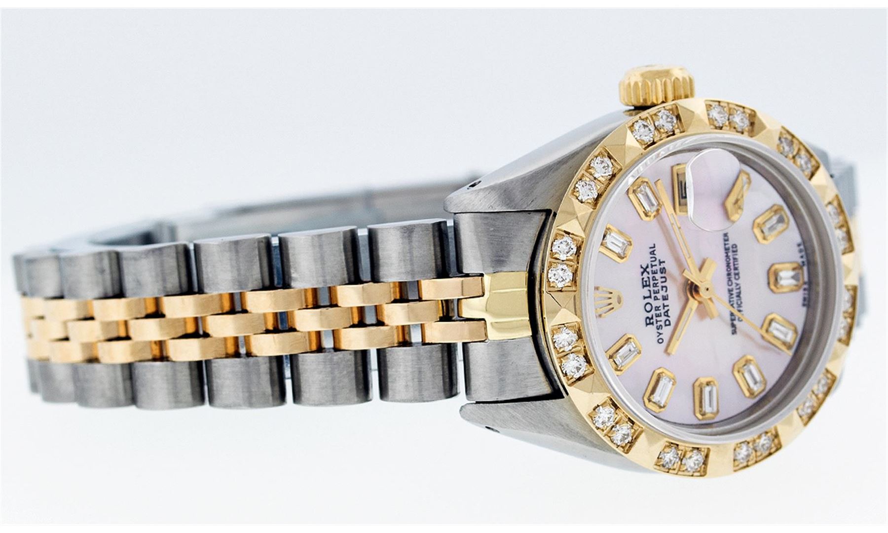 One Ladies Two Tone Rolex Datejust Polished, Serviced & Electronically Tested, 14K Yellow Gold & Stainless Steel Case:26mm, 14K Yellow Gold Crown, Custom Bezel: 18K Yellow Gold Pyramid Diamond Bezel, Diamond Count: 24 Diamonds Total Weight .70 Carat, Clarity: Si-VS, Color: G to H. Custom Crystal: Synthetic Sapphire Cyclops Lens. Movement: Automatic Winding Movement Caliber 2030. Custom Dial: Pink Mother Of Pearl Baguette Diamond Hour Markers. 10 Baguette Diamonds In Dial, Clarity: Si-VS, Color: G to H. Date Window: 3 O'Clock Position Date Display, Model: Datejust. Condition: G-6 Extra Fine. Bracelet: Two Tone 14K Yellow Gold & Stainless Steel Jubilee. Bright Polish. 6.0 Inch Length, Adjustable. Standard Clasp, With Rolex Logo.