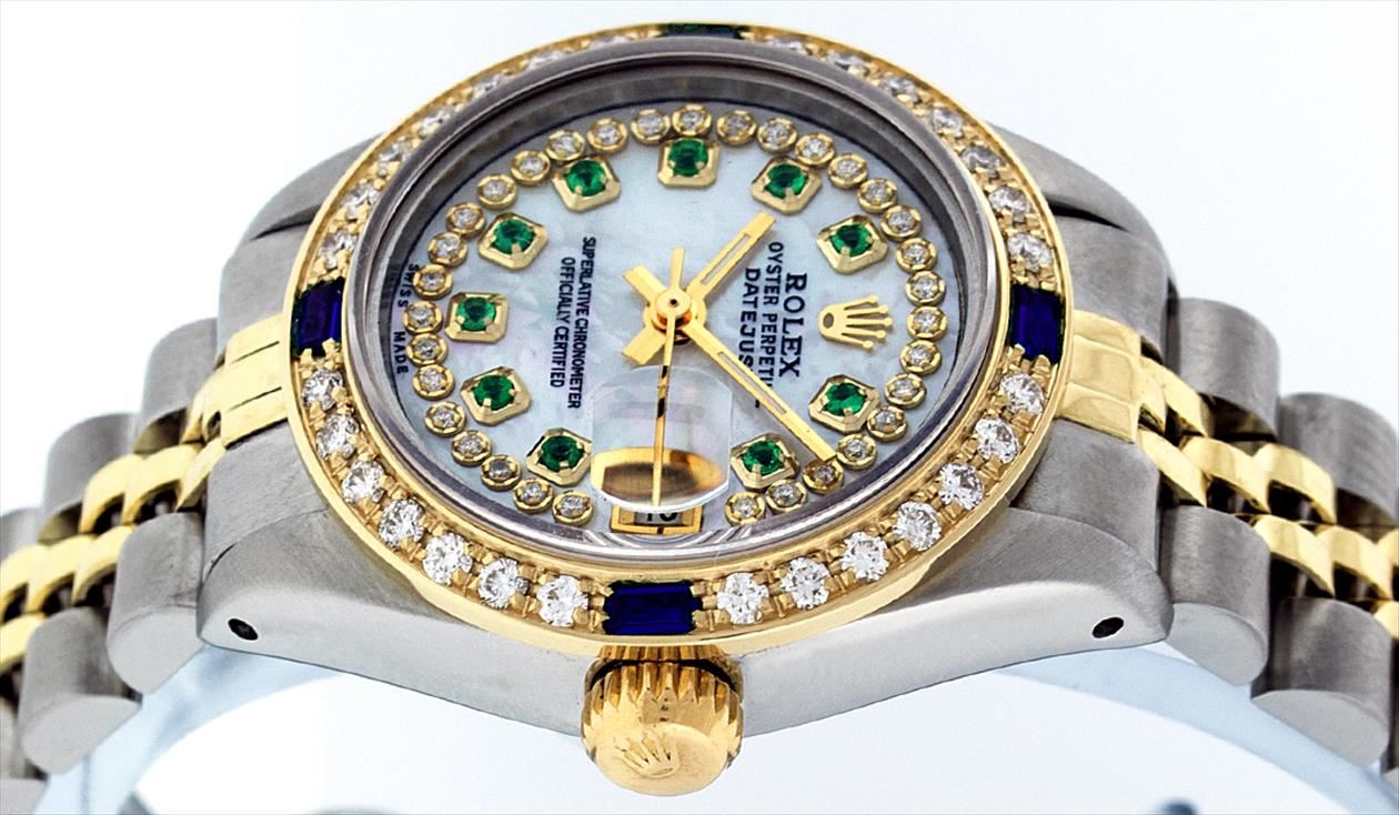 One Ladies Two Tone Rolex Datejust Polished, Serviced & Electronically Tested, 14K Yellow Gold & Stainless Steel Case:26mm, 14K Yellow Gold Crown, Custom Bezel: 18K Yellow Gold Sapphire Beadset Diamond Bezel, Diamond Count: 28 Diamonds + 4 Sapphires. Total Weight .70 Carat, Clarity: Si-VS, Color: G to H. Custom Crystal: Synthetic Sapphire Cyclops Lens. Movement: Automatic Winding Movement Caliber 2030. Custom Dial: Mother Of Pearl With Emerald String Diamond Hour Markers. Stone Count: 10 Emeralds + 33 Diamonds In Dial, Clarity: SI-VS, Color: G to H. Date Window: 3 O'Clock Position Date Display, Model: Datejust. Condition: G-6 Extra Fine. Bracelet: Two Tone 14K Yellow Gold & Stainless Steel Jubilee Band. Bright Polish. 6.0 Inch Length, Adjustable. Standard Clasp, With Rolex Logo.