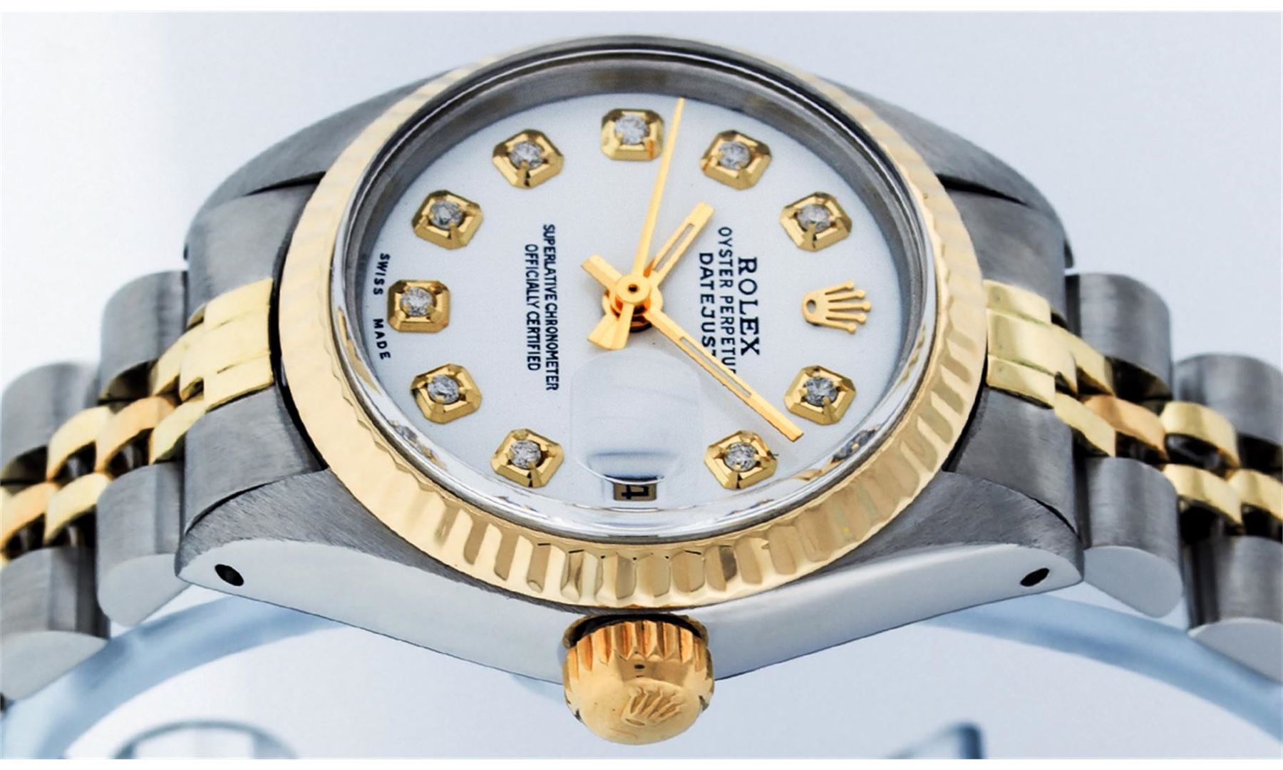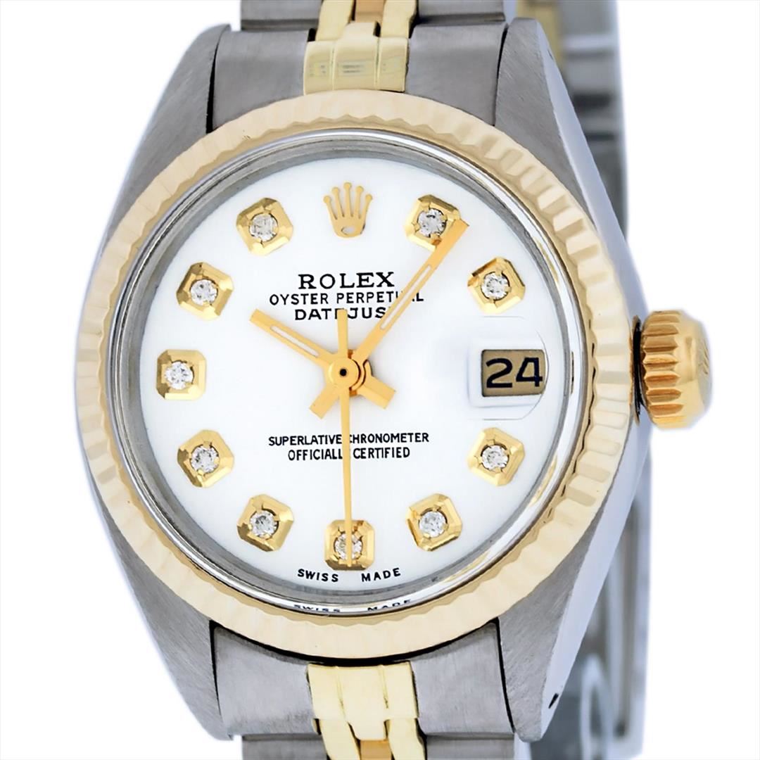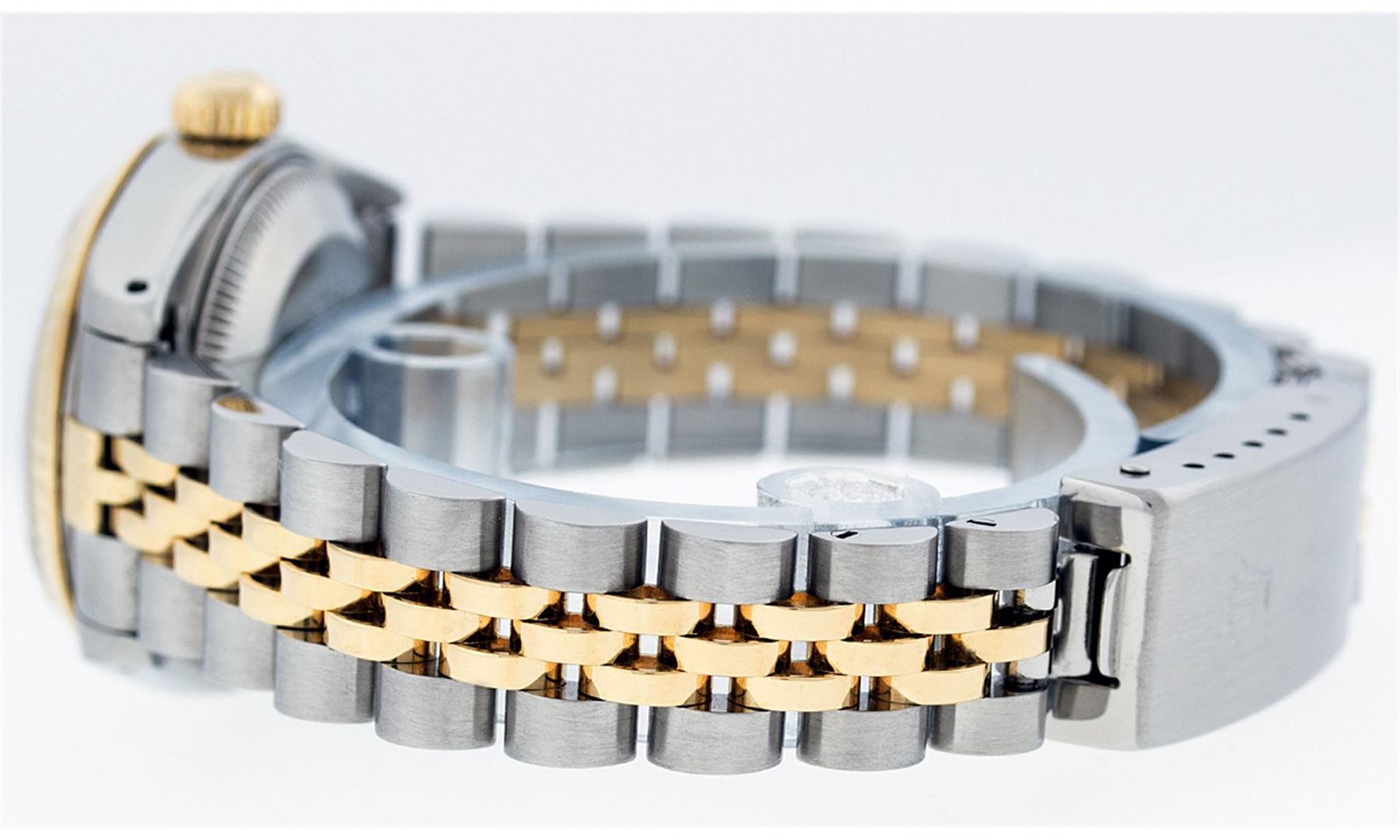 One Ladies Two Tone Rolex Datejust Polished, Serviced & Electronically Tested, 14K Yellow Gold & Stainless Steel Case:26mm, 14K Yellow Gold Crown, Bezel: 14K Yellow Gold Fluted Bezel. Custom Crystal: Acrylic Cyclops Lens. Movement: Automatic Winding Movement Caliber 2030. Custom Dial: Mother Of Pearl With Diamond Hour Markers, Diamond Count: 10 Diamonds, Color: G to H, Clarity: VS2-SI1. Date Window: 3 O'Clock Position Date Display, Model: Datejust. Condition: G-6 Extra Fine. Bracelet: Two Tone 14K Yellow Gold & Stainless Steel Jubilee. Bright Polish. 6.0 Inch Length, Adjustable. Standard Clasp, With Rolex Logo.