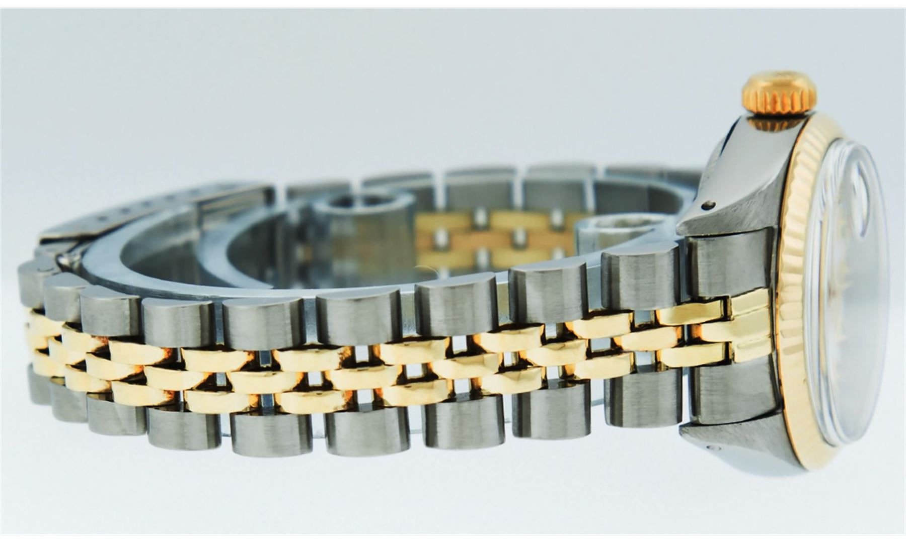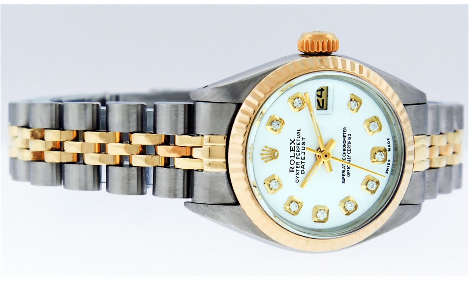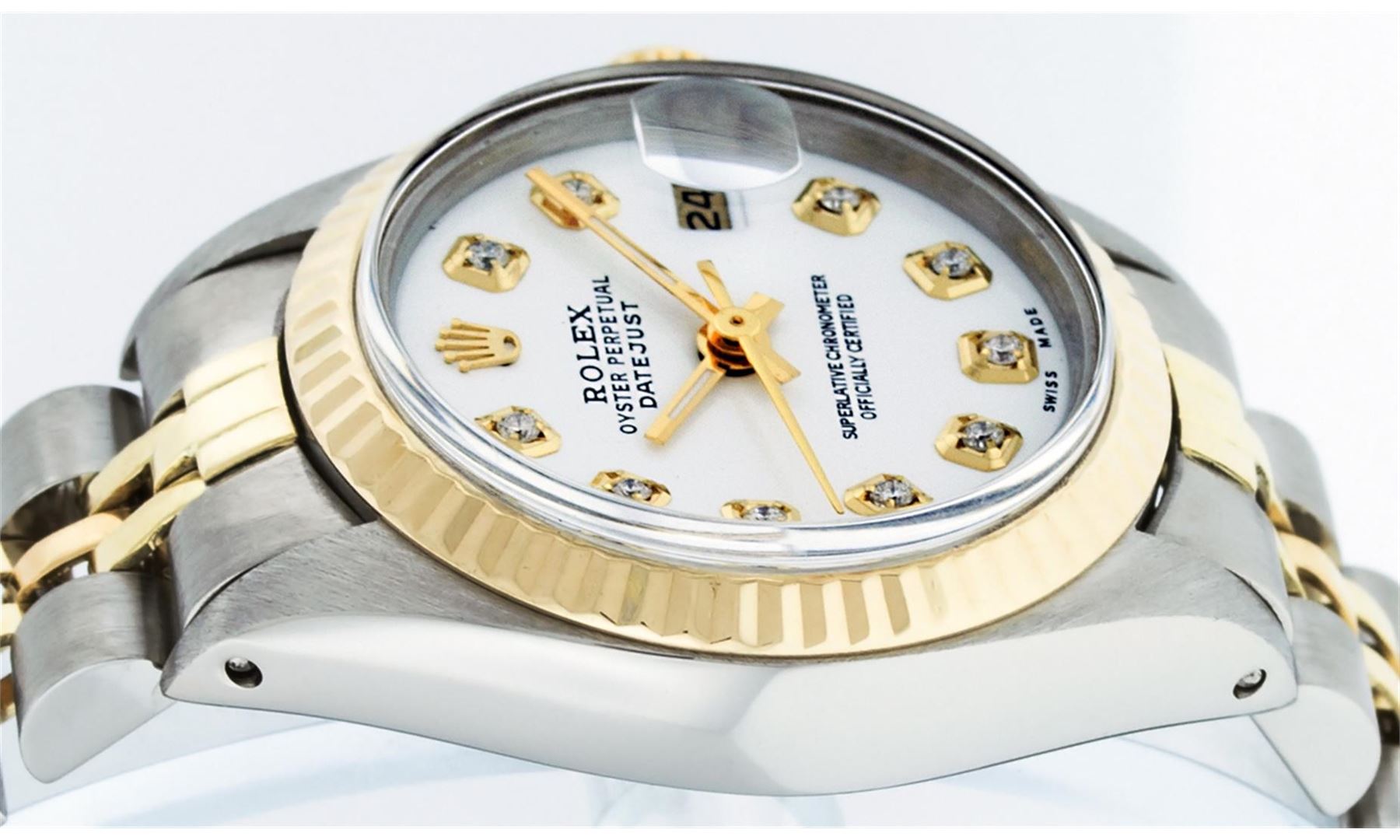 One Ladies Two Tone Rolex Datejust Polished, Serviced & Electronically Tested, 14K Yellow Gold & Stainless Steel Case:26mm, 14K Yellow Gold Crown, Bezel: 14K Yellow Gold Fluted Bezel. Custom Crystal: Acrylic Cyclops Lens. Movement: Automatic Winding Movement Caliber 2030. Custom Dial: Mother Of Pearl With Diamond Hour Markers, Diamond Count: 10 Diamonds, Color: G to H, Clarity: VS2-SI1. Date Window: 3 O'Clock Position Date Display, Model: Datejust. Condition: G-6 Extra Fine. Bracelet: Two Tone 14K Yellow Gold & Stainless Steel Jubilee. Bright Polish. 6.0 Inch Length, Adjustable. Standard Clasp, With Rolex Logo.