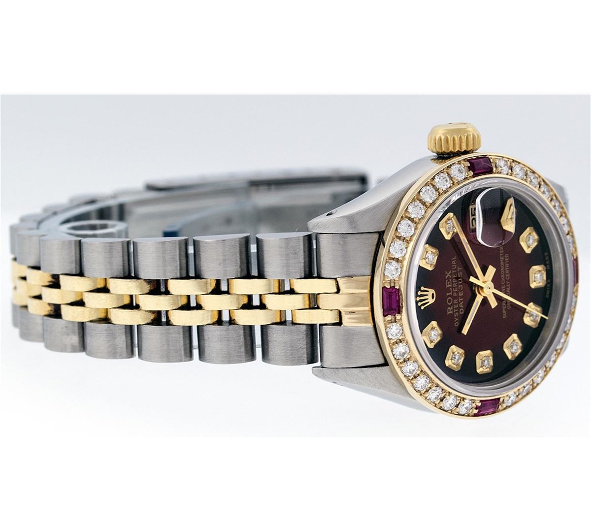 One Ladies Two Tone Rolex Datejust Polished, Serviced & Electronically Tested, 14K Yellow Gold & Stainless Steel Case:26mm, 14K Yellow Gold Crown, Custom Bezel: 18K Yellow Gold Ruby Beadset Diamond Bezel, Diamond Count: 28 Diamonds + 4 Rubies Total Weight .70 Carat, Clarity: Si-VS, Color: G to H. Custom Crystal: Synthetic Sapphire Cyclops Lens. Movement: Automatic Winding Movement Caliber 2030. Custom Dial: Dark Red Vignette With Diamond Hour Markers. Diamond Count: 10 Diamonds In Dial, Clarity:Si-VS, Color: G to H. Date Window: 3 O'Clock Position Date Display, Non Quickset, Model: Datejust. Condition: G-6 Extra Fine. Bracelet: Two Tone 14K Yellow Gold & Stainless Steel Jubilee. Bright Polish. 6.0 Inch Length, Adjustable. Standard Clasp, With Rolex Logo.
