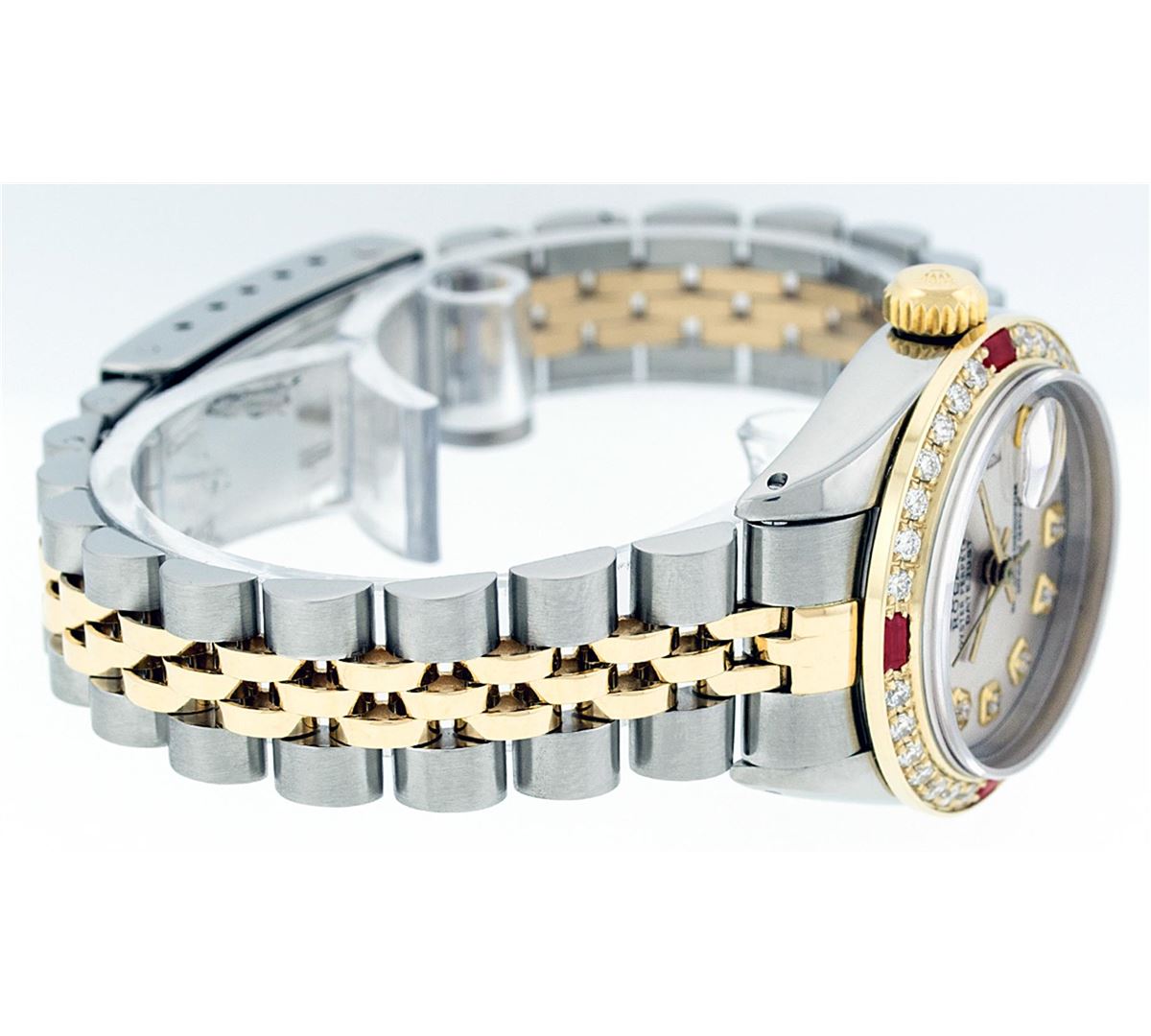 One Ladies Two Tone Rolex Datejust Polished, Serviced & Electronically Tested, 14K Yellow Gold & Stainless Steel Case:26mm, 14K Yellow Gold Crown, Custom Bezel: 18K Yellow Gold Ruby Beadset Diamond Bezel, Diamond Count: 28 Diamonds + 4 Rubies Total Weight .70 Carat, Clarity: Si-VS, Color: G to H. Custom Crystal: Synthetic Sapphire Cyclops Lens. Movement: Automatic Winding Movement Caliber 2030. Custom Dial: Silver With Diamond Hour Markers. 10 Diamonds In Dial, Clarity: Si-VS, Color: G to H. Date Window: 3 O'Clock Position Date Display, Model: Datejust, Condition: G-6 Extra Fine. Bracelet: Two Tone 14K Yellow Gold & Stainless Steel Jubilee. Bright Polish. 6.0 Inch Length, Adjustable. Standard Clasp, With Rolex Logo.