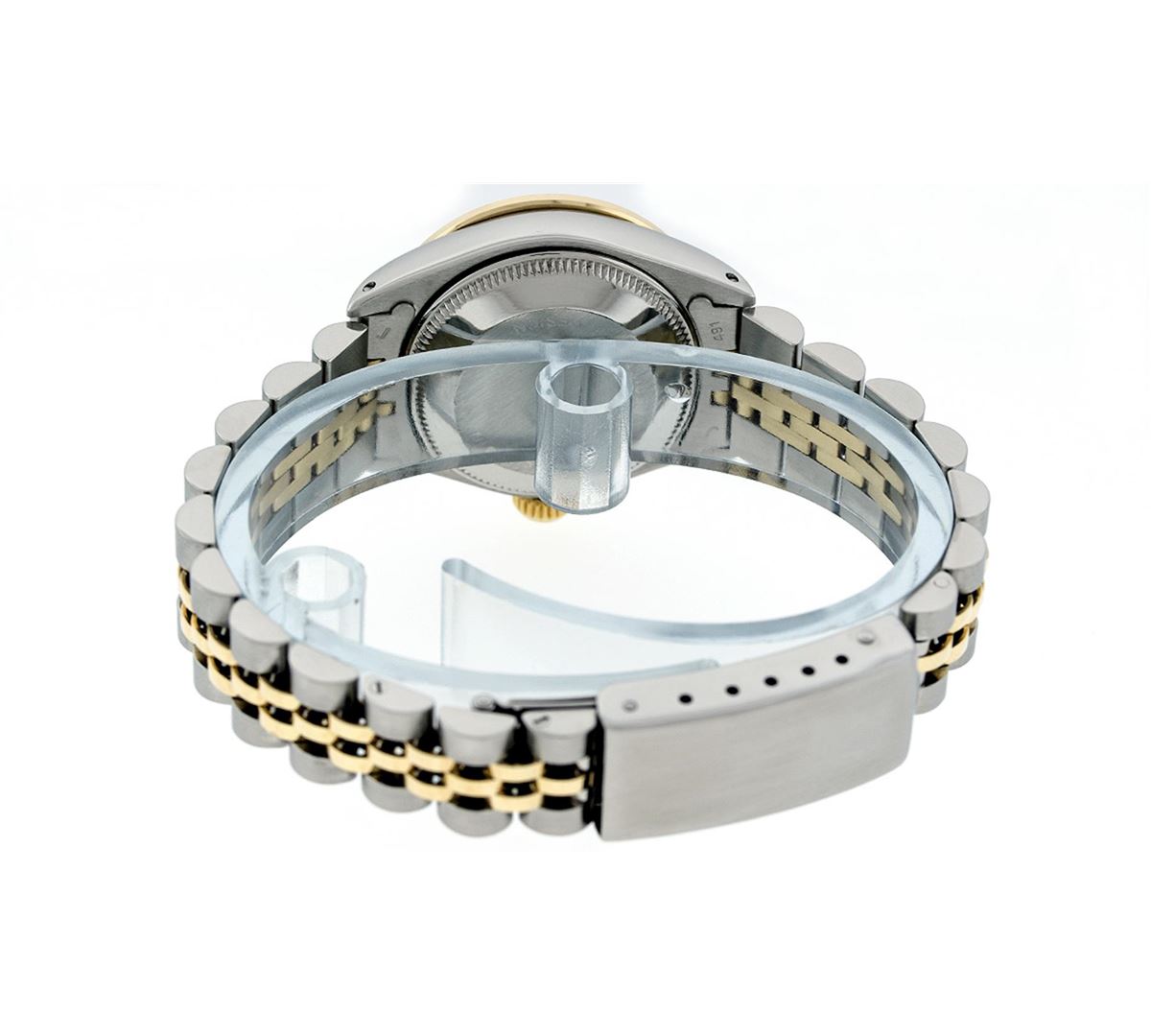 One Ladies Two Tone Rolex Datejust Polished, Serviced & Electronically Tested, 14K Yellow Gold & Stainless Steel Case:26mm, 14K Yellow Gold Crown, Custom Bezel: 18K Yellow Gold Ruby Beadset Diamond Bezel, Diamond Count: 28 Diamonds + 4 Rubies Total Weight .70 Carat, Clarity: Si-VS, Color: G to H. Custom Crystal: Synthetic Sapphire Cyclops Lens. Movement: Automatic Winding Movement Caliber 2030. Custom Dial: Dark Red Vignette With Diamond Hour Markers. Diamond Count: 10 Diamonds In Dial, Clarity:Si-VS, Color: G to H. Date Window: 3 O'Clock Position Date Display, Non Quickset, Model: Datejust. Condition: G-6 Extra Fine. Bracelet: Two Tone 14K Yellow Gold & Stainless Steel Jubilee. Bright Polish. 6.0 Inch Length, Adjustable. Standard Clasp, With Rolex Logo.
