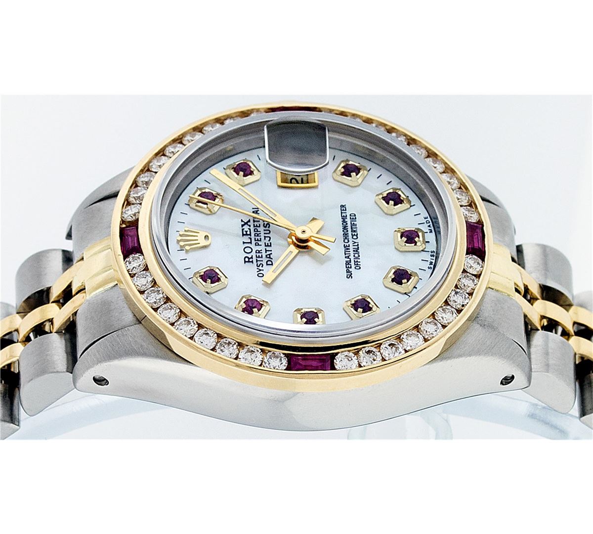 One Ladies Two Tone Rolex Datejust Polished, Serviced & Electronically Tested, 14K Yellow Gold & Stainless Steel Case:26mm, 14K Yellow Gold Crown, Custom Bezel: 18K Yellow Gold Ruby Channel Set Diamond Bezel, Diamond + Gem Count: 36 Diamonds + 4 Rubies Total Weight 1.00 Carat, Clarity: Si-VS, Color: G to H. Custom Crystal: Synthetic Sapphire Cyclops Lens. Movement: Automatic Winding Movement Caliber 2030. Custom Dial: Mother Of Pearl with Ruby Hour Markers, 10 Rubies. Date Window: 3 O'Clock Position Date Display, Model: Datejust, Condition: G-6 Extra Fine. Bracelet: Two Tone 14K Yellow Gold & Stainless Steel Jubilee. Bright Polish. 6.0 Inch Length, Adjustable. Standard Clasp, With Rolex Logo.