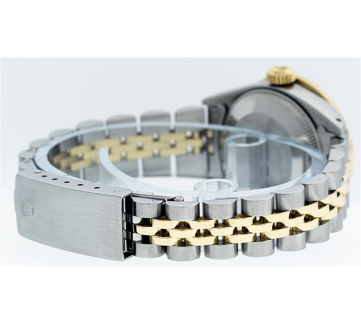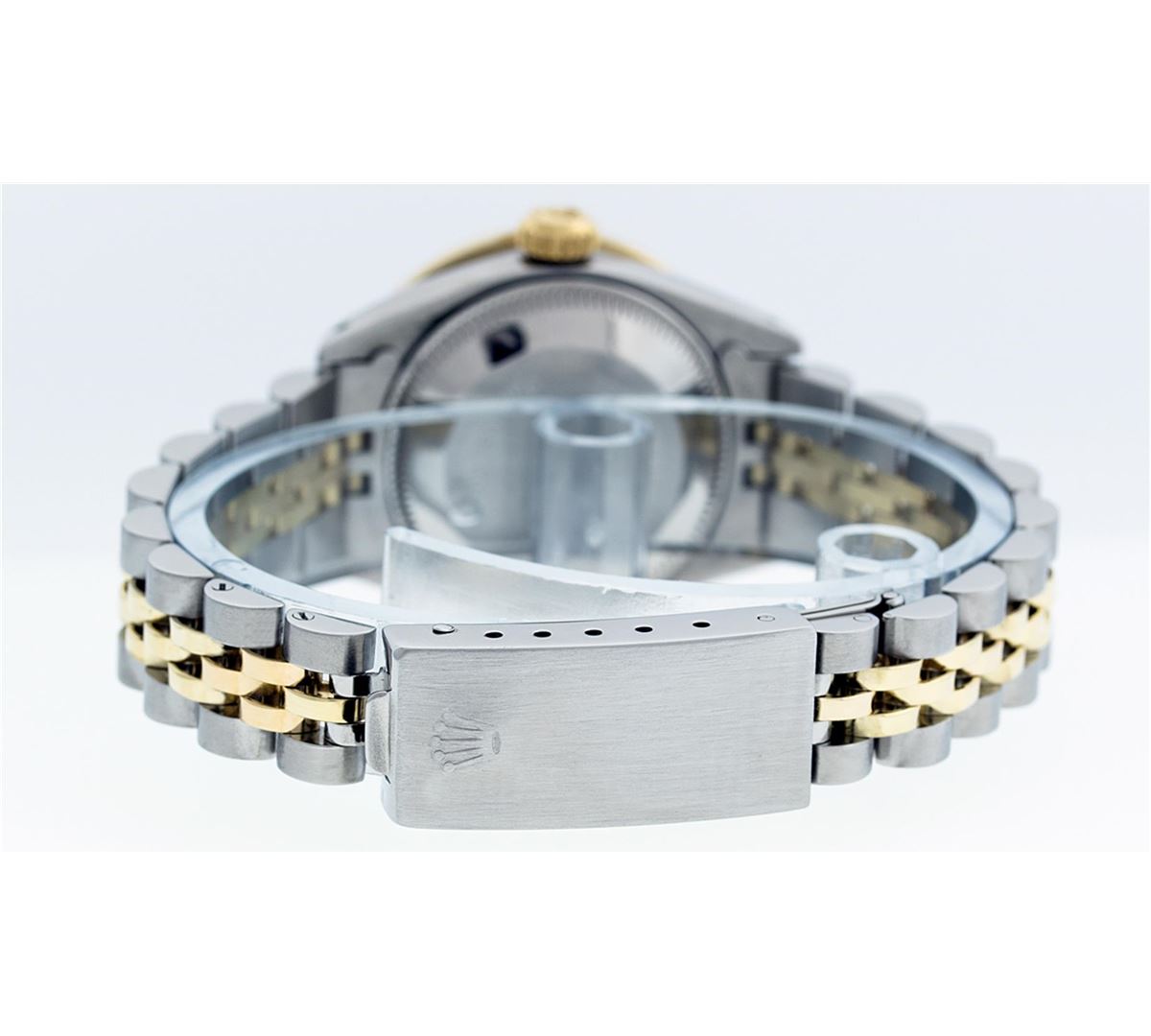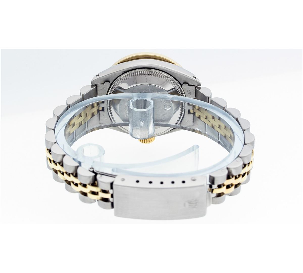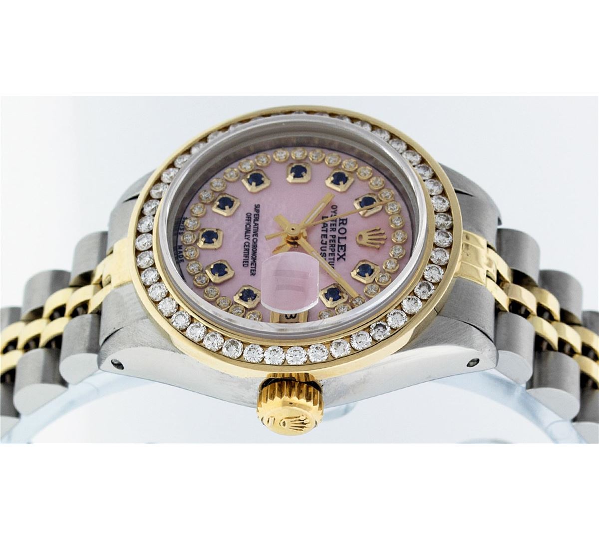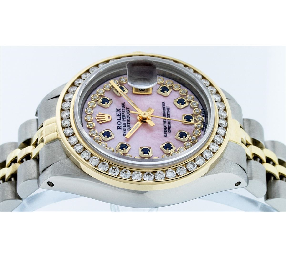 One Ladies Two Tone Rolex Datejust Polished, Serviced & Electronically Tested, 14K Yellow Gold & Stainless Steel Case:26mm, 14K Yellow Gold Crown, Custom Bezel: 18K Yellow Gold Channel Set Diamond Bezel, Diamond Count: 44 Diamonds Total Weight 1.00 Carat, Clarity: Si-VS, Color: G to H. Custom Crystal: Synthetic Sapphire Cyclops Lens. Movement: Automatic Winding Movement Caliber 2030. Custom Dial: Pink Mother Of Pearl With Sapphire String Diamond Dial, Stone Count: 10 Sapphires + 33 Diamonds. Date Window: 3 O'Clock Position Date Display, Model: Datejust. Condition: G-6 Extra Fine. Bracelet: Two Tone 14K Yellow Gold & Stainless Steel Jubilee. Bright Polish. 6.0 Inch Length, Adjustable. Standard Clasp, With Rolex Logo.
