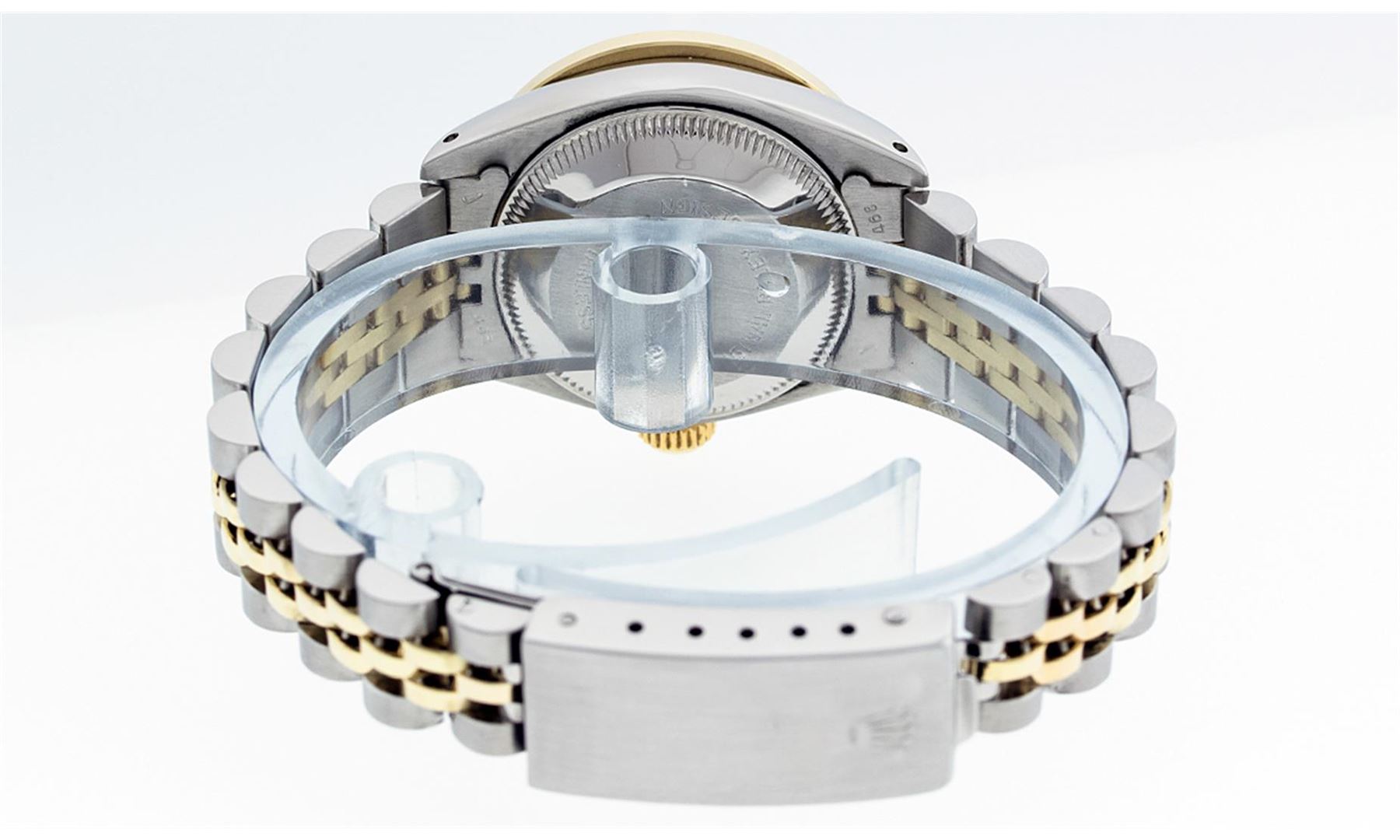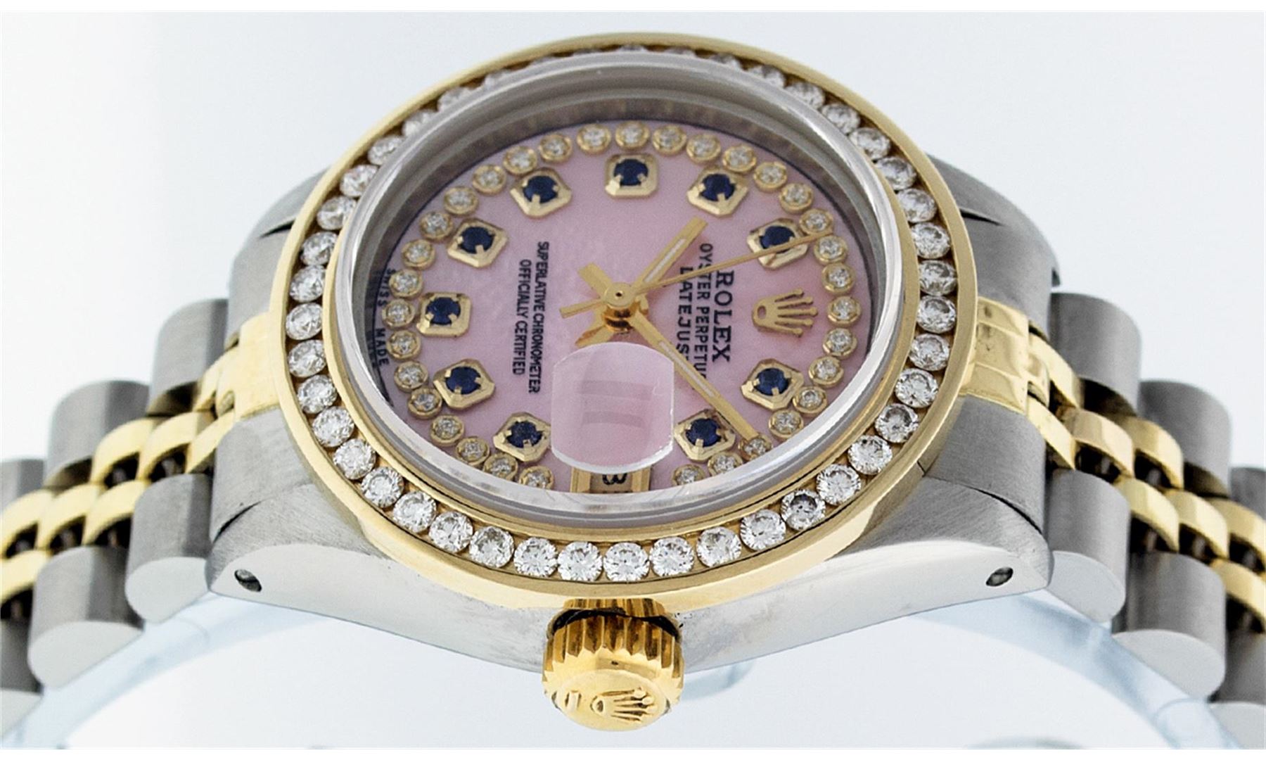One Ladies Two Tone Rolex Datejust Polished, Serviced & Electronically Tested, 14K Yellow Gold & Stainless Steel Case:26mm, 14K Yellow Gold Crown, Custom Bezel: 18K Yellow Gold Channel Set Diamond Bezel, Diamond Count: 44 Diamonds Total Weight 1.00 Carat, Clarity: Si-VS, Color: G to H. Custom Crystal: Synthetic Sapphire Cyclops Lens. Movement: Automatic Winding Movement Caliber 2030. Custom Dial: Pink Mother Of Pearl With Sapphire String Diamond Dial, Stone Count: 10 Sapphires + 33 Diamonds. Date Window: 3 O'Clock Position Date Display, Model: Datejust. Condition: G-6 Extra Fine. Bracelet: Two Tone 14K Yellow Gold & Stainless Steel Jubilee. Bright Polish. 6.0 Inch Length, Adjustable. Standard Clasp, With Rolex Logo.
