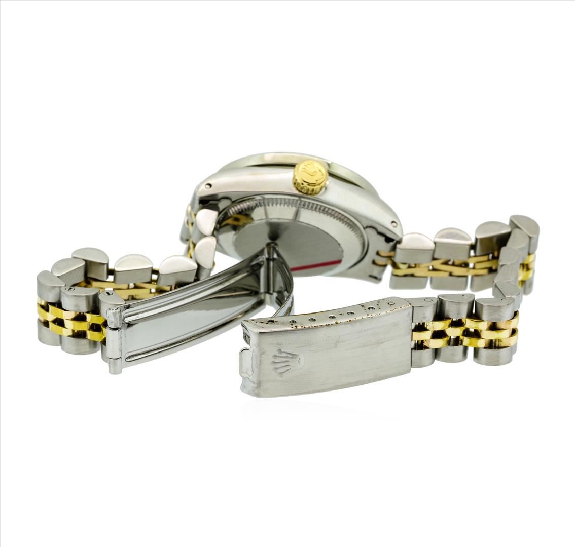 One ladies, hand crafted & machine milled Rolex DateJust Model wristwatch electronically tested, Stainless Steel Case: 26mm oyster, Rolex Signature Crown: 14KT yellow gold twinlock with high relief logo, Custom Bezel: diamond set, Custom Crystal: synthetic sapphire cyclops lens, Circa: 1973.Movement: superlative chronometer, Custom Dial: Black color, with baton hands, and diamond markers, Date Window: 3 o'clock position date display, White color, non-quick set, Condition: G-5 Fine. Rolex Bracelet: stainless steel and 14KT yellow gold jubilee links. Bright polish & brushed finish. Six and three quarter inch length, adjustable. Rolex Hallmarked clasp, with logo. Containing: Fifty prong set round brilliant cut diamonds, measuring 1.80 - 1.20mm (depth est.) approximate total weight of 50 Stones = 1.00ct. Set & graded in the bezel and on the dial. Clarity: SI-2 to I-1. Color: F - H. Total Weight of Diamonds 1.00ct. Total Weight of Watch 51.58gm. AIG Appraised at $6,440.00.