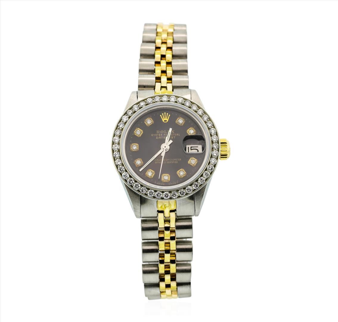 One ladies, hand crafted & machine milled Rolex DateJust Model wristwatch electronically tested, Stainless Steel Case: 26mm oyster, Rolex Signature Crown: 14KT yellow gold twinlock with high relief logo, Custom Bezel: diamond set, Custom Crystal: synthetic sapphire cyclops lens, Circa: 1973.Movement: superlative chronometer, Custom Dial: Black color, with baton hands, and diamond markers, Date Window: 3 o'clock position date display, White color, non-quick set, Condition: G-5 Fine. Rolex Bracelet: stainless steel and 14KT yellow gold jubilee links. Bright polish & brushed finish. Six and three quarter inch length, adjustable. Rolex Hallmarked clasp, with logo. Containing: Fifty prong set round brilliant cut diamonds, measuring 1.80 - 1.20mm (depth est.) approximate total weight of 50 Stones = 1.00ct. Set & graded in the bezel and on the dial. Clarity: SI-2 to I-1. Color: F - H. Total Weight of Diamonds 1.00ct. Total Weight of Watch 51.58gm. AIG Appraised.