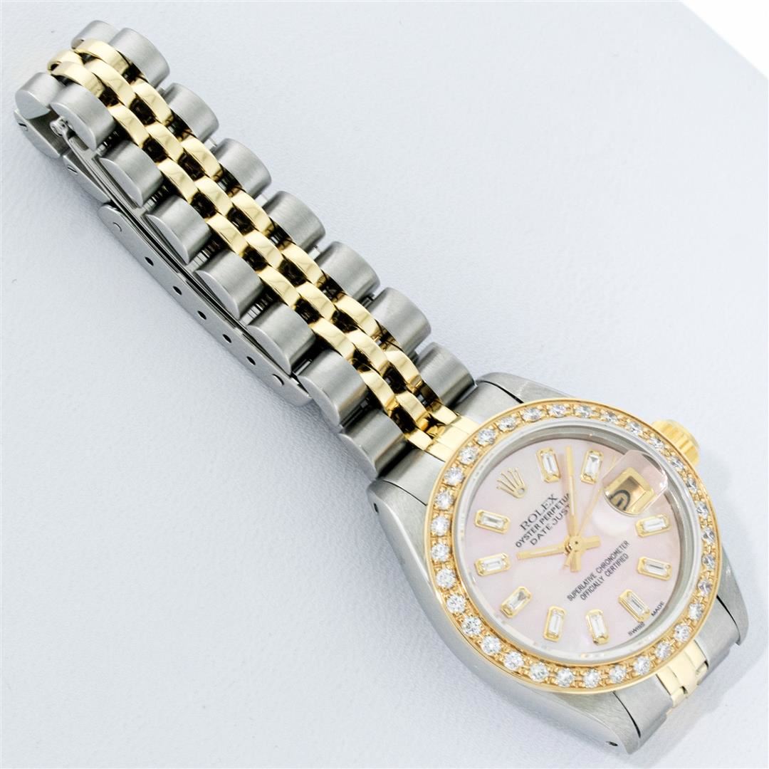 One Ladies Two Tone Rolex Datejust Polished, Serviced & Electronically Tested, Yellow Gold & Stainless Steel Case: 26mm, Yellow Gold Crown, Custom Bezel: New 18K Yellow Gold Beadset Diamond Bezel, Diamond Count: 32 Diamonds On Bezel, Total Weight .70 Carat, Clarity: SI-VS, Color: G to H. Custom Crystal: New Scratch Resistant Synthetic Sapphire Cyclops Lens. Custom Hands: New Luminescent Hands. Movement: Automatic Winding Movement.. Custom Dial: Pink MOP Baguette Diamond Dial, Diamond Count: 10 Baguette Diamonds On Dial, G To H In Color, SI-VS Clarity. Date Window: 3 O'clock Position Date Display, Model: Datejust, Condition: G-6 Extra Fine. Bracelet: Two Tone Yellow Gold & Stainless Steel Jubilee Band. Bright Polish. 6.0 Inch Length, Adjustable. Standard Clasp, With Rolex Logo. This Watch Has Been Serviced Time Tested And Is In Excellent Condition It Is Free Of All Scratches And Dents.