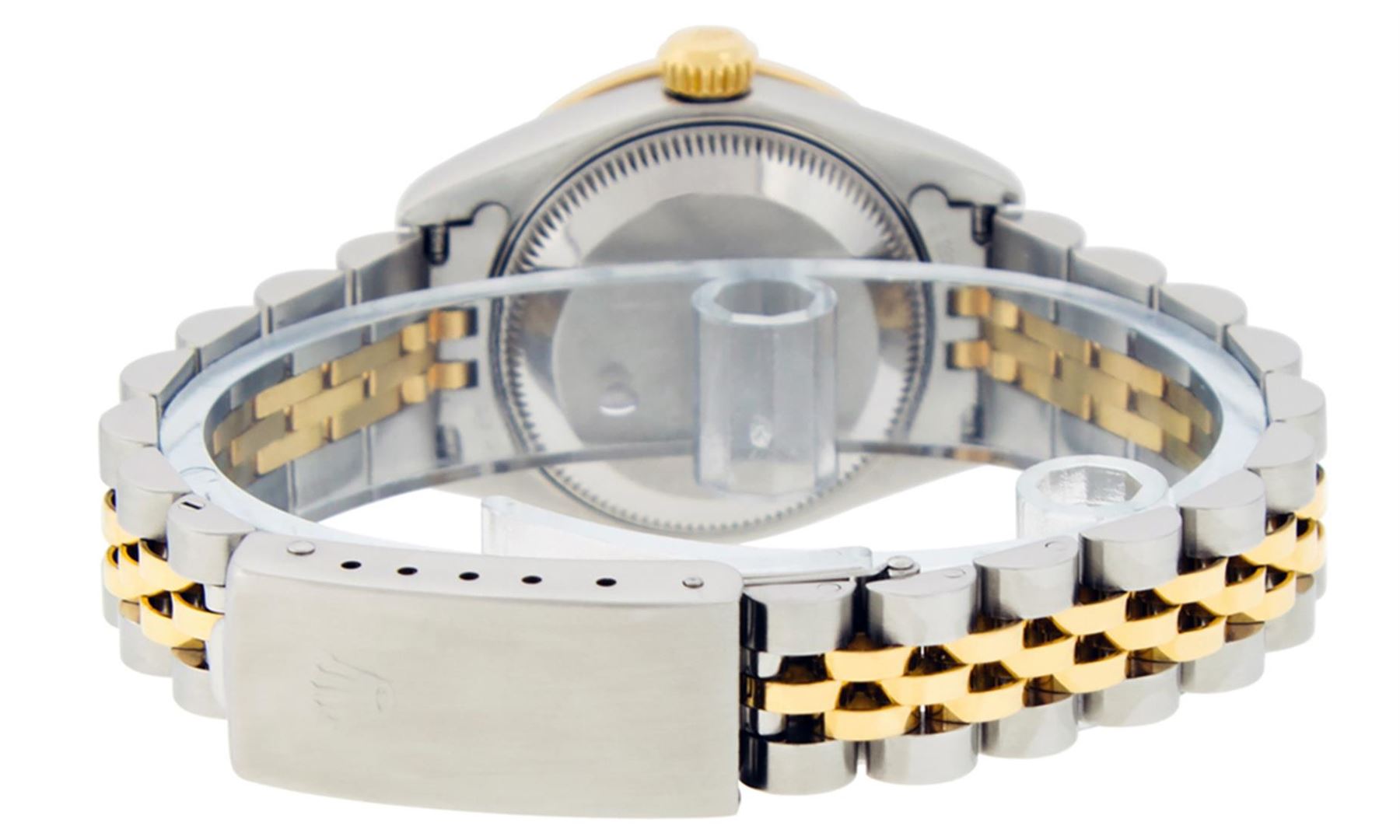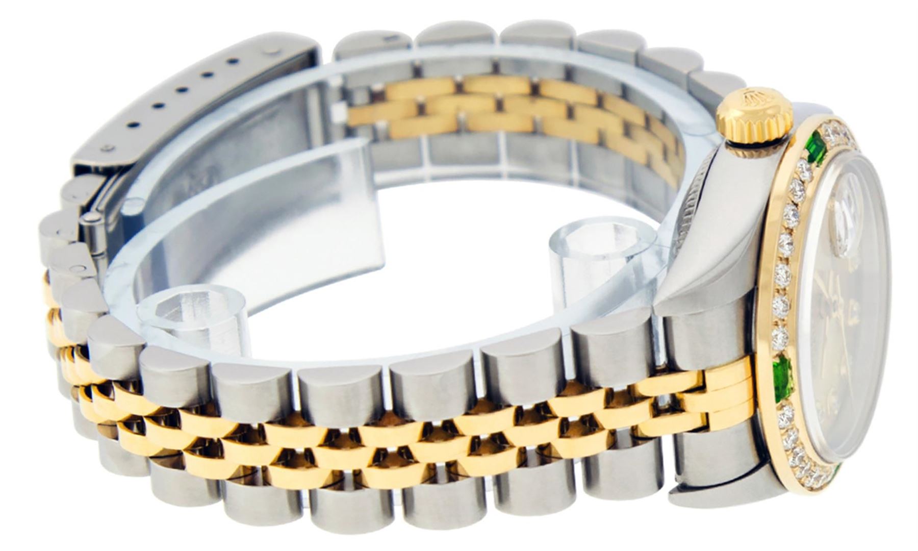 One Ladies 18K Two Tone Rolex Datejust Polished, Serviced & Electronically Tested, 18K Yellow Gold & Stainless Steel Case: 26mm, 18K Yellow Gold Crown, Custom Bezel: New 18K Yellow Gold Emerald Beadset Diamond Bezel, Diamond + Gem Count: 28 Diamonds + 4 Emeralds Total Weight .70 Carat, Clarity: SI-VS, Color: G to H. Custom Crystal: New Scratch Resistant Synthetic Sapphire Cyclops Lens. Custom Hands: New Luminescent Hands. Movement: Automatic Winding Movement Caliber 2235. Custom Dial: Champagne Dial Set With Diamond Hour Markers, Diamond Count: 10 Single Cut VS Diamonds in Dial, G To H In Color, VS Clarity. Date Window: 3 O'Clock Position Date Display, Model: Datejust, Condition: G-6 Extra Fine. Bracelet: Two Tone 18K Yellow Gold & Stainless Steel Jubilee. Bright Polish. 6.0 Inch Length, Adjustable. Standard Clasp, With Rolex Logo. This Watch Has Been Serviced Time Tested And Is In Excellent Condition It Is Free Of All Scratches And Dents.