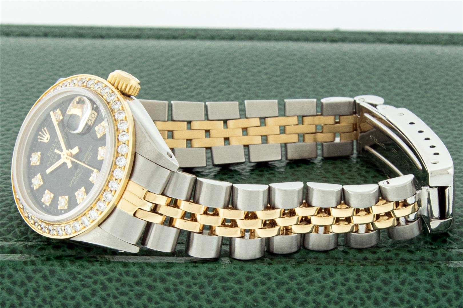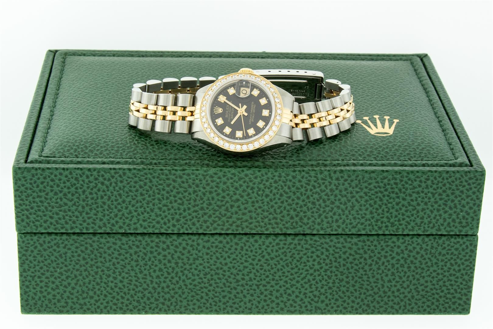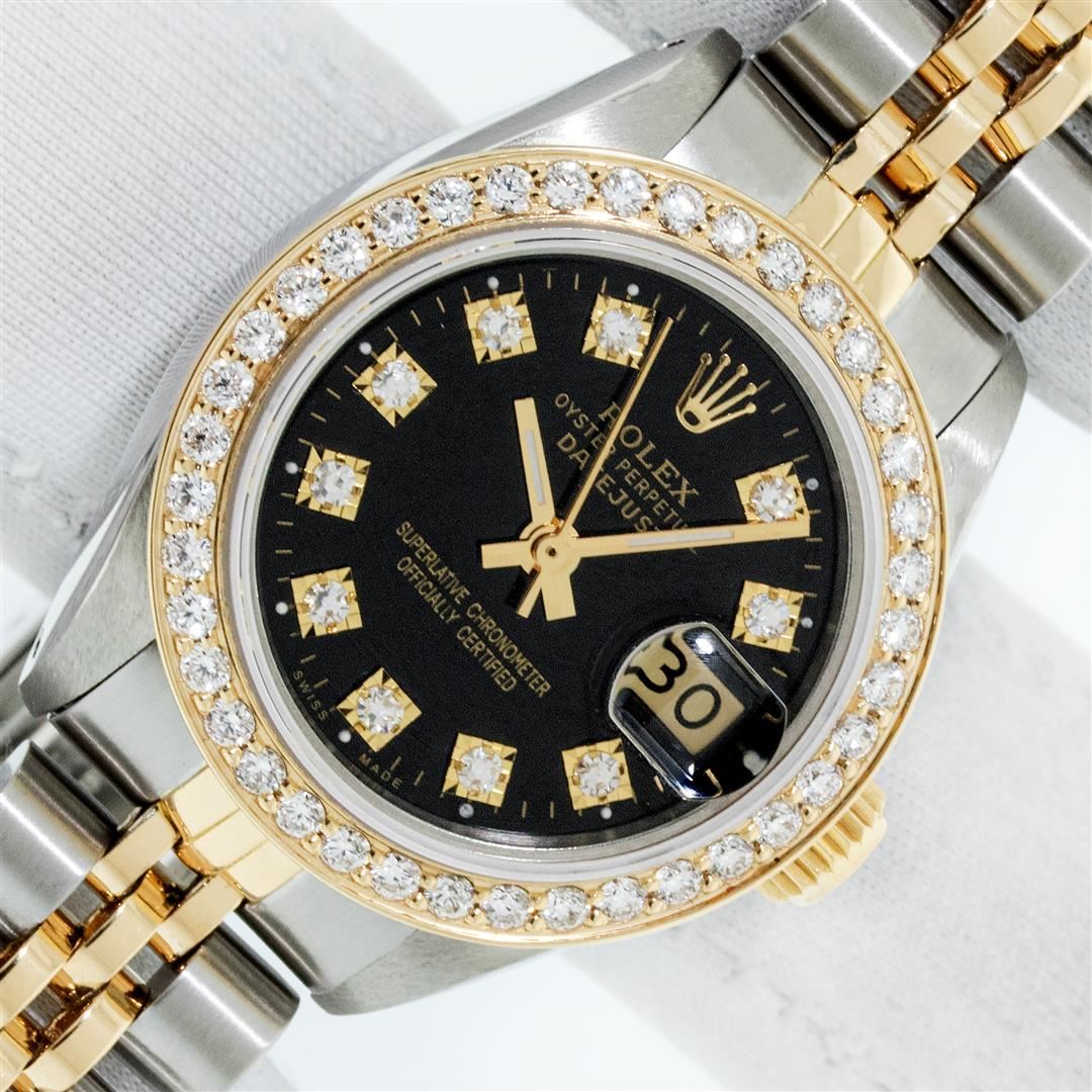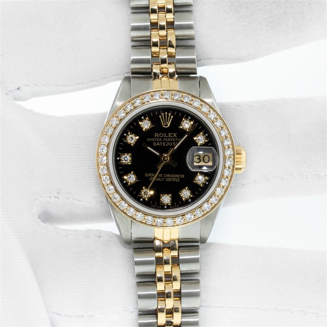 One Ladies Two Tone Rolex Datejust Polished, Serviced & Electronically Tested, Rolex Yellow Gold & Stainless Steel Case: 26mm, Rolex Yellow Gold Crown, Custom Bezel: New 18K 1ctw Yellow Gold Beadset Diamond Bezel, Diamond Count: 44 Diamonds, Total Weight 1.00 Carat, Clarity: Si-VS, Color: G to H. Custom Crystal: New Sapphire With Magnified Date Window. Custom Hands: New Luminescent Hands. Rolex Movement: Automatic Winding Movement. Custom Dial: Refinished To Black With Added Diamond Hour Markers, Diamond Count: 10 Diamonds in Dial, G To H In Color, VS Clarity. Date Window: 3 O'clock Position Date Display, Model: Datejust, Condition: G-6 Extra Fine. Rolex Bracelet: Two Tone Yellow Gold & Stainless Steel Jubilee Band. Bright Polish. 6.0 Inch Length, Adjustable. Standard Clasp, With Rolex Logo. This Pre Owned Watch Has Been Serviced Time Tested And Is In Excellent Condition It Is Free Of All Scratches And Dents. This Watch Comes With A Rolex Box.