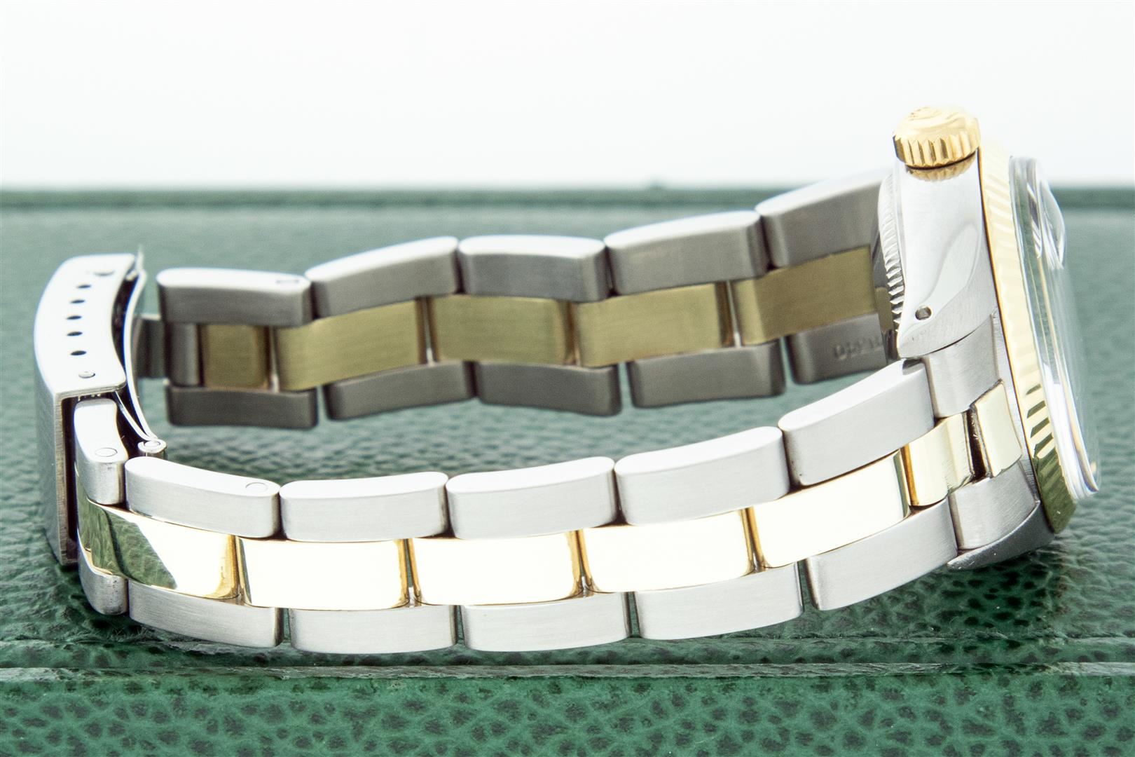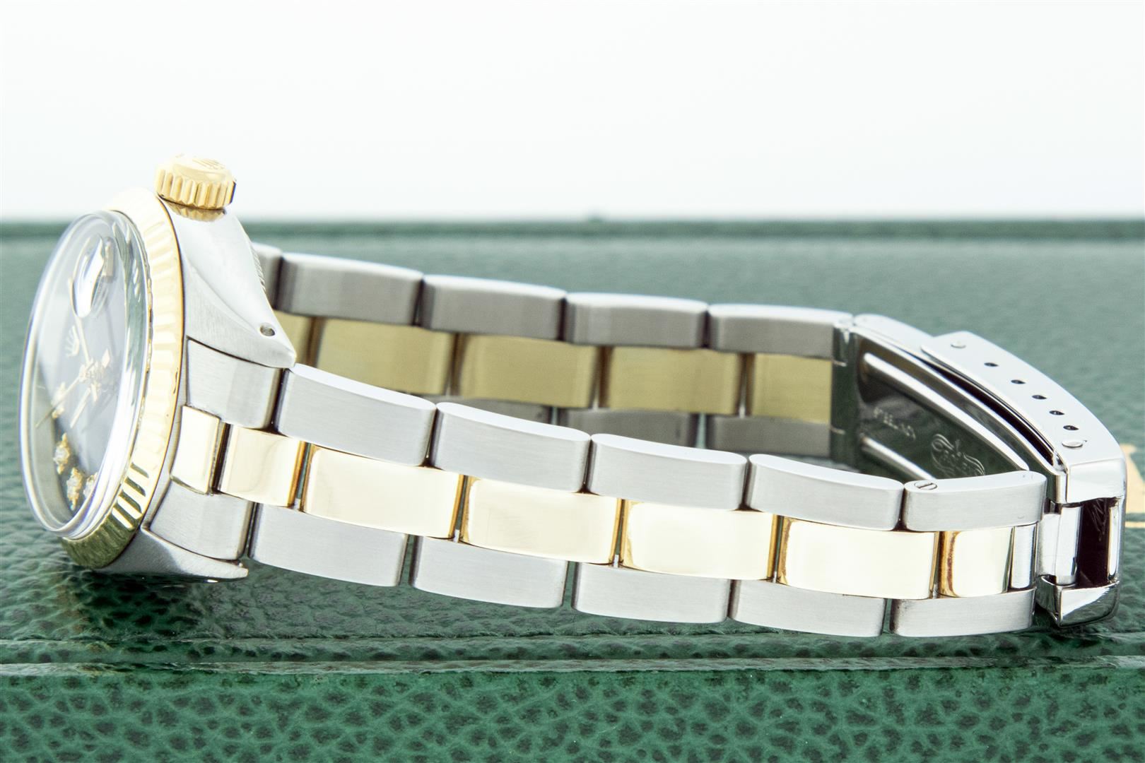 One Ladies Two Tone Rolex Datejust Polished, Serviced & Electronically Tested, Yellow Gold & Stainless Steel Case: 26mm, Yellow Gold Crown, Bezel: Yellow Gold Fluted Bezel. Custom Crystal: New Acrylic Cyclops Lens. Custom Hands: New Luminescent Hands. Movement: Automatic Winding Movement.. Custom Dial: Black With Diamond Hour Markers, Diamond Count: 10 Single Cut Diamonds, Color: G to H, Clarity: VS. Date Window: 3 O'clock Position Date Display, Model: Datejust. Condition: G-6 Extra Fine. Bracelet: Two Tone Yellow Gold & Stainless Steel Oyster Band. Bright Polish. 6.0 Inch Length, Adjustable. Standard Clasp, With Rolex Logo. This Watch Has Been Serviced Time Tested And Is In Excellent Condition It Is Free Of All Scratches And Dents. This Watch Comes With A Rolex Box.
