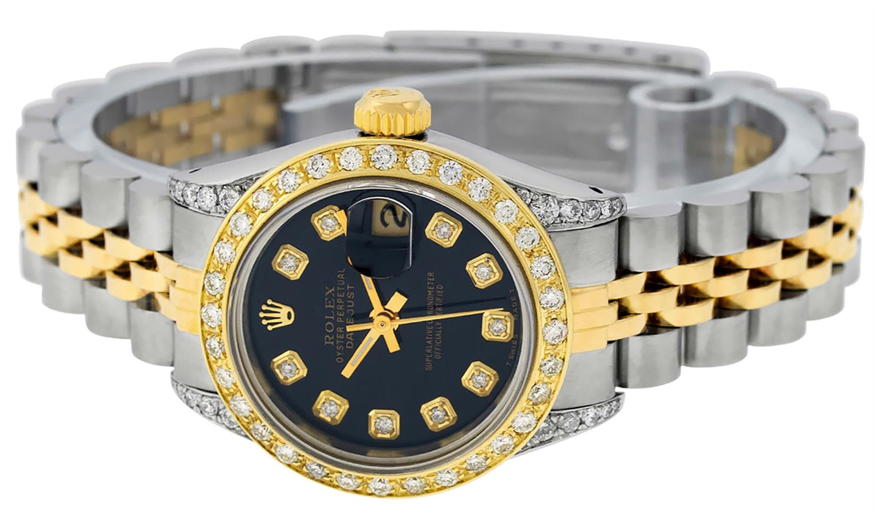One Ladies Two Tone Rolex Datejust Polished, Serviced & Electronically Tested, Yellow Gold & Stainless Steel Case: 26mm, Yellow Gold Crown, Custom Diamond Lugs: 24 Diamonds On Lugs, Clarity: SI-VS, Color: G to H, Clarity SI-VS. Custom Bezel: New 18K Yellow Gold Beadset Diamond Bezel, Diamond Count: 32 Diamonds, Total Weight .70 Carat, Clarity: SI-VS, Color: G to H. Custom Crystal: New Synthetic Sapphire Cyclops Lens. Custom Hands: New Luminescent Hands. Movement: Automatic Winding Movement. Custom Dial: Black With Diamond Hour Markers, Diamond Count: 10 Diamonds, Clarity: SI-VS, Color: G to H. Date Window: 3 O'Clock Position Date Display, Model: Datejust. Condition: G-6 Extra Fine. Bracelet: Two Tone Yellow Gold & Stainless Steel Jubilee Band. Bright Polish. 6.0 Inch Length, Adjustable. Standard Clasp, With Rolex Logo. This Watch Has Been Serviced Time Tested And Is In Excellent Condition It Is Free Of All Scratches And Dents.
