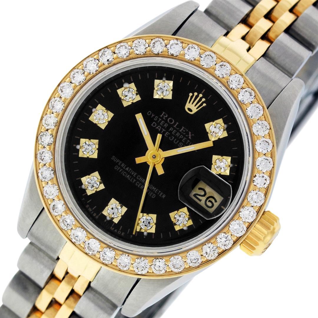 One Ladies Two Tone Rolex Datejust Polished, Serviced & Electronically Tested, Yellow Gold & Stainless Steel Case: 26mm, Yellow Gold Crown, Custom Bezel: New 18K 1ctw Yellow Gold Beadset Diamond Bezel, Diamond Count: 44 Diamonds, Total Weight 1.00 Carat, Clarity: Si-VS, Color: G to H. Custom Crystal: New Synthetic Sapphire Cyclops Lens. Custom Hands: New Luminescent Hands. Movement: Automatic Winding Movement. Custom Dial: Black Diamond Dial. Date Window: 3 O'Clock Position Date Display, Model: Datejust, Condition: G-6 Extra Fine. Bracelet: Two Tone Yellow Gold & Stainless Steel Jubilee. Bright Polish. 6.0 Inch Length, Adjustable. Standard Clasp, With Rolex Logo. This Watch Has Been Serviced Time Tested And Is In Excellent Condition It Is Free Of All Scratches And Dents.