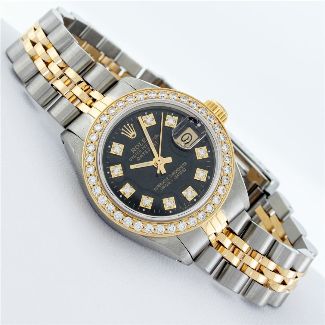 One Ladies Two Tone Rolex Datejust Polished, Serviced & Electronically Tested, Yellow Gold & Stainless Steel Case: 26mm, Yellow Gold Crown, Custom Bezel: New 18K 1ctw Yellow Gold Beadset Diamond Bezel, Diamond Count: 44 Diamonds, Total Weight 1.00 Carat, Clarity: Si-VS, Color: G to H. Custom Crystal: New Synthetic Sapphire Cyclops Lens. Custom Hands: New Luminescent Hands. Movement: Automatic Winding Movement. Custom Dial: Black, 10 Diamonds in Dial, G To H In Color, VS Clarity. Date Window: 3 O'Clock Position Date Display, Model: Datejust, Condition: G-6 Extra Fine. Bracelet: Two Tone Yellow Gold & Stainless Steel Jubilee. Bright Polish. 6.0 Inch Length, Adjustable. Standard Clasp, With Rolex Logo. This Watch Has Been Serviced Time Tested And Is In Excellent Condition It Is Free Of All Scratches And Dents.