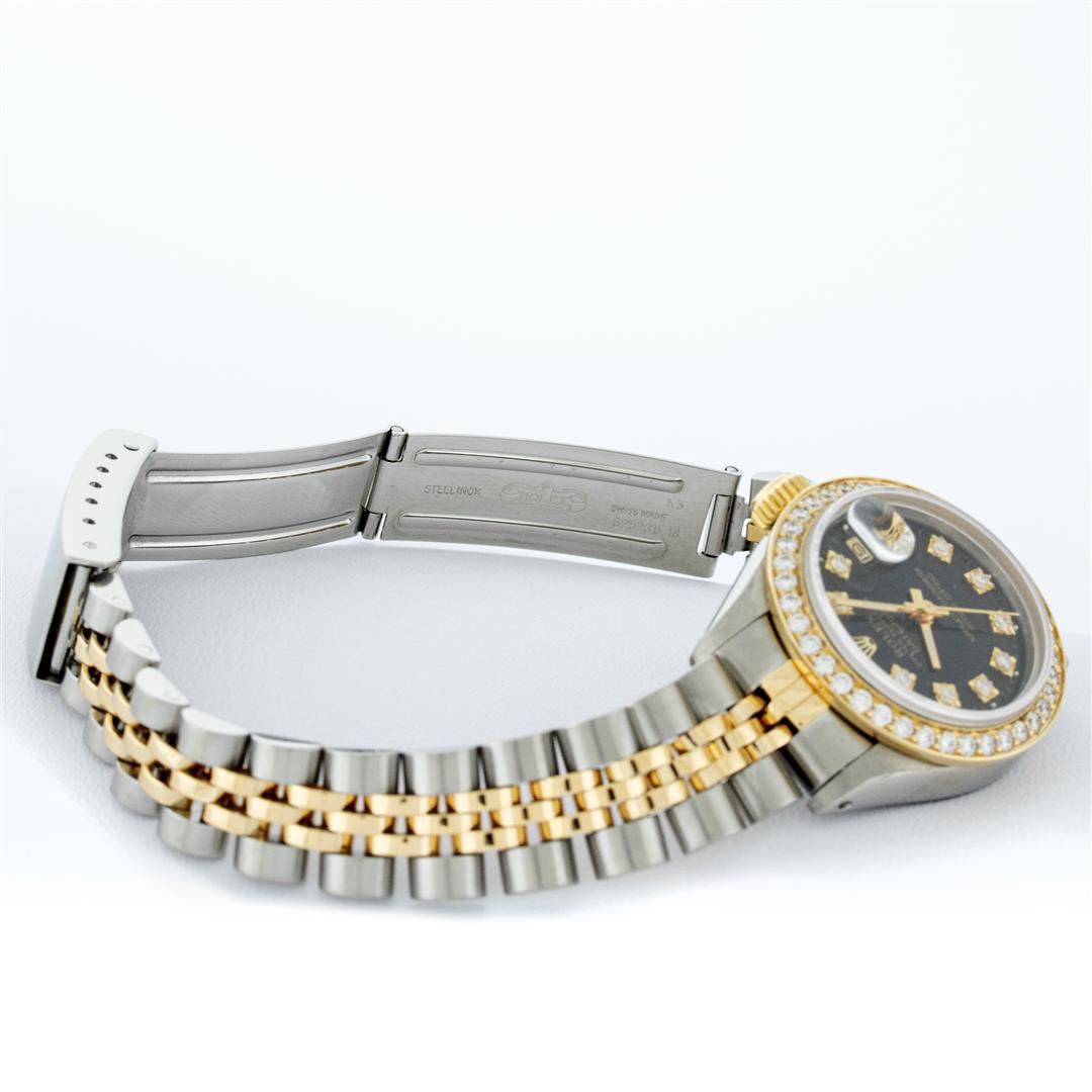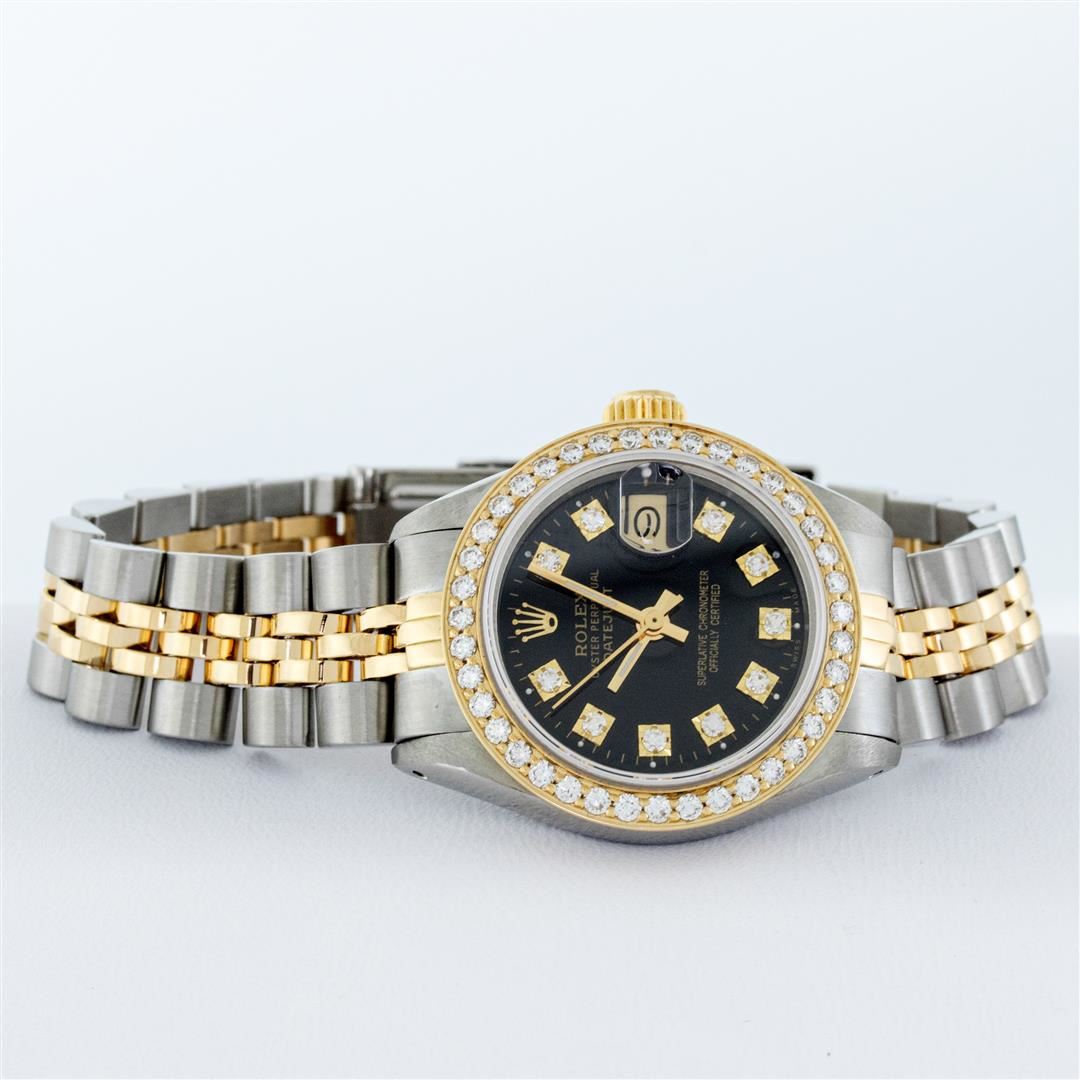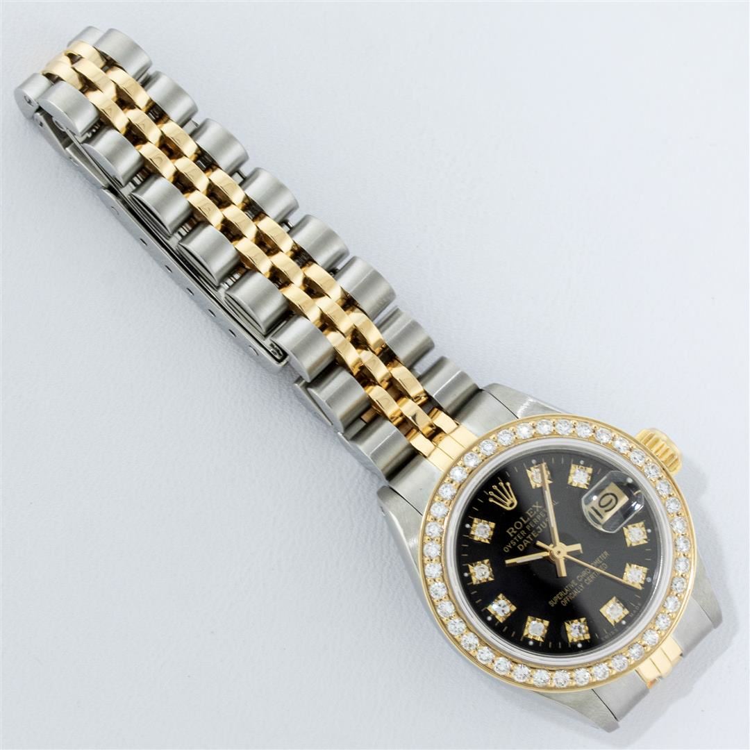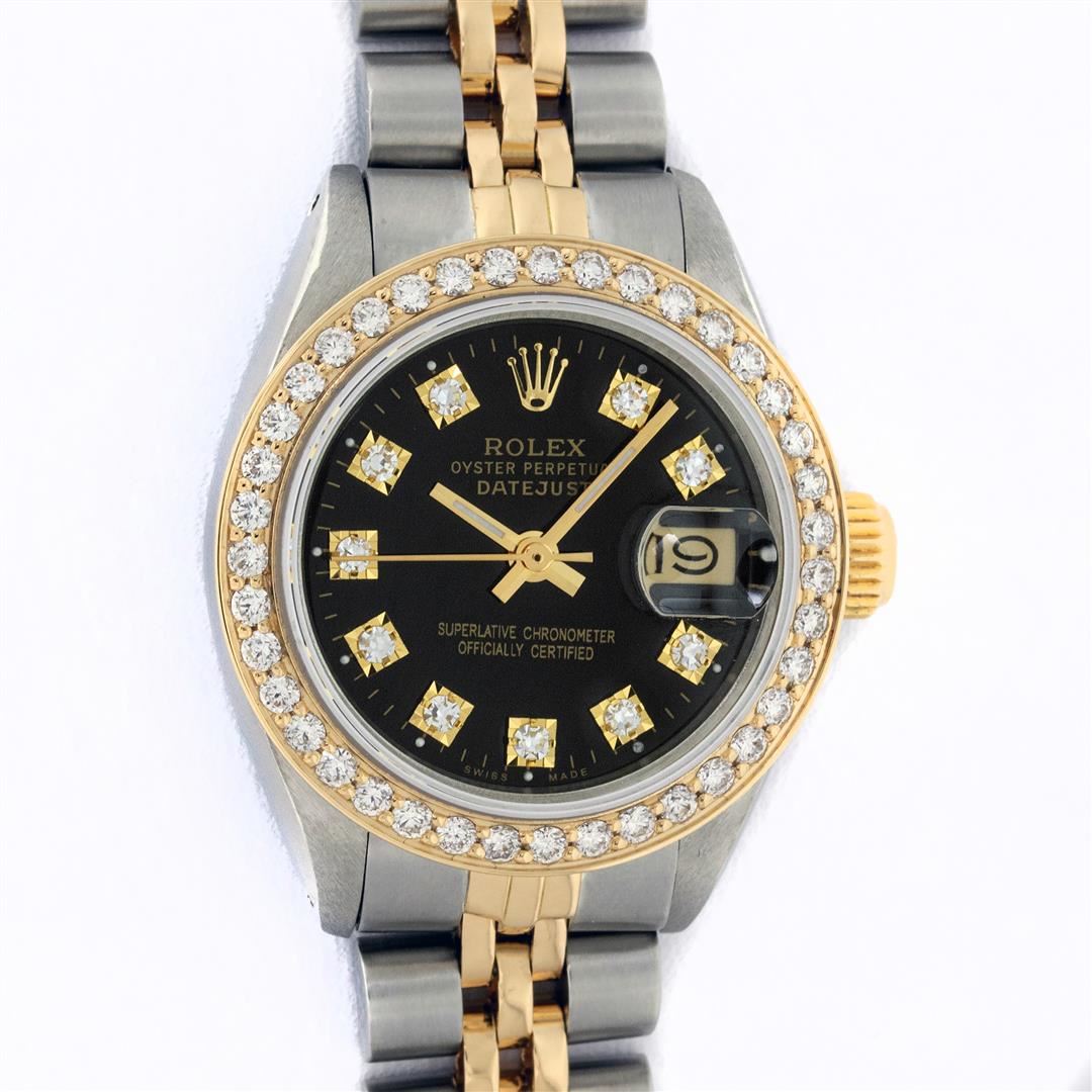 One Ladies Two Tone Rolex Datejust Polished, Serviced & Electronically Tested, Yellow Gold & Stainless Steel Case: 26mm, Yellow Gold Crown, Custom Bezel: New 18K 1ctw Yellow Gold Beadset Diamond Bezel, Diamond Count: 44 Diamonds, Total Weight 1.00 Carat, Clarity: Si-VS, Color: G to H. Custom Crystal: New Synthetic Sapphire Cyclops Lens. Custom Hands: New Luminescent Hands. Movement: Automatic Winding Movement. Custom Dial: Black, 10 Diamonds in Dial, G To H In Color, VS Clarity. Date Window: 3 O'Clock Position Date Display, Model: Datejust, Condition: G-6 Extra Fine. Bracelet: Two Tone Yellow Gold & Stainless Steel Jubilee. Bright Polish. 6.0 Inch Length, Adjustable. Standard Clasp, With Rolex Logo. This Watch Has Been Serviced Time Tested And Is In Excellent Condition It Is Free Of All Scratches And Dents.