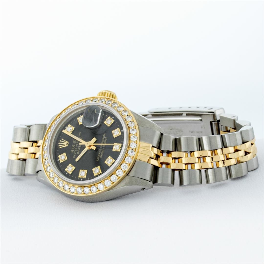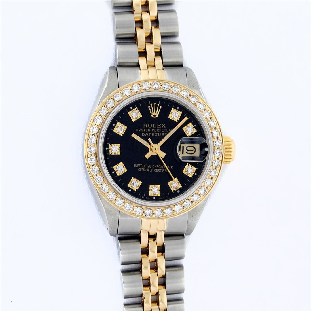 One Ladies Two Tone Rolex Datejust Polished, Serviced & Electronically Tested, Yellow Gold & Stainless Steel Case: 26mm, Yellow Gold Crown, Custom Bezel: New 18K 1ctw Yellow Gold Beadset Diamond Bezel, Diamond Count: 44 Diamonds, Total Weight 1.00 Carat, Clarity: Si-VS, Color: G to H. Custom Crystal: New Synthetic Sapphire Cyclops Lens. Custom Hands: New Luminescent Hands. Movement: Automatic Winding Movement. Custom Dial: Black, 10 Diamonds in Dial, G To H In Color, VS Clarity. Date Window: 3 O'Clock Position Date Display, Model: Datejust, Condition: G-6 Extra Fine. Bracelet: Two Tone Yellow Gold & Stainless Steel Jubilee. Bright Polish. 6.0 Inch Length, Adjustable. Standard Clasp, With Rolex Logo. This Watch Has Been Serviced Time Tested And Is In Excellent Condition It Is Free Of All Scratches And Dents.