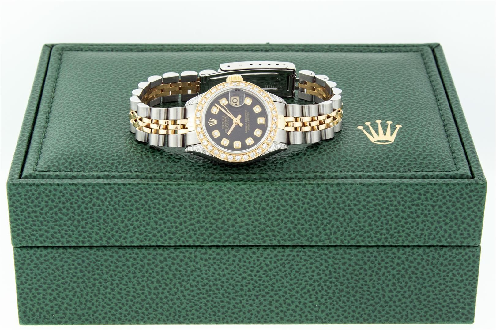 One Ladies Two Tone Rolex Oyster Perpetual Datejust Polished, Serviced & Electronically Tested, Rolex Yellow Gold & Stainless Steel Case: 26mm, Rolex Yellow Gold Crown, Custom Diamond Lugs: 24 Diamonds On Lugs, Clarity: SI-VS, Color: G to H, Clarity SI-VS. Custom Bezel: New 18K Yellow Gold Beadset Diamond Bezel, Diamond Count: 32 Diamonds, Total Weight .70 Carat, Clarity: SI-VS, Color: G to H. Custom Crystal: New Sapphire With Magnified Date Window. Custom Hands: New Luminescent Hands. Rolex Movement: Automatic Winding Movement. Custom Dial: Refinished To Black With Added Diamond Hour Markers, Diamond Count: 10 Diamonds, Clarity: SI-VS, Color: G to H. Date Window: 3 O'clock Position Date Display, Model: Datejust. Condition: G-6 Extra Fine. Rolex Bracelet: Two Tone Yellow Gold & Stainless Steel Jubilee Band. Bright Polish. 6.0 Inch Length, Adjustable. Standard Clasp, With Rolex Logo. This Pre Owned Watch Has Been Serviced Time Tested And Is In Excellent Condition It Is Free Of All Scratches And Dents. This Watch Comes With A Rolex Box.