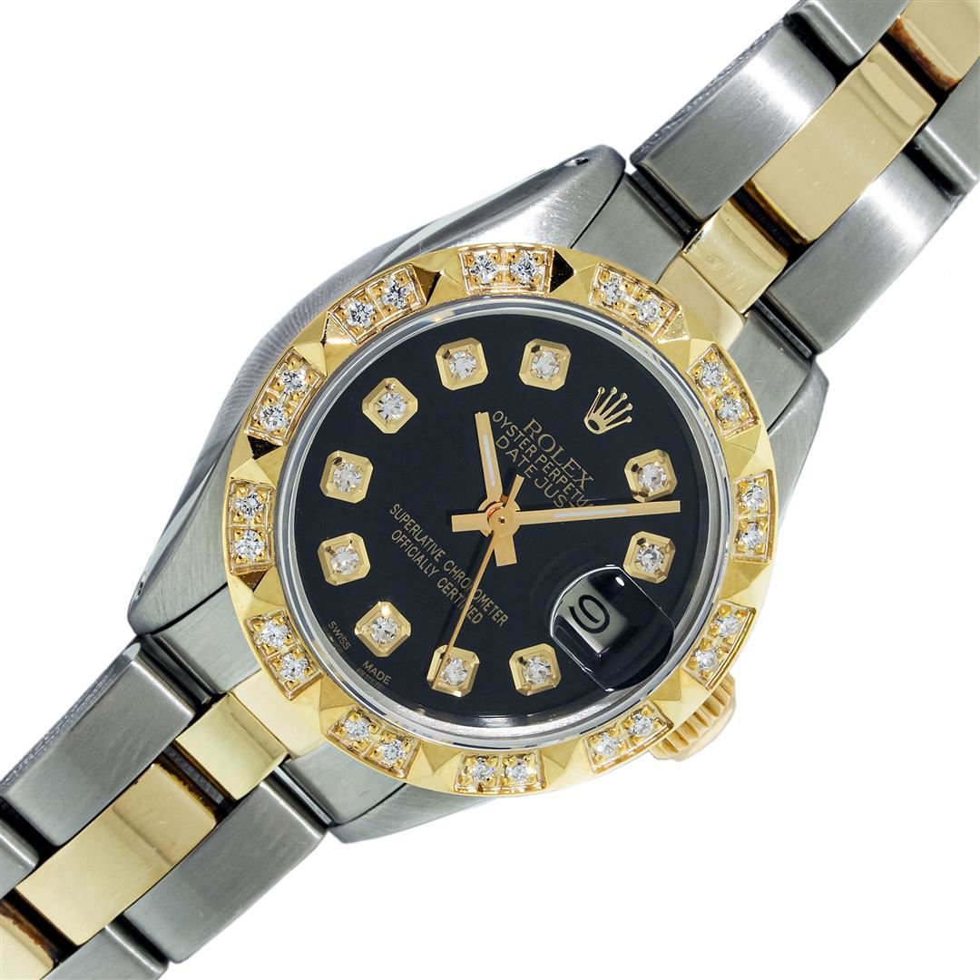 One Ladies Two Tone Rolex Datejust Polished, Serviced & Electronically Tested, Rolex Yellow Gold & Stainless Steel Case: 26mm, Rolex Yellow Gold Crown, Custom Bezel: New 18K Yellow Gold Diamond Bezel, Diamond Count: 24 Diamonds, Clarity: SI-VS, Color: G to H. Custom Crystal: New Sapphire With Magnified Date Window. Custom Hands: New Gold Hands. Rolex Movement: Automatic Winding Movement. Custom Dial: Refinished Black With Added Diamonds On Dial, Diamond Count: 10 Diamonds On Dial, G To H In Color, VS Clarity. Date Window: 3 O'clock Position Date Display, Model: Datejust, Condition: G-6 Extra Fine. Rolex Bracelet: Two Tone Yellow Gold & Stainless Steel Oyster Band. Bright Polish. 6.0 Inch Length, Adjustable. Standard Clasp, With Rolex Logo. This Pre Owned Watch Has Been Serviced Time Tested And Is In Excellent Condition It Is Free Of All Scratches And Dents.