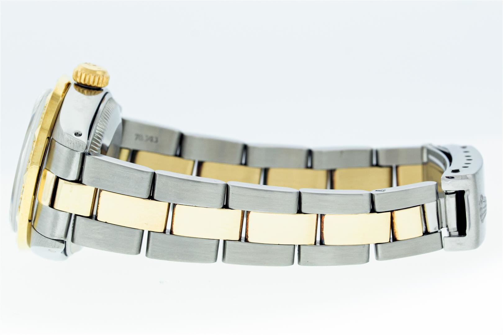 One Ladies Two Tone Rolex Datejust Polished, Serviced & Electronically Tested, Rolex Yellow Gold & Stainless Steel Case: 26mm, Rolex Yellow Gold Crown, Custom Bezel: New 18K Yellow Gold Diamond Bezel, Diamond Count: 24 Diamonds, Clarity: SI-VS, Color: G to H. Custom Crystal: New Sapphire With Magnified Date Window. Custom Hands: New Gold Hands. Rolex Movement: Automatic Winding Movement. Custom Dial: Refinished Black With Added Diamonds On Dial, Diamond Count: 10 Diamonds On Dial, G To H In Color, VS Clarity. Date Window: 3 O'clock Position Date Display, Model: Datejust, Condition: G-6 Extra Fine. Rolex Bracelet: Two Tone Yellow Gold & Stainless Steel Oyster Band. Bright Polish. 6.0 Inch Length, Adjustable. Standard Clasp, With Rolex Logo. This Pre Owned Watch Has Been Serviced Time Tested And Is In Excellent Condition It Is Free Of All Scratches And Dents.