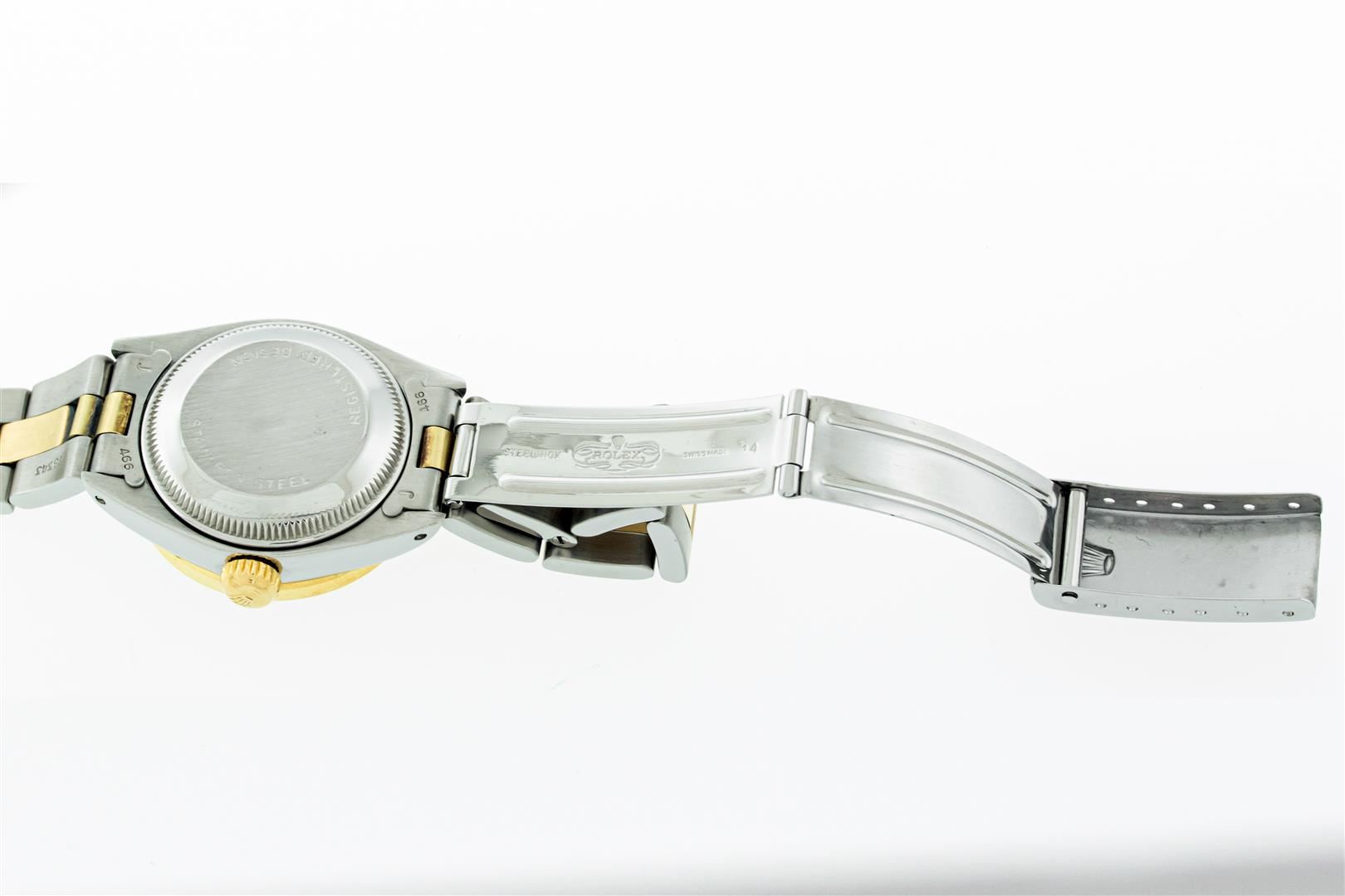 One Ladies Two Tone Rolex Datejust Polished, Serviced & Electronically Tested, Rolex Yellow Gold & Stainless Steel Case: 26mm, Rolex Yellow Gold Crown, Custom Bezel: New 18K Yellow Gold Diamond Bezel, Diamond Count: 24 Diamonds, Clarity: SI-VS, Color: G to H. Custom Crystal: New Sapphire With Magnified Date Window. Custom Hands: New Gold Hands. Rolex Movement: Automatic Winding Movement. Custom Dial: Refinished Black With Added Diamonds On Dial, Diamond Count: 10 Diamonds On Dial, G To H In Color, VS Clarity. Date Window: 3 O'clock Position Date Display, Model: Datejust, Condition: G-6 Extra Fine. Rolex Bracelet: Two Tone Yellow Gold & Stainless Steel Oyster Band. Bright Polish. 6.0 Inch Length, Adjustable. Standard Clasp, With Rolex Logo. This Pre Owned Watch Has Been Serviced Time Tested And Is In Excellent Condition It Is Free Of All Scratches And Dents.