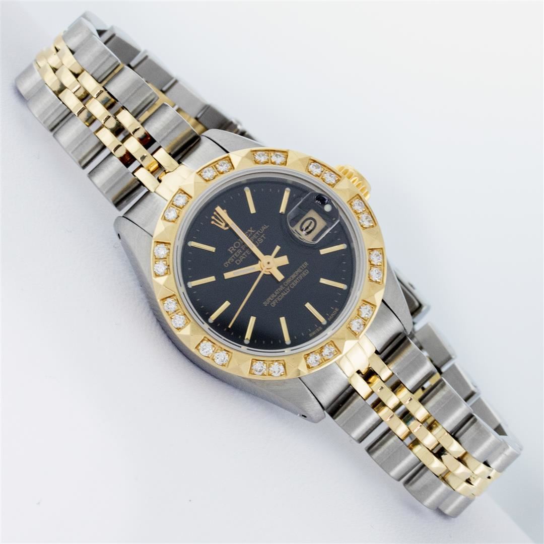 One Ladies Pre Owned Rolex Two Tone Rolex Oyster Perpetual Datejust Polished, Serviced & Electronically Tested, Rolex Yellow Gold & Stainless Steel Case: 26mm, Rolex Yellow Gold Crown, Custom Bezel: New 18K Yellow Gold Pyramid Diamond Bezel, Diamond Count: 24 Diamonds In Bezel. Total Weight .50 Carat, Clarity: SI-VS, Color: G to H. Custom Crystal: New Synthetic Sapphire Cyclops Lens. Custom Hands: New Luminescent Hands. Rolex Movement: Automatic Winding Movement. Custom Dial: Black Index With Dash Track & Lumi Dots. Date Window: 3 O'Clock Position Date Display, Model: Datejust. Condition: G-6 Extra Fine. Rolex Bracelet: Two Tone Yellow Gold & Stainless Steel Jubilee Band. Bright Polish. 6.0 Inch Length, Adjustable. Standard Clasp, With Rolex Logo. This Watch Has Been Serviced Time Tested And Is In Excellent Condition It Is Free Of All Scratches And Dents.
