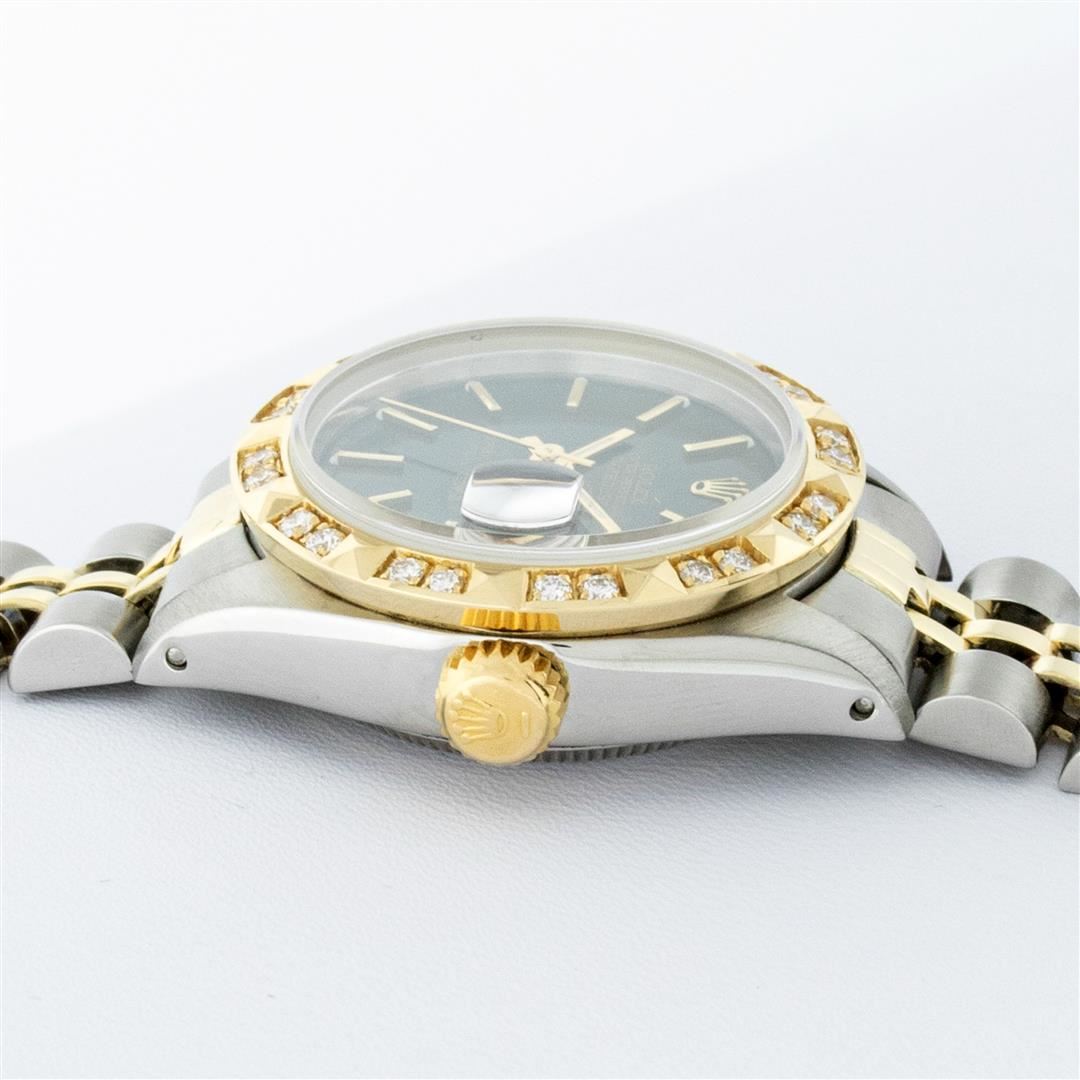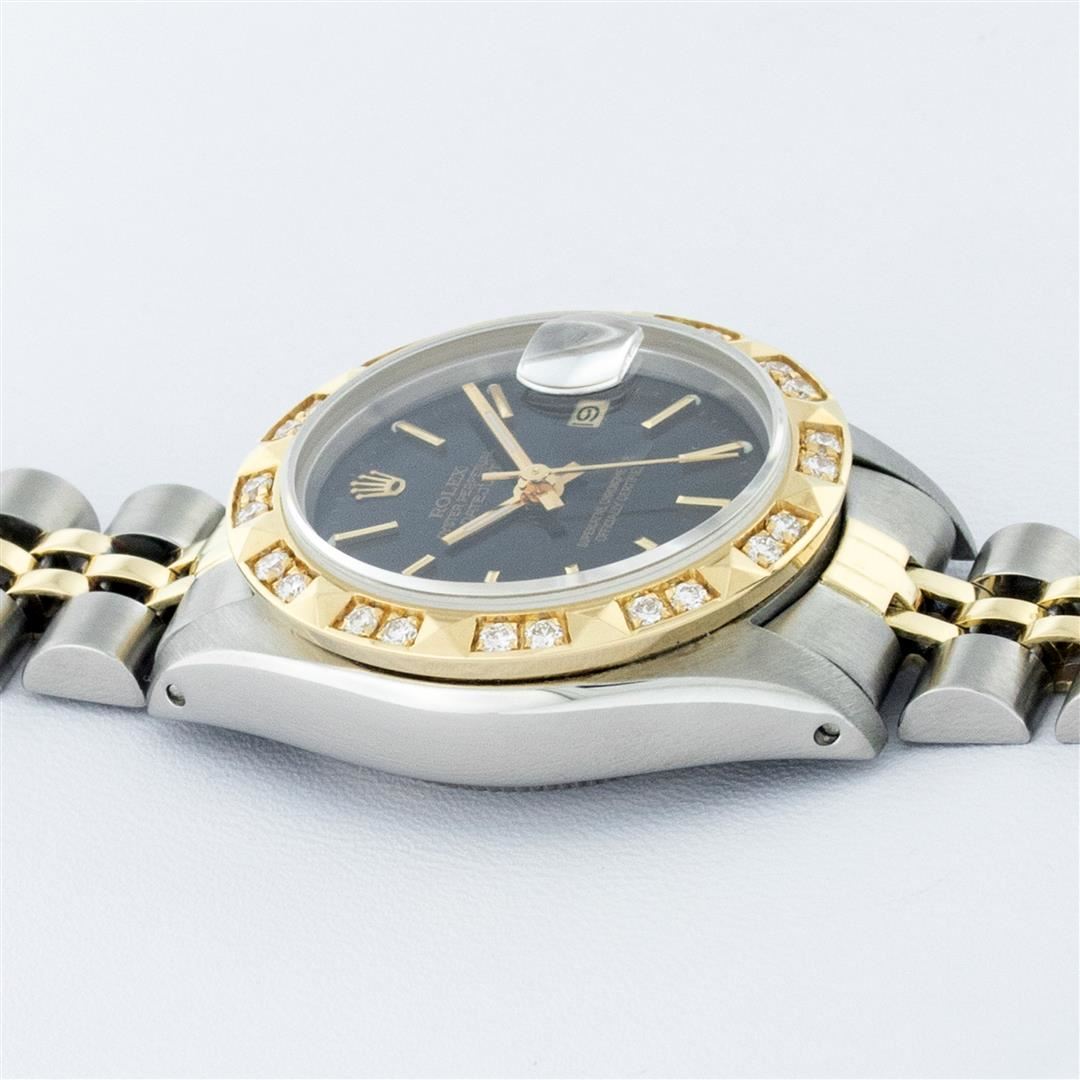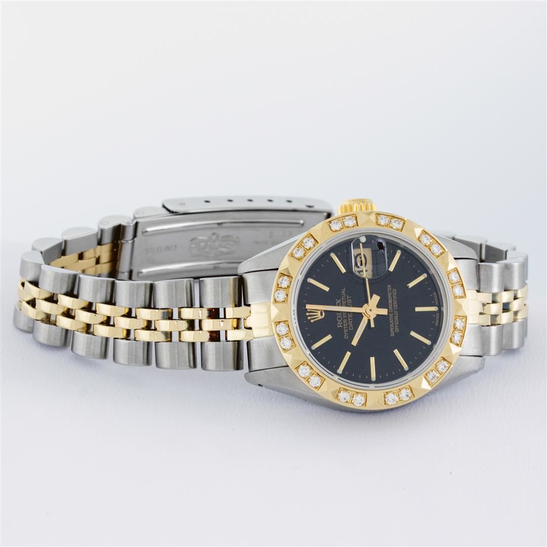 One Ladies Pre Owned Rolex Two Tone Rolex Oyster Perpetual Datejust Polished, Serviced & Electronically Tested, Rolex Yellow Gold & Stainless Steel Case: 26mm, Rolex Yellow Gold Crown, Custom Bezel: New 18K Yellow Gold Pyramid Diamond Bezel, Diamond Count: 24 Diamonds In Bezel. Total Weight .50 Carat, Clarity: SI-VS, Color: G to H. Custom Crystal: New Synthetic Sapphire Cyclops Lens. Custom Hands: New Luminescent Hands. Rolex Movement: Automatic Winding Movement. Custom Dial: Black Index With Dash Track & Lumi Dots. Date Window: 3 O'Clock Position Date Display, Model: Datejust. Condition: G-6 Extra Fine. Rolex Bracelet: Two Tone Yellow Gold & Stainless Steel Jubilee Band. Bright Polish. 6.0 Inch Length, Adjustable. Standard Clasp, With Rolex Logo. This Watch Has Been Serviced Time Tested And Is In Excellent Condition It Is Free Of All Scratches And Dents.