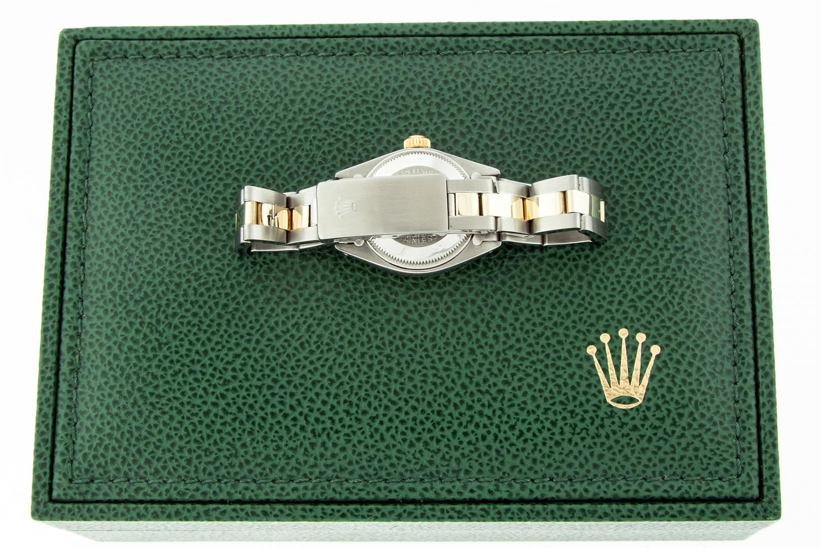 One Ladies Pre Owned Two Tone Yellow Gold And Stainless Steel Rolex Datejust Polished, Serviced & Electronically Tested, Rolex Yellow Gold & Stainless Steel Case: 26mm, Rolex Yellow Gold Crown, Rolex Bezel: Yellow Gold Fluted Bezel. Custom Crystal: New Acrylic With Magnified Date Window. Custom Hands: New Luminescent Hands. Rolex Movement: Automatic Winding Movement. Custom Dial: Refinished To Black With Added Diamonds, Diamond Count: 10 Single Cut Diamonds, Color: G to H, Clarity: VS. Date Window: 3 O'clock Position Date Display, Model: Datejust. Condition: G-6 Extra Fine. Rolex Bracelet: Two Tone Yellow Gold & Stainless Steel Oyster Band. Bright Polish. 6.0 Inch Length, Adjustable. Standard Clasp, With Rolex Logo. This Pre Owned Watch Has Been Serviced Time Tested And Is In Excellent Condition It Is Free Of All Scratches And Dents.